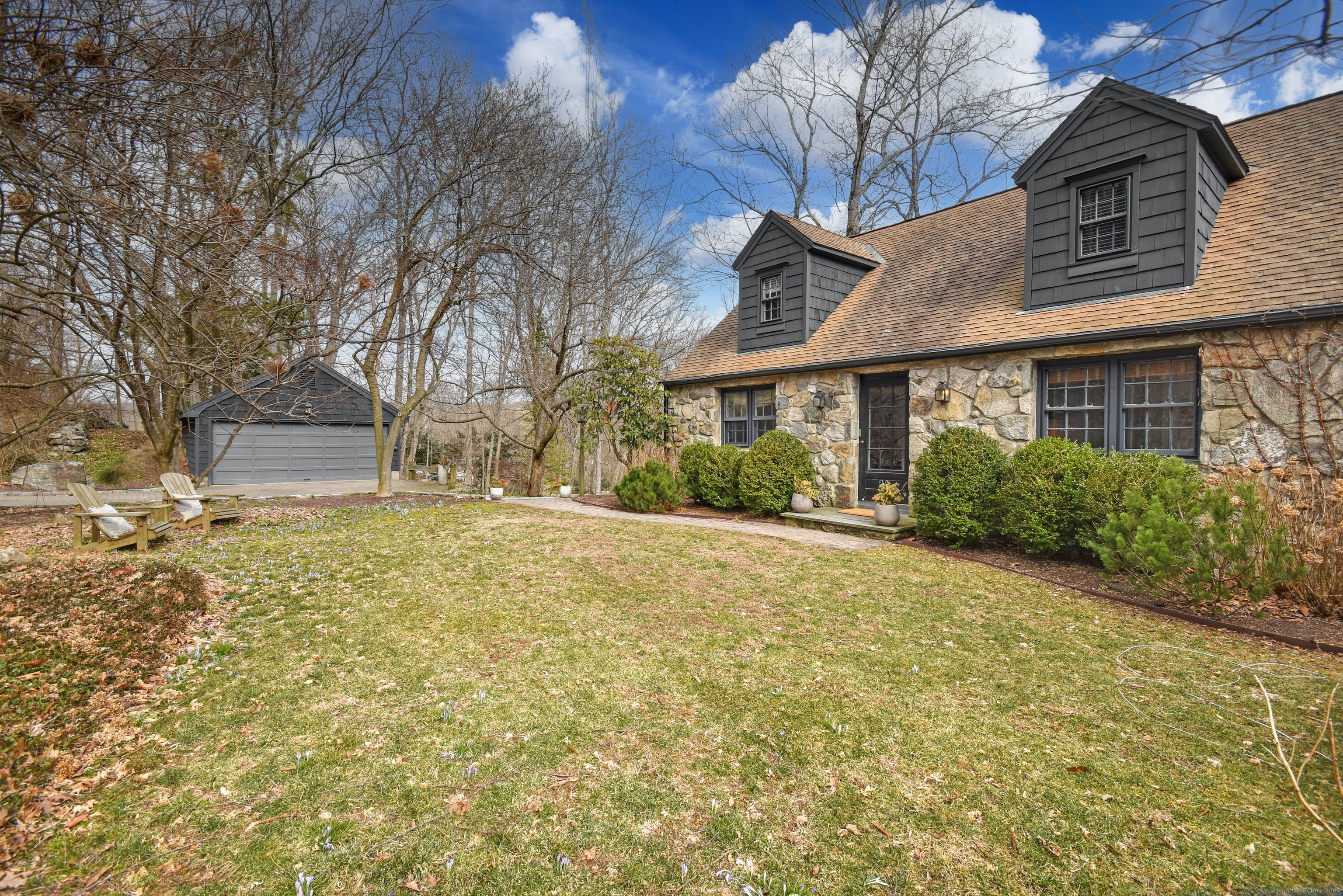 Picture perfect story book stone and shingle cape with charming interior stone walls located on historic road in the heart of Lower Weston. Stunning, newly renovated Kitchen with honed marble countertops, island, breakfast bar and wood beams that opens to a lovely Sun Room that would make a fabulous play room, sitting room, or extra office. The Family Room and Dining Room are inviting with the warm hardwood floors, rich wood beams and stone walls that are a theme throughout much of this home. A generously sized living room has a welcoming wood burning fireplace with a stone surround and tons of built ins. A newly created combination butler pantry/office with honed marble countertops, sink, wine cooler, and built in desk area is a fabulous addition. On the main floor are two bedrooms with a shared full bathroom with tub/shower combination. The second floor has a terrific, ensuite Primary Bedroom with a walk in closet, extra closet space and newly renovated full bathroom with double sinks, marble counter tops and jacuzzi/shower combination. Also on this floor is an additional bedroom and a full bathroom with a shower. A spacious detached two car garage provides parking as well as additional storage. The bluestone patio provides the perfect vantage point for viewing this pretty and private backyard.