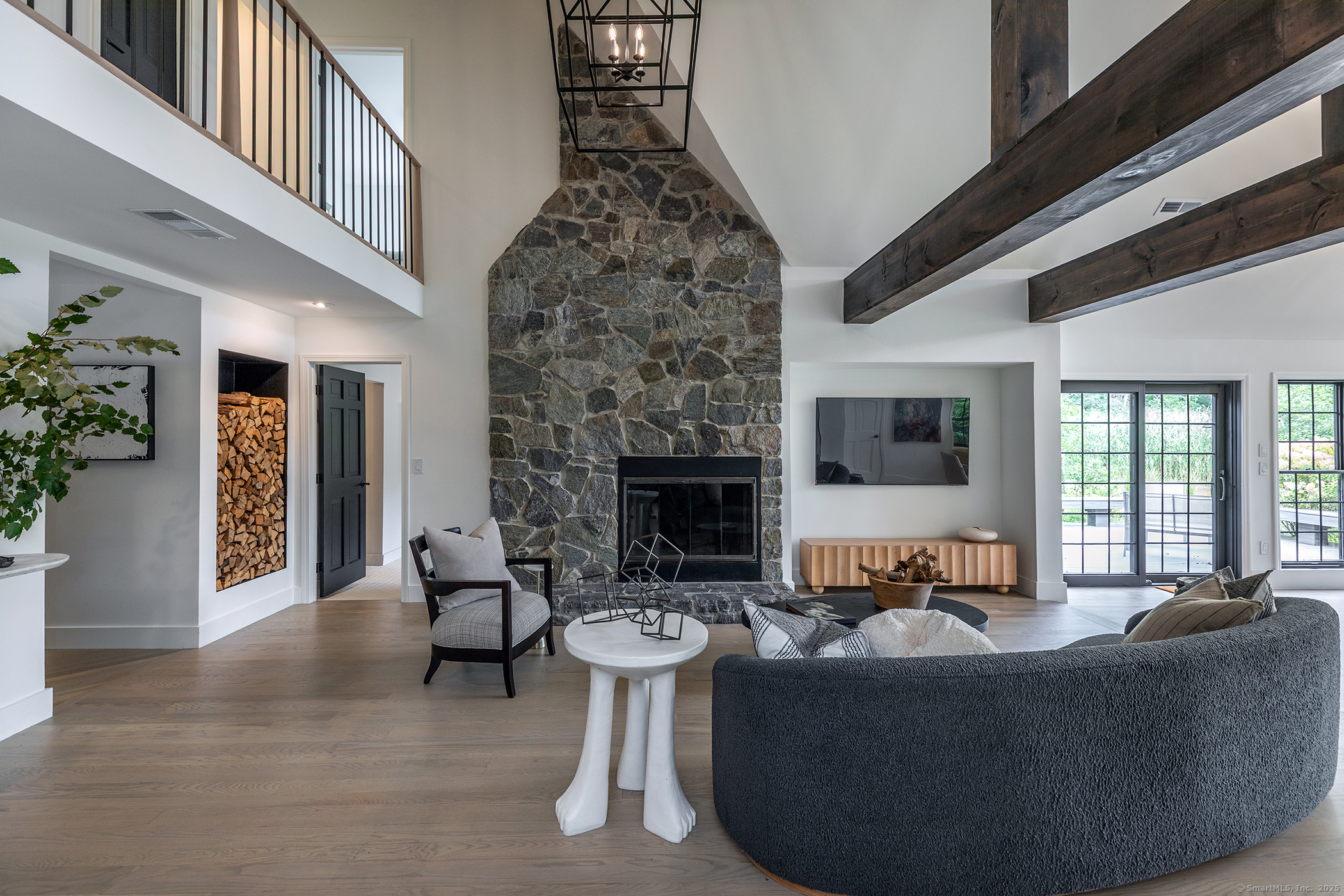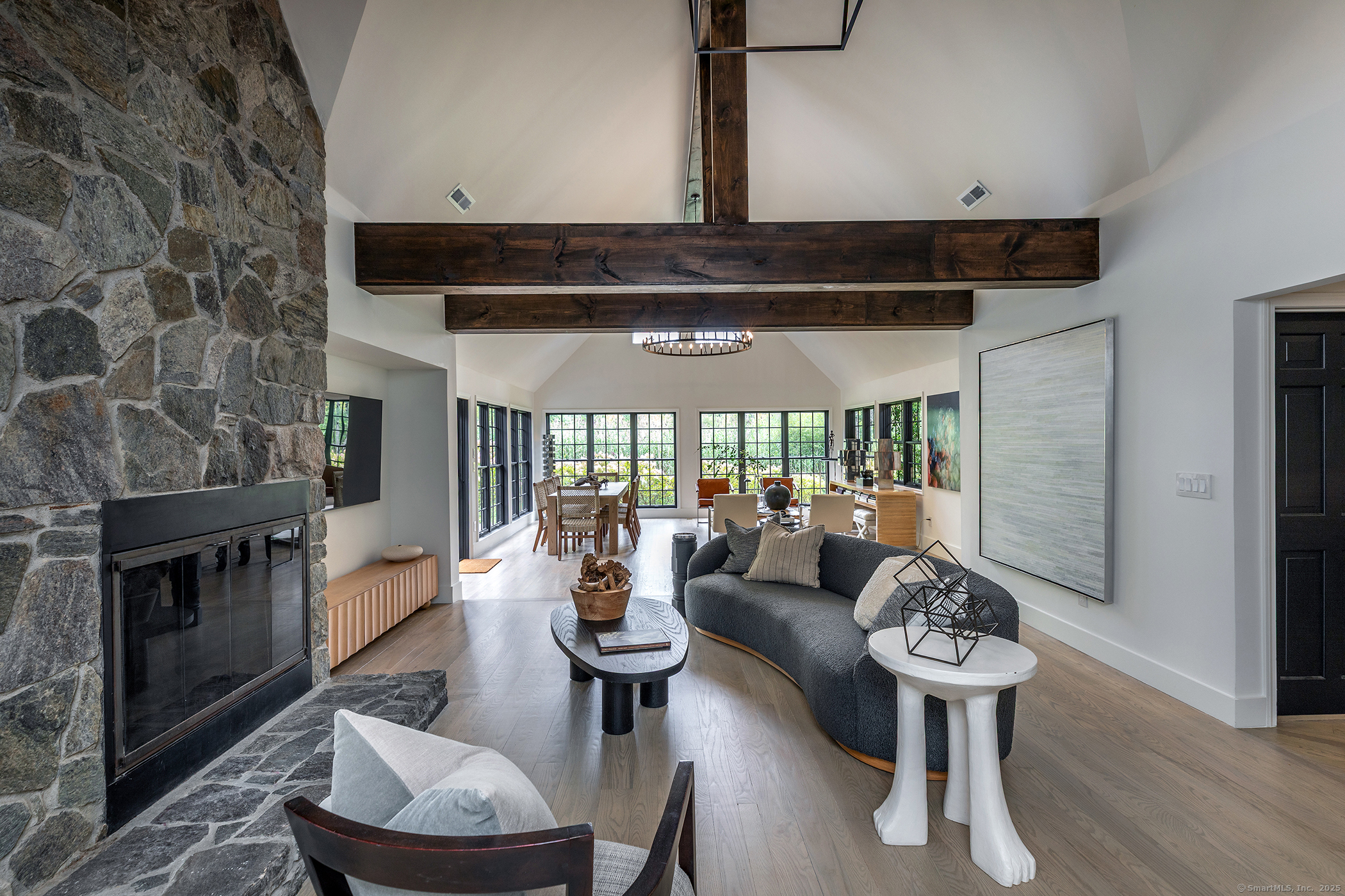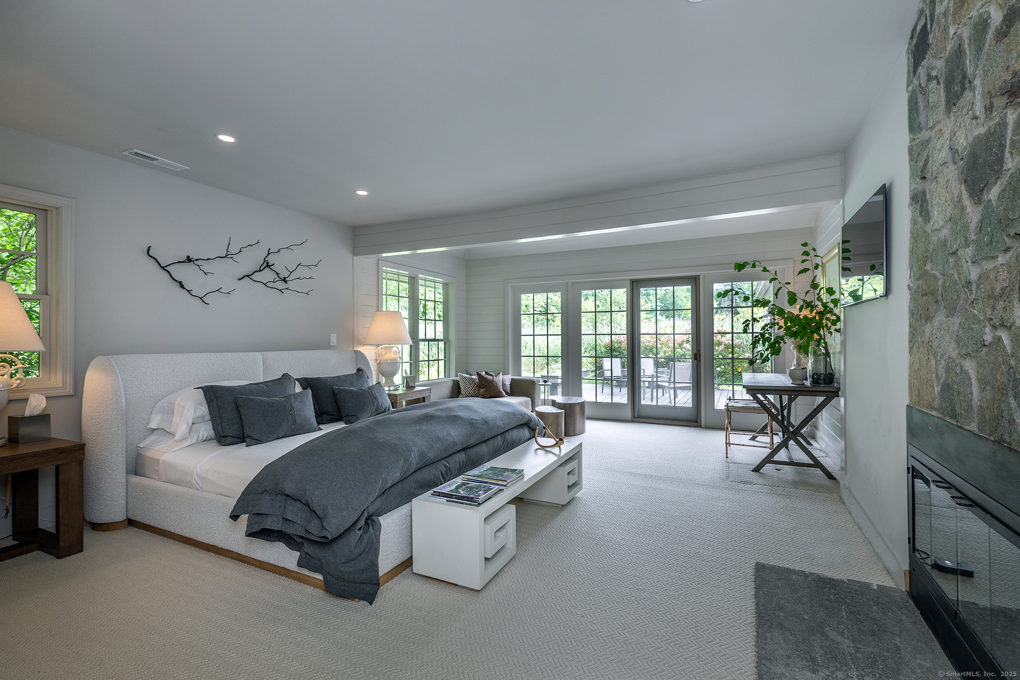 Contemporary elegance on one of Sharon's most prestigious addresses. A classic pea stone driveway leads to this newly renovated and glamorous 3 BDR/3+ Bath country home in a stunning natural setting with interiors designed by the NY-based firm Majordomo Lifestyle Architecture. Sleek sophistication abounds with gracious vaulted ceilings in the living room, anchored by a striking stone fireplace. The living room flows seamlessly into an expanded sunroom bathed in natural light - perfect for intimate dinners and grand entertaining with access to the patio. The updated eat-in kitchen serves as the heart of this modern masterpiece, with top of the line appliances and ample storage. Luxurious accommodations include an enlarged en-suite Primary BDR with fireplace on the main floor and access to the patio, and 2 spacious en suite bedrooms upstairs. Every space has been thoughtfully renovated to blend contemporary comfort with timeless charm. 2-car detached garage/barn offers extraordinary storage/work/studio spaces. Herrick Road places you at one of the finest locations in Sharon known for its exceptional estates and natural beauty. This home is a lifestyle statement in one of Litchfield County's most desirable communities. Enjoy this idyllic setting where cattails whisper in the breeze and privacy reigns supreme. Private schools nearby: (Hotchkiss, Kent School, Salisbury School, Millbrook School), skiing at Mohawk and Catamount, Sharon Playhouse, and Audubon. 2 hours to NYC.