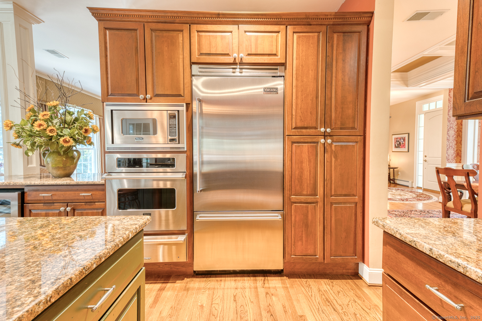 Magnificent custom-built home by Santini Builders showcasing superior craftsmanship and over 5,000 sqft of living space. The welcoming covered porch opens to a grand foyer with direct views of the formal living room featuring 10ft ceilings, gas fireplace, and custom built-ins. A formal dining room with coffered ceiling, crown molding, wainscoting, and gleaming hardwood floors creates an elegant setting. The gourmet kitchen is equipped with high-end appliances including Viking refrigerator, oven with warming drawer and Microwave, GE gas range with downdraft, wine cooler, and custom rollout cabinetry. The 3-season sunroom and grilling deck provide perfect spaces to relax. The main-level primary suite offers a tray ceiling, custom walk-in closet, and spa-like bath with soaking tub, shower, and dual vanities. Upstairs has two elegant bedrooms with 9ft ceilings & full bath which compliment the home. Access to an unfinished attic could easily be finished. The custom built walkout lower level boasts floor-to-ceiling windows, full wet bar, media built-ins, half bath, and two soundproof ensuite bedrooms ech with full baths. French doors lead to a patio overlooking a serene professionally landscaped 1.47-acre private lot. Ideally equipped with a new gas heating system (2022), dual AC units (2023), whole-house generator, irrigation system, central vac, and 3-car garage. Conveniently located near Ellington Ridge Country Club. Come see this amazing home with all the amenities you need.