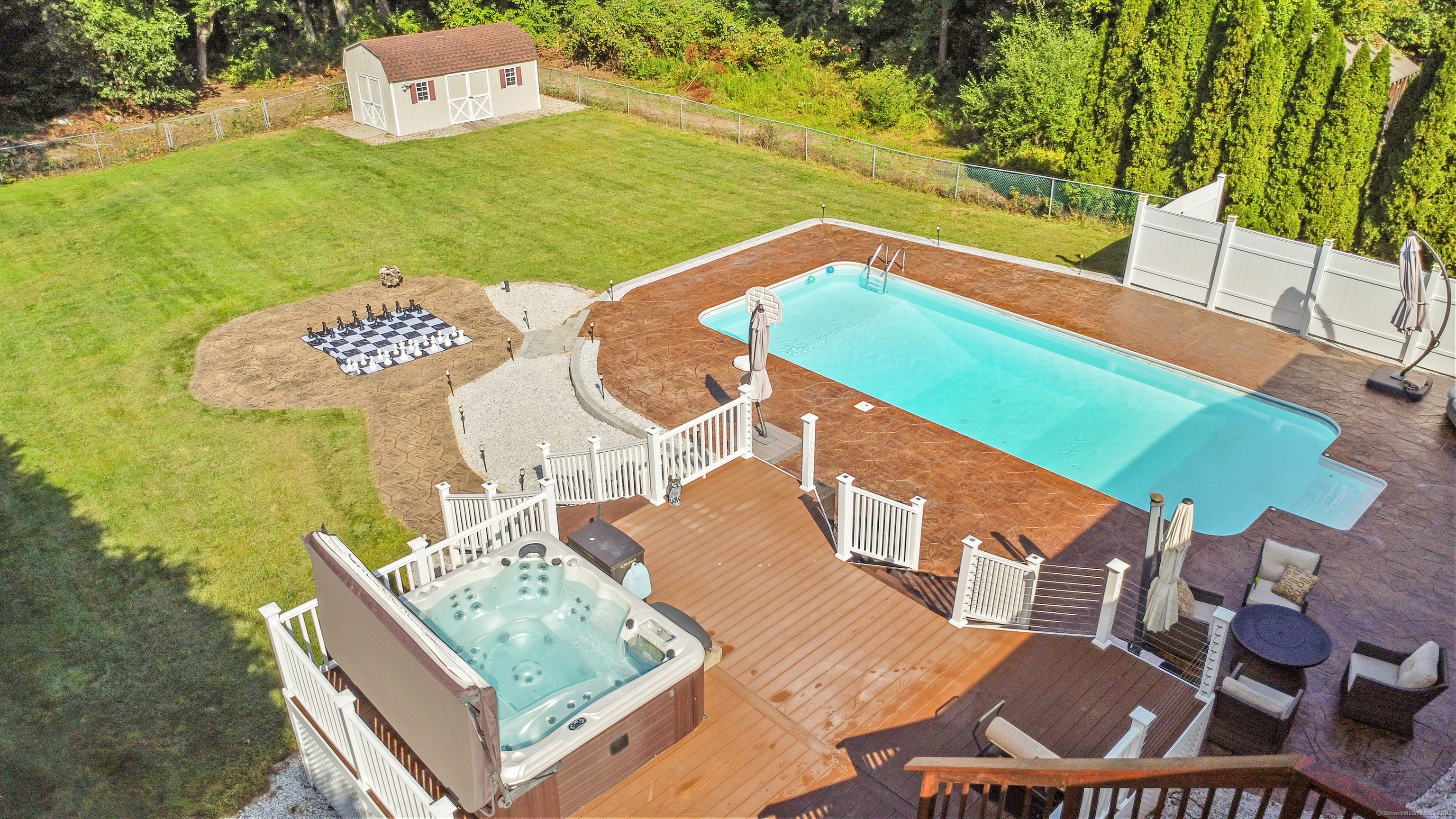 Welcome home! This beautifully maintained Raised Ranch offers the perfect blend of comfort, style, and outdoor luxury. When you step outside, prepare to be wowed! A two-tiered deck overlooks a fully fenced-in, expansive backyard designed for pure enjoyment. Take a dip in the heated in-ground saltwater pool, unwind in the hot tub, or host unforgettable gatherings on the stamped concrete pool deck with granite curb detailing. Granite steps lead down to a serene lower patio area, offering even more space to relax or entertain. The home features an eat-in kitchen with granite counters and high end stainless steel appliances. The kitchen is ideal for entertaining, with plenty of space for family and friends to gather. The spacious living room is a true showstopper with recessed lighting and a cozy wood-burning fireplace w/ an elegant marble surround-perfect for relaxing nights in. The primary bedroom suite is your private retreat and gets plenty of natural light. An additional two bedrooms and an updated full bathroom round out the main living area. Downstairs, the large lower level has been freshly updated with brand-new wall-to-wall carpeting-perfect for a family room or play space. The 2-car garage provides ample storage space and functionality. Don't miss your chance to own this move-in ready gem that checks all the boxes for indoor comfort and exceptional outdoor living. Schedule your private showing today!
