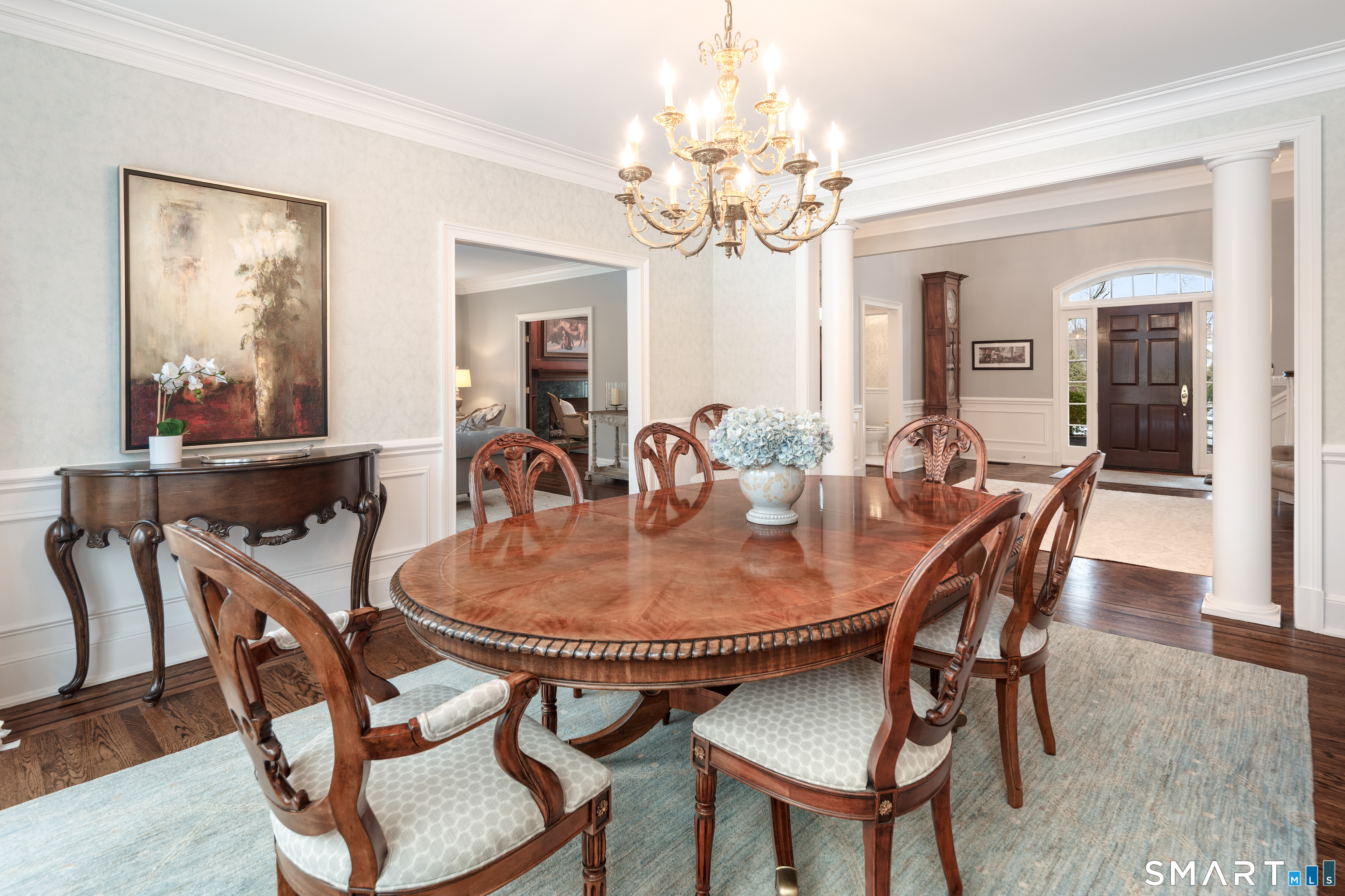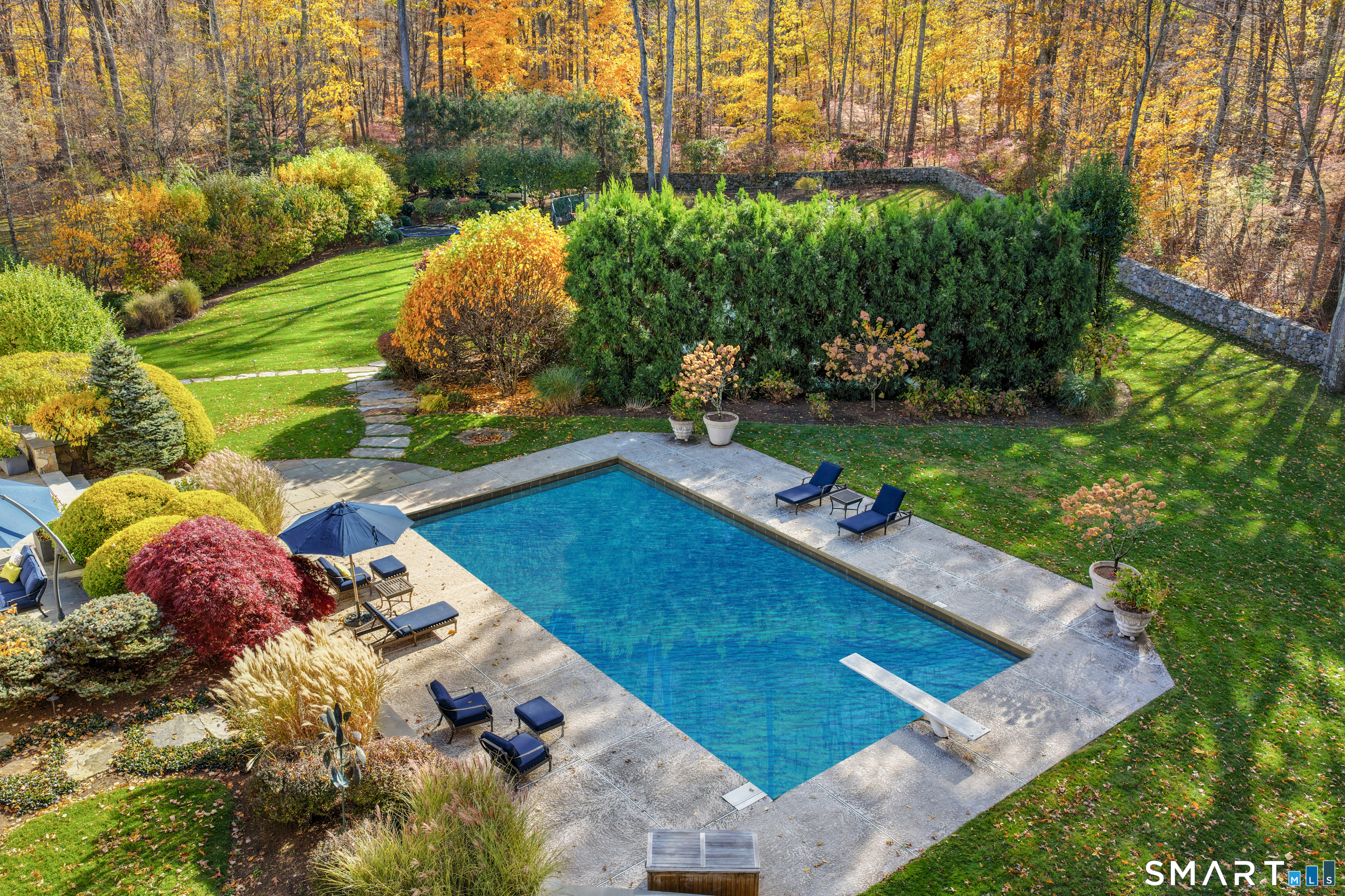 Your Private Five-Star Resort in New Canaan: Experience the pinnacle of luxury at this 2-acre custom estate, where "vacationing at home" is your daily reality. Tucked behind commanding stone columns near the vibrant town center, this park-like sanctuary is framed by gorgeous stone walls and lush, professional landscaping and sited on a quiet cul-de-sac. The sun filled open-concept interior boasts 9'+ and vaulted ceilings, extensive millwork and gleaming hardwood floors, anchored by four fireplaces that radiate warmth and sophistication. At the heart of the home lies a breathtaking chef's kitchen featuring a legendary island with enough room for a large gathering and a dreamy walk-in pantry. The formal living room with gas fireplace and formal dining room with butler's pantry offer an easy flow for entertaining. With 5 bedrooms, 6.5 baths, a stately library and two additional offices, there is unparalleled space for both high-stakes productivity and total relaxation. The lifestyle continues outdoors with a sparkling pool and a private sports/tennis/pickleball court designed for endless summer afternoons. Whether hosting a grand gala or retreating to your private oasis, this property offers a seamless blend of modern elegance with New England charm.
