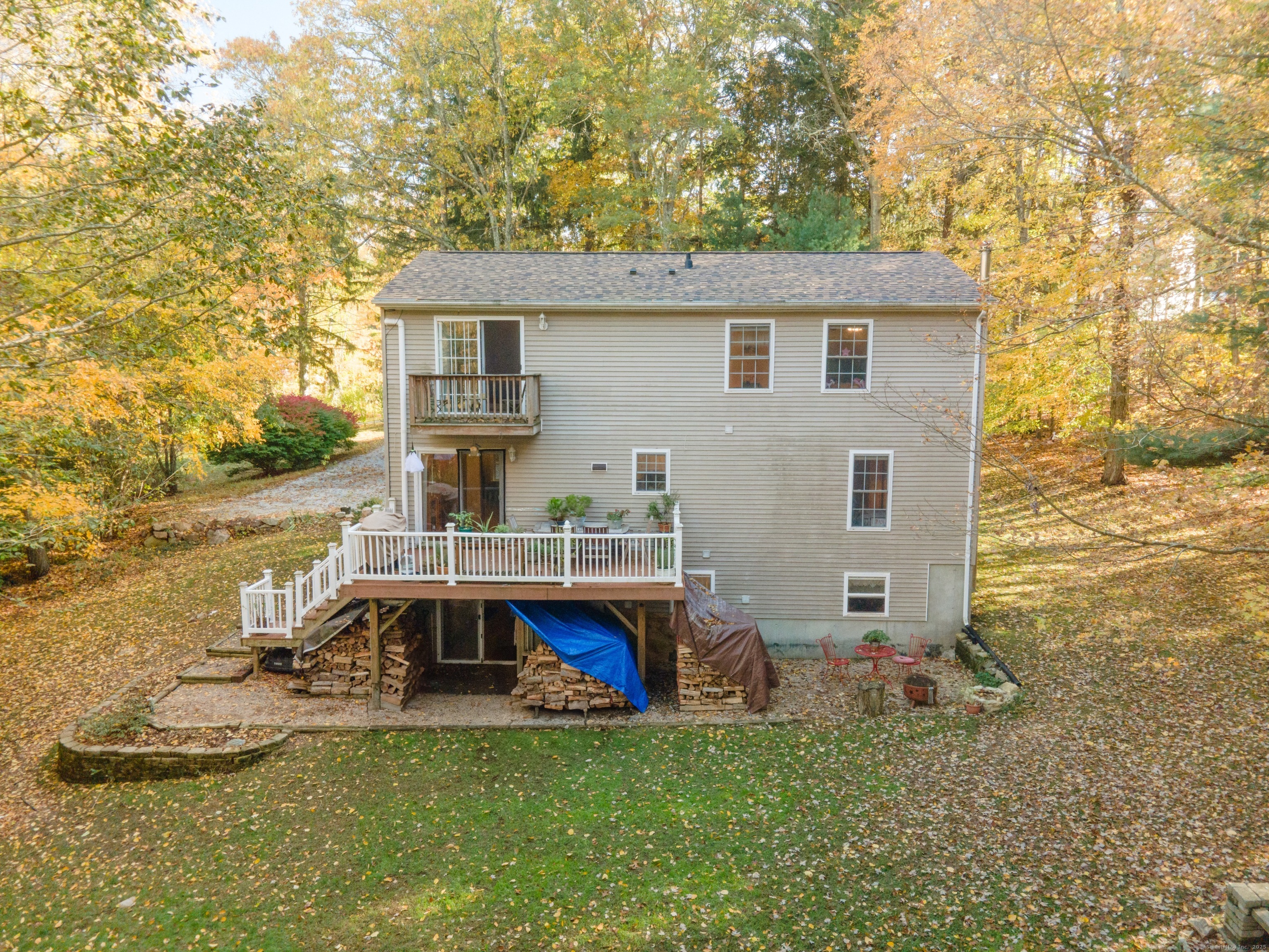 Not your average cape! Nestled on a picturesque rear lot and set back from the road for ultimate privacy, this warm and inviting Cape Cod home offers the perfect blend of comfort, charm, and space across nearly 5 private acres. Featuring 4 bedrooms and 3 full baths-including two bedrooms on the main level and two large bedrooms upstairs-you'll love the convenience of a full bathroom on each level. The kitchen offers a great layout with Corian countertops and newer appliances, while central air keeps the home cool all summer long. For the winter months, the propane fireplace insert provides a cost-effective way to heat the main floor. Step outside onto the low-maintenance Trex deck, or enjoy your morning coffee on the private balcony just off the primary suite. The oversized jetted tub in the primary bathroom is the perfect place to unwind. The partially finished lower level offers flexibility with a family room, bonus space, laundry, and an additional full bathroom-ideal for guests, movie nights, or a playroom. Outdoors, the expansive property gives you plenty of room to explore, complete with a large shed with electricity-perfect for storage or your next creative project. Enjoy evenings around the cozy firepit, soaking in the peaceful surroundings. Additional perks include a newer roof for peace of mind. This home truly delivers a sense of retreat while still being close to everything you need. Schedule your private showing today.