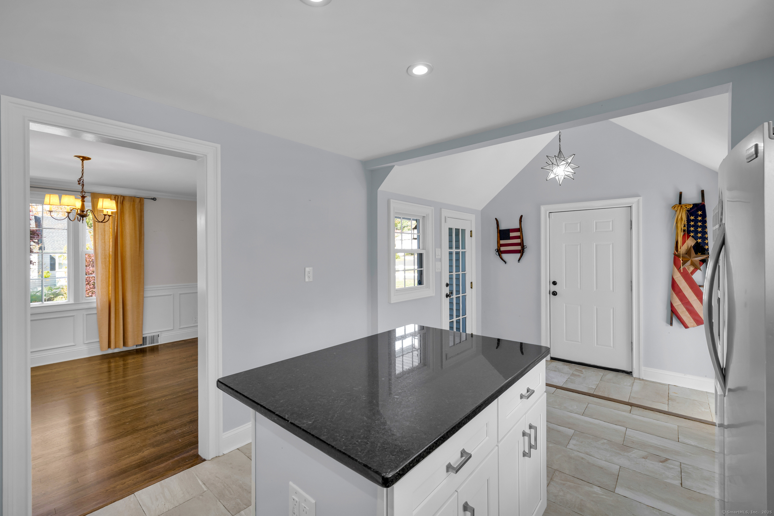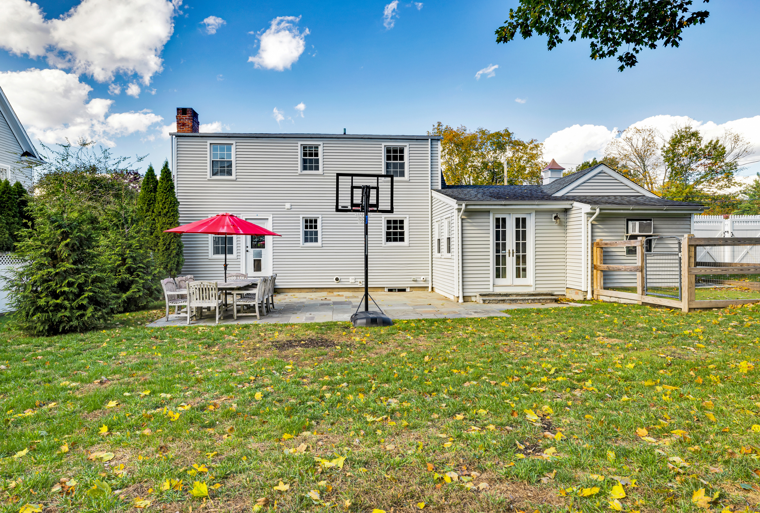 Discover this charming Cape full of character, ideally located on a quiet side street in the heart of Fairfield. A white picket fence and updated portico create storybook curb appeal that continues inside. The spacious living room centers around a fireplace and flows to a dining room with crown molding and a beautiful kitchen featuring black granite countertops, stainless steel appliances, a center island and a cathedral ceiling with exposed beams. Off the kitchen is a third bedroom or office with french doors leading to the fenced-in yard. Upstairs offers a primary bedroom, hall bath and second bedroom with hardwood floors throughout. The finished lower level adds living space plus a separate laundry and utility room. An additional space was created off of the garage for pets but can be used for storage. Enjoy secluded outdoor living with planters atop a stone wall and an extended bluestone patio.