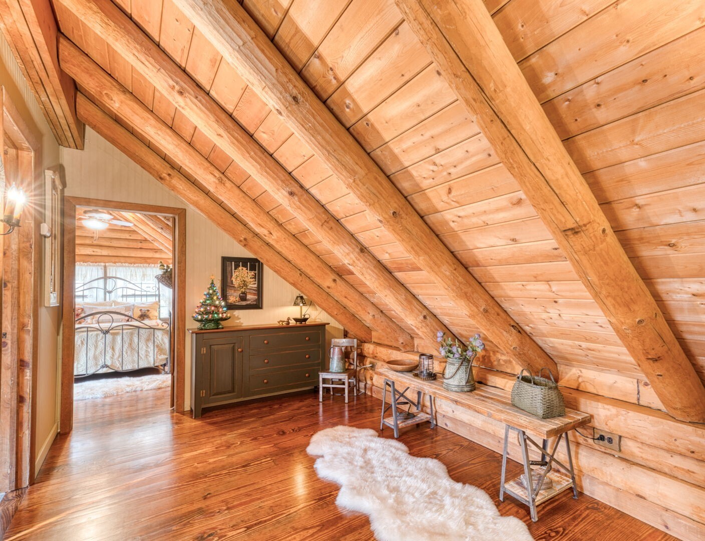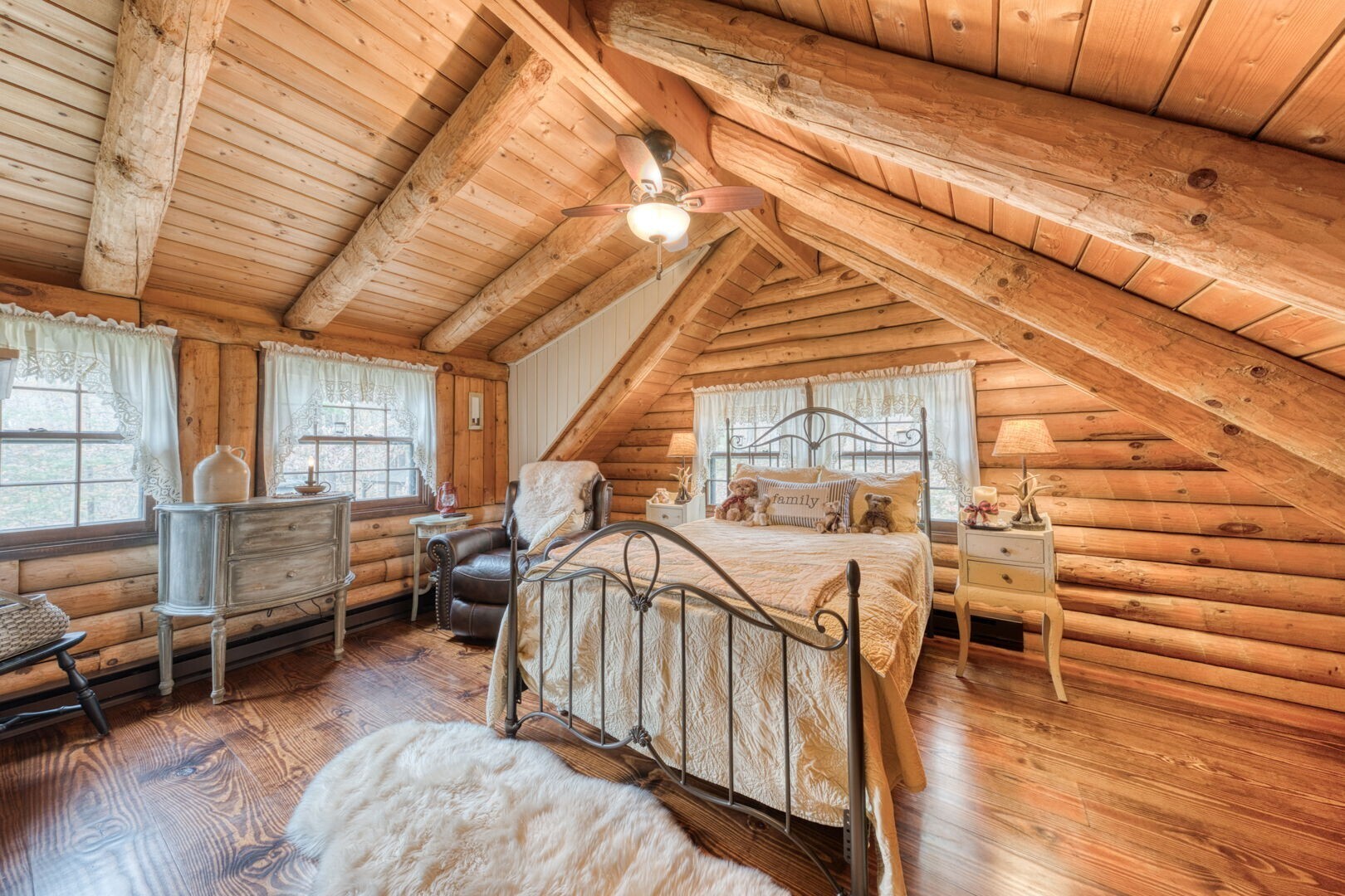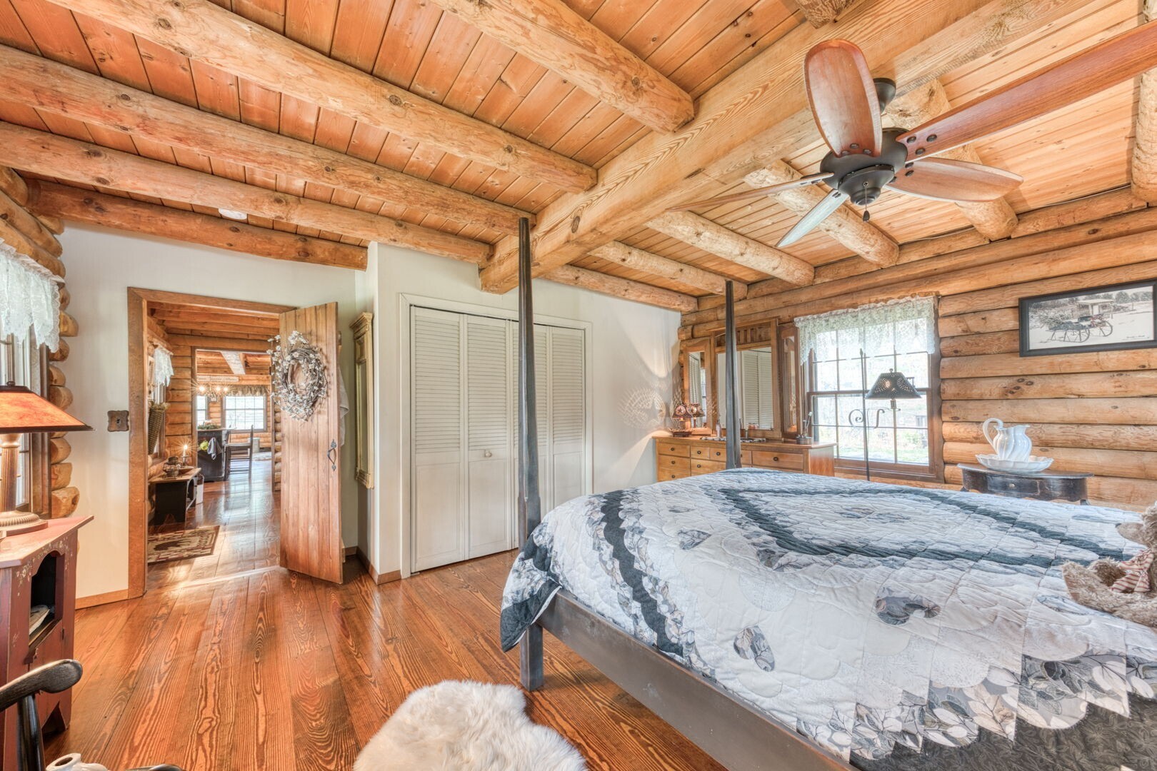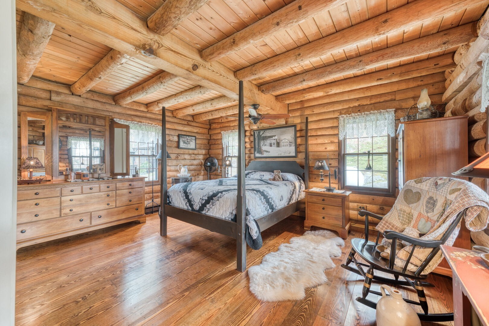 HIGHEST AND BEST BY 10:00 A.M. THURSDAY 11/13. Quintessential Log Home Retreat on Nearly 3 Acres! Welcome to this beautifully updated log home offering timeless charm and modern comfort. Featuring southern yellow pine flooring throughout, a striking center fireplace, and newly renovated bathrooms, this residence blends rustic elegance and custom touches, including hand-made interior railings using wood sourced directly from the property. The kitchen boasts granite countertops, a farmhouse sink, and ample cabinetry. Have your morning coffee by the warm glow of a propane stove, while taking in the natural setting just outside your window. Outside, you will find nearly 3 acres of gardens and beautiful stonewalls, a relaxing hot tub area, and covered porches with ceiling fans-perfect for year-round enjoyment. An adorable shed with a cupola and rooster weathervane adds character and utility. The property offers exceptional privacy and a soothing atmosphere, yet remains conveniently close to Rte 6 and 395. If you are seeking a peaceful escape, an ideal work- from- home spot or a place to launch all your outdoor recreational and gardening dreams, this home delivers tranquility, style, and convenience in one perfect package.