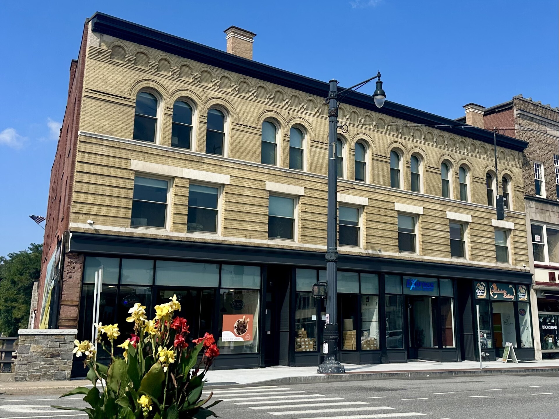 New Central AC and High Efficiency Apartments Available. This is one of the Largest with huge city views. End unit. Hardwood floors and brand new appliances. Closet space. Close to all yet far enough and private. City vibes with tons of light flowing from two directions in this completely renovated historic downtown building premiere apartment. Original woodwork restored, adaptive reuse of turn of the century doors and beadboard and completely new interior construction in this building. Listen to water flowing beside your windows. Unit features all new stainless appliances, new windows with window treatments with privacy shades, hardwood floors, vintage inspired tile bathrooms with walk in showers with pressure adjustments and handheld. Efficient HVAC split units for summer AIR CONDITIONING /winter heat comfort, LED lighting for low electric bills, ceiling fans, tons of closet and storage space for easy carefree living. Come and go, travel more, or work from home! In house coin-op laundry machines on same floor, 24 hr video surveillance and convenient secure parking next door in city lot for approx.. $14 a month.nd wide open concept.