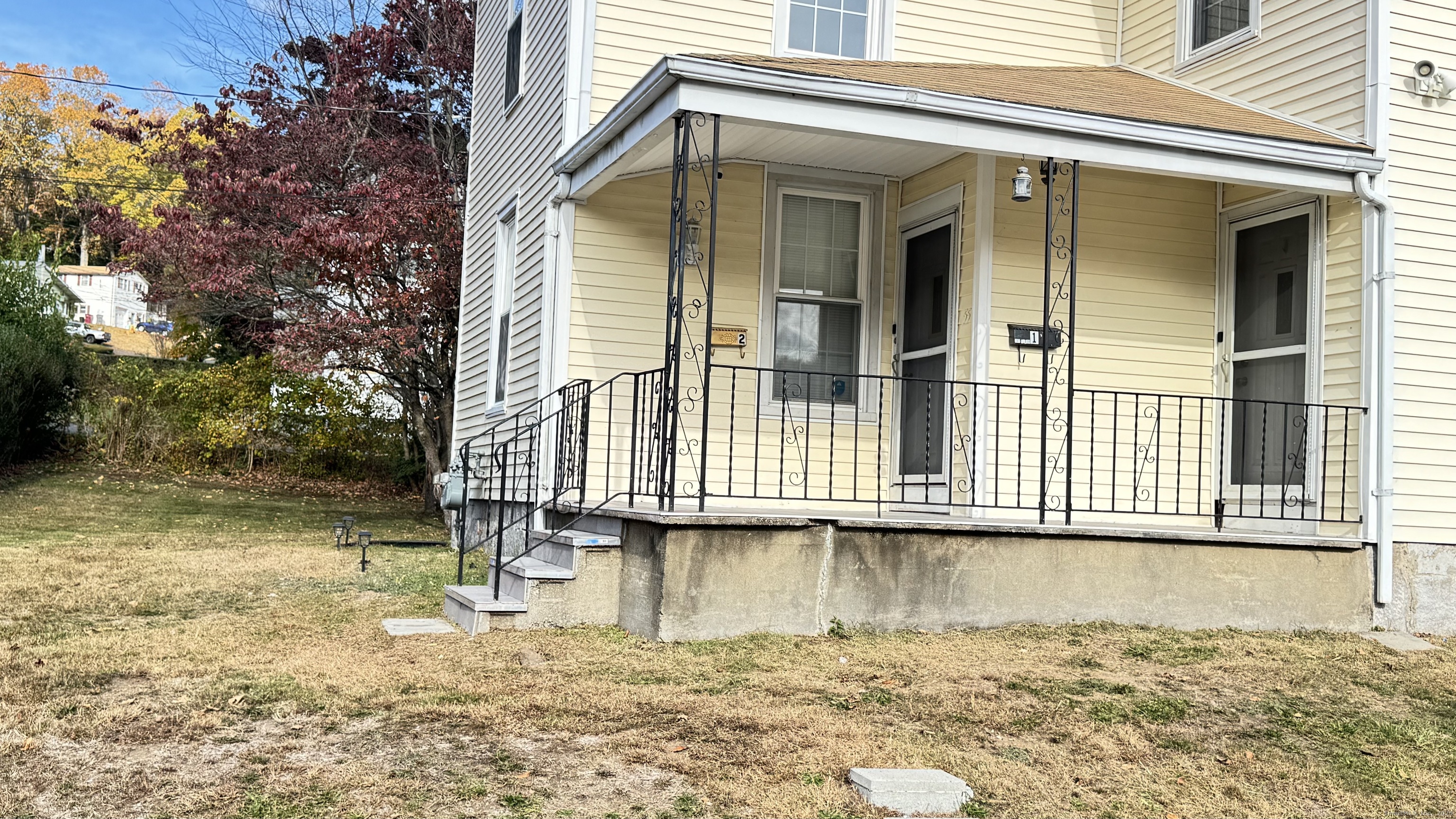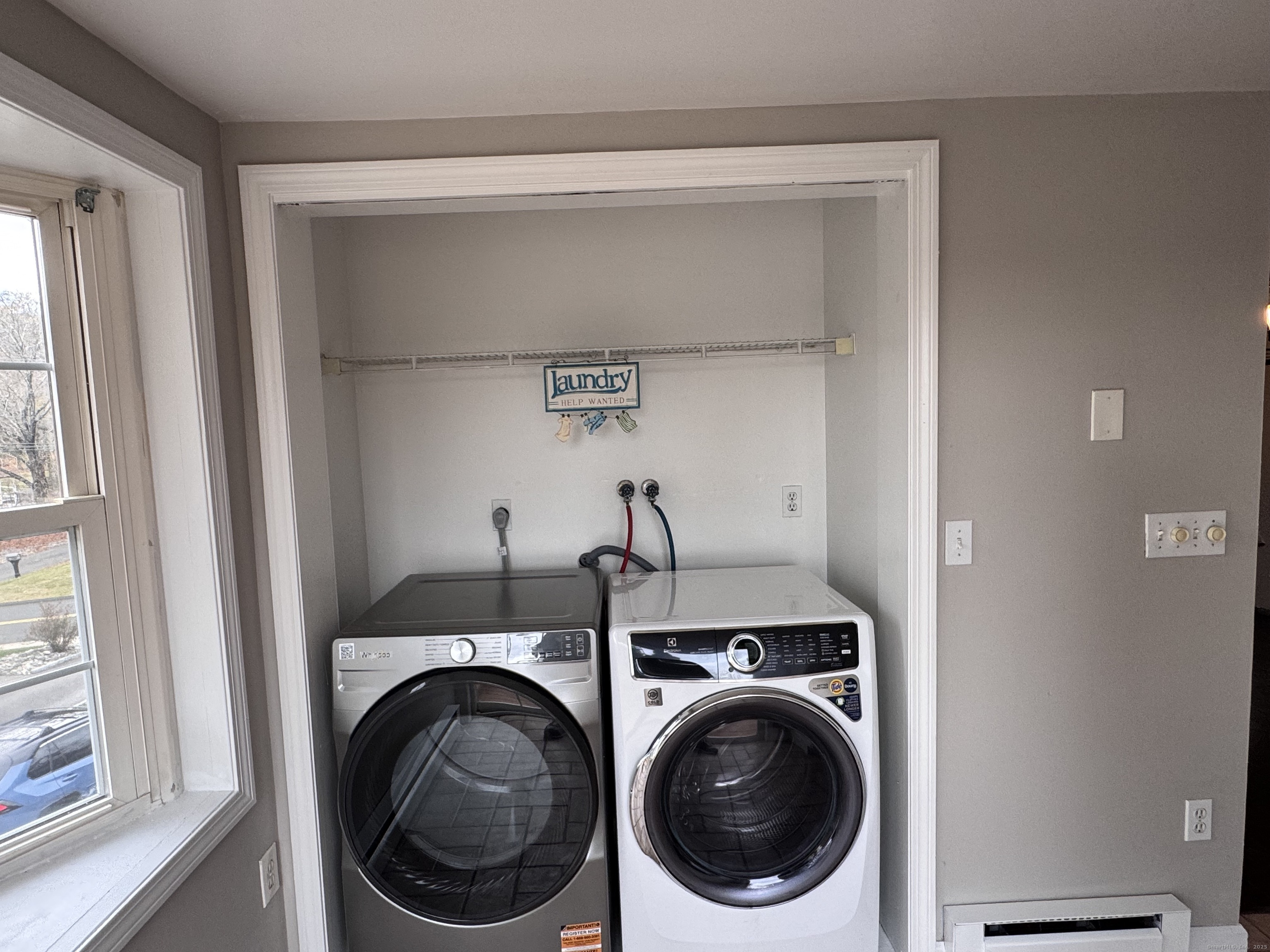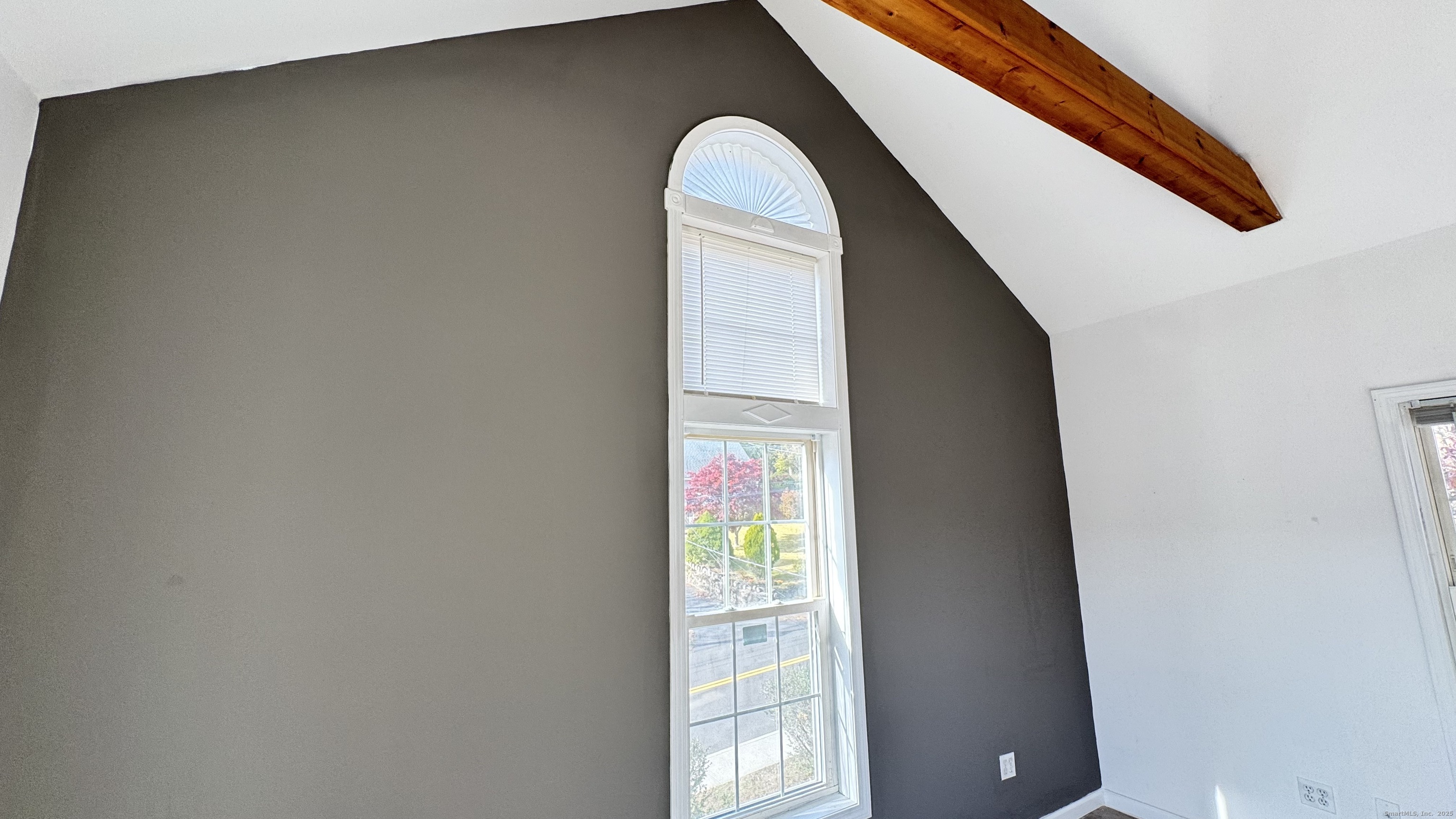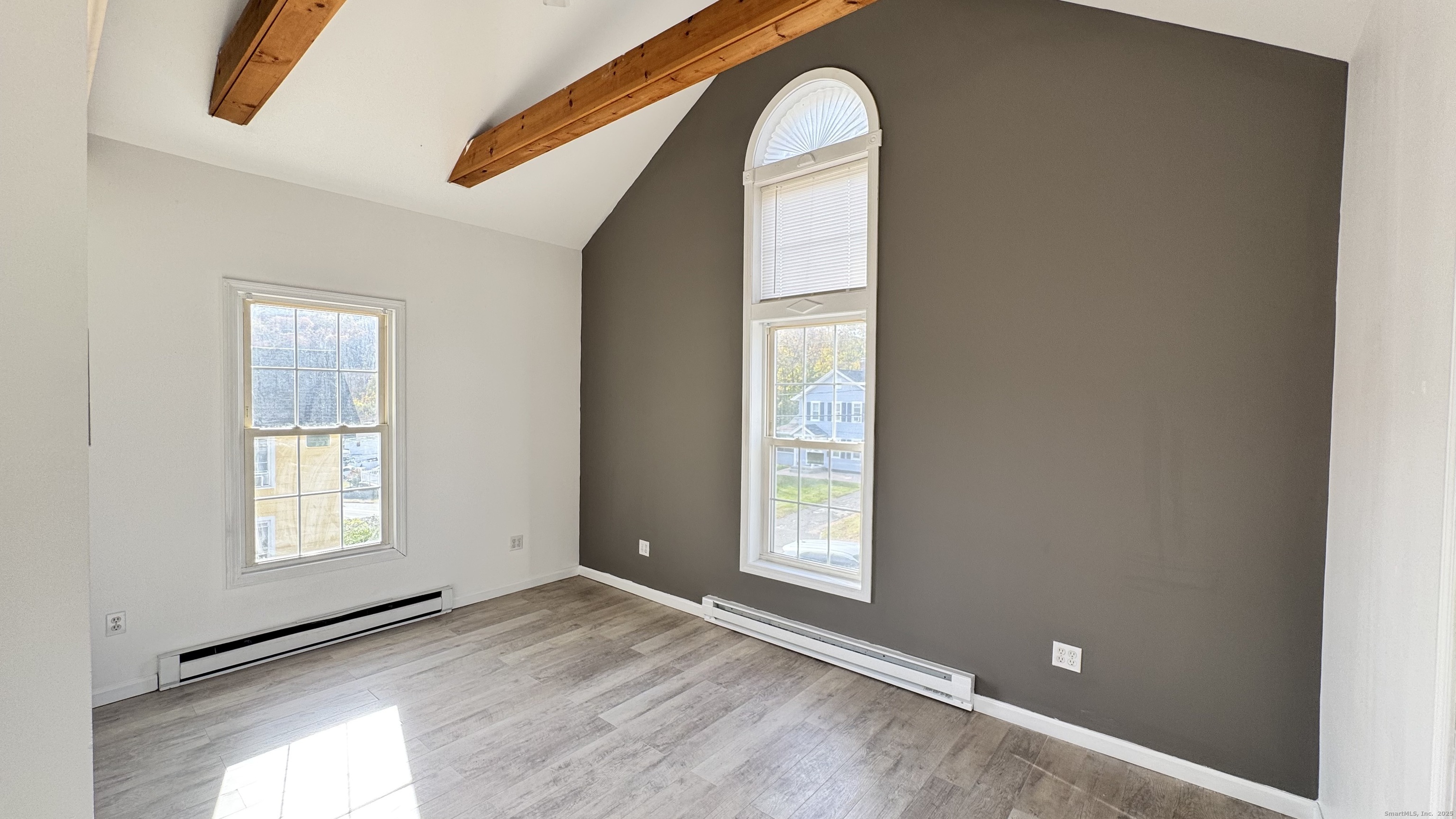 This refreshed second-floor 2-bedroom apartment offers bright, comfortable living spaces with standout architectural details and outdoor areas on a .51-acre flat lot. The home features LVT wood-look flooring in most rooms, carpet in the second bedroom, fresh interior paint, newer fixtures, and abundant natural light. The inviting living room includes a decorative fireplace and French doors opening to the dining room. The rear eat-in kitchen features white cabinetry, good counter space, a gas stove, overhead microwave, and a window above the sink. Off the kitchen is the in-unit laundry area with a new washer and dryer, along with a bay window offering natural light and pleasant views of Naugatuck. The kitchen also provides access to a balcony with a spiral staircase. The primary bedroom offers vaulted ceilings, exposed beams, an arched feature window, built-in shelving, and excellent light. The second bedroom includes carpeted flooring, good closet storage, and the reverse side of the decorative fireplace. The bathroom has been refreshed with updated fixtures and a newer sink. Additional features include electric heat, a private interior entry accessed through the newly tiled shared front porch, and off-street parking. Multiple windows provide elevated views, enhancing the bright second-floor setting. Conveniently located near shopping, parks, everyday necessities, and public transportation.