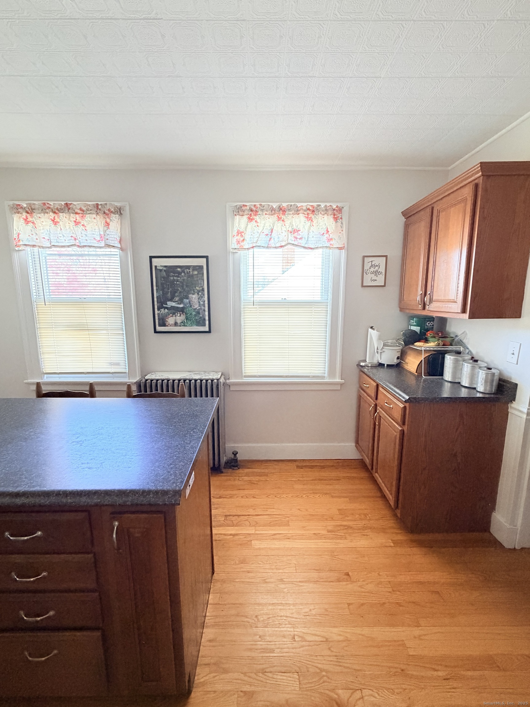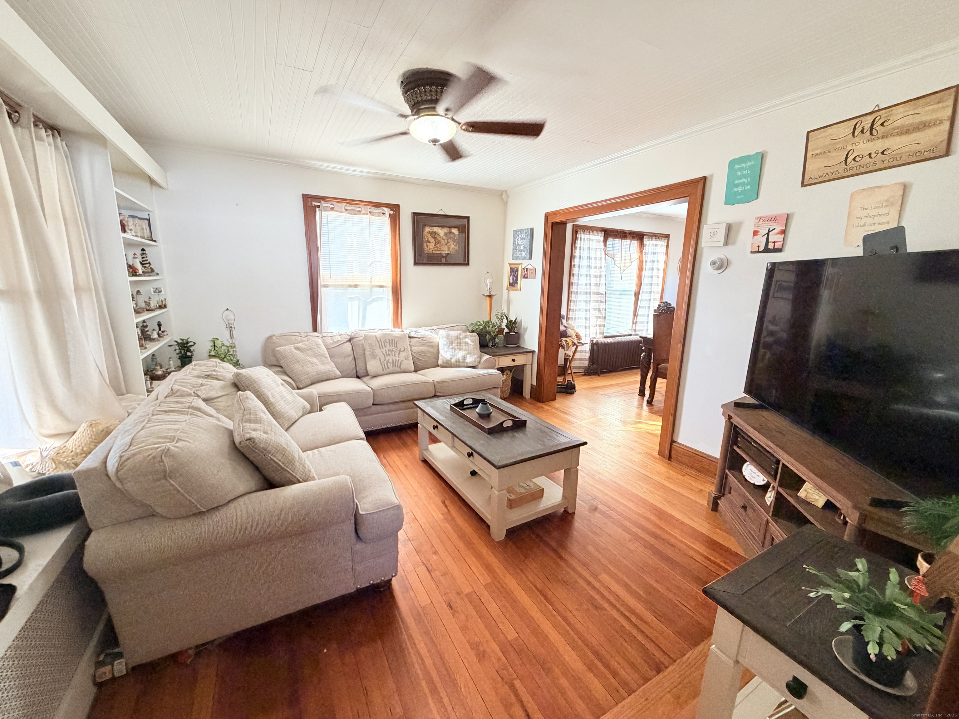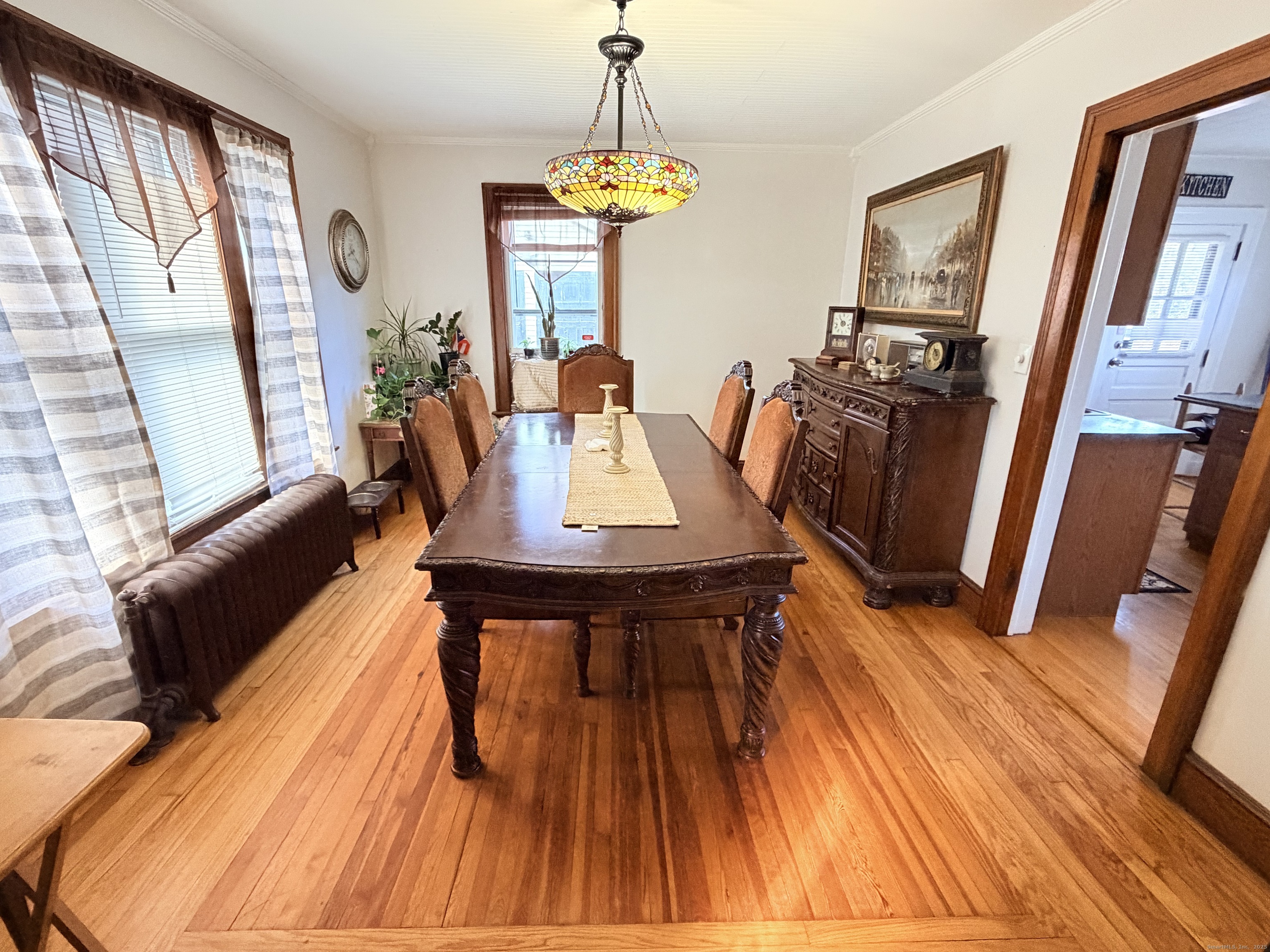 Welcome to this charming and beautifully maintained 2.5-bedroom (yes, you read that right, ".5" additional space, 1.5-bath home, thoughtfully designed for comfort, character, and modern living. From the moment you step inside, you'll feel the warmth and pride of ownership throughout every space. The sun-filled living room features gleaming hardwood floors, large windows, and custom built-ins that add both function and timeless appeal. The inviting layout flows into a spacious formal dining room-perfect for gatherings-highlighted by a stunning stained-glass Tiffany chandelier and rich wood trim. The kitchen offers generous cabinetry, stainless steel appliances, a center island, and ample counter space, making it ideal for cooking, entertaining, and everyday convenience. This home features 2 full-size bedrooms, plus an additional cozy room-perfect for a nursery, office, or personal retreat-offering flexibility to match your lifestyle needs. Outside, enjoy a large backyard with a cement patio, perfect for barbecues, entertaining, or quiet afternoons outdoors. The property also includes a Wood stove-heated 2-car garage with full electric, providing the ultimate convenience for hobbies, storage, and year-round vehicle protection. MAJOR VALUE ADD!! Sellers are considering paying off the solar panels and remaining roof balance for the new owner's peace of mind, offering the incredible benefit of essentially NO electric bill!!!!