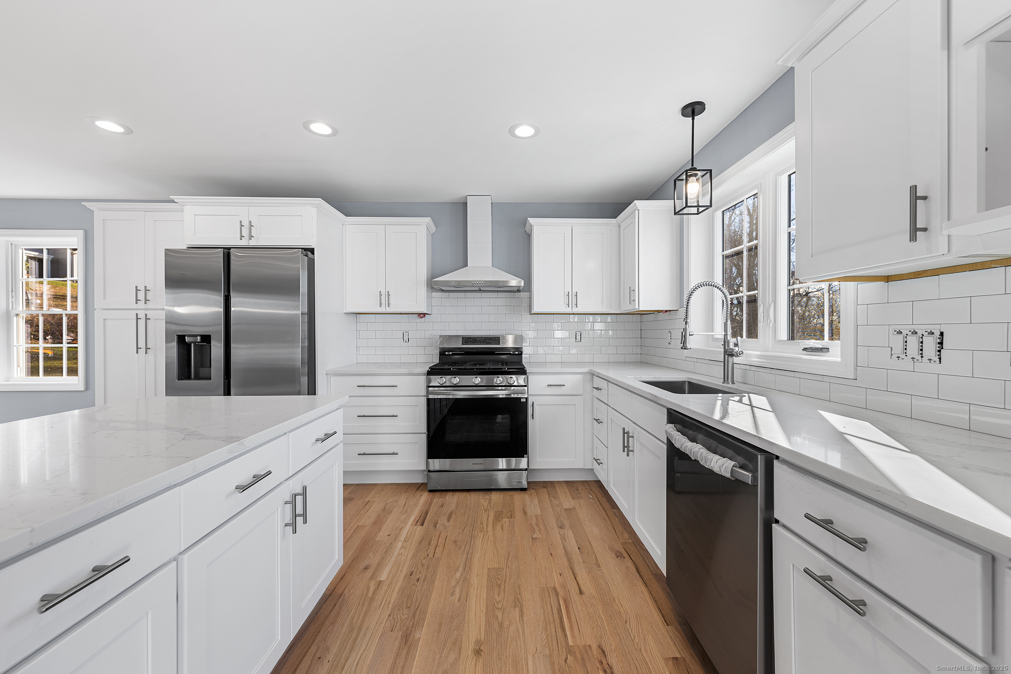 Simply stunning with a THREE CAR GARAGE! With superior craftsmanship and thoughtful touches at every turn, this new construction is sure to impress! The striking facade beckons you in to explore the versatile, open floorplan with gleaming hardwood floors, abundant windows, & a soothing palette with crisp white trim throughout. Single level living at its finest with bonus space below! The cabinet-packed dream kitchen is anchored by a massive quartz island & features stainless steel appliances, gas cooking, & stylish subway tile backsplash. This space opens to a large living area framed by a gorgeous picture window. The spacious dining area has a slider to an absolutely massive trex deck offering seamless indoor/outdoor living & stunning sunset views overlooking your large, private yard. XL primary w large WIC and sleek tiled bath w double vanity & oversized shower. Another large BR and hall bath round out main level. 2 fully daylit flex rooms on lower level along with another full bath offer a wealth of options: additional BRs, office, playroom, den. There's even incredible in-law / blended living potential with a private entrance off a lovely paver patio! The massive 36 x 24 three stall garage is a hobbyist's dream w sep entrance, full windows, & ample lighting. Town water & sewer, efficient propane heating and central AC. Easy access to all major routes in a lovely, wooded residential pocket. Simply a cut above - you're home!