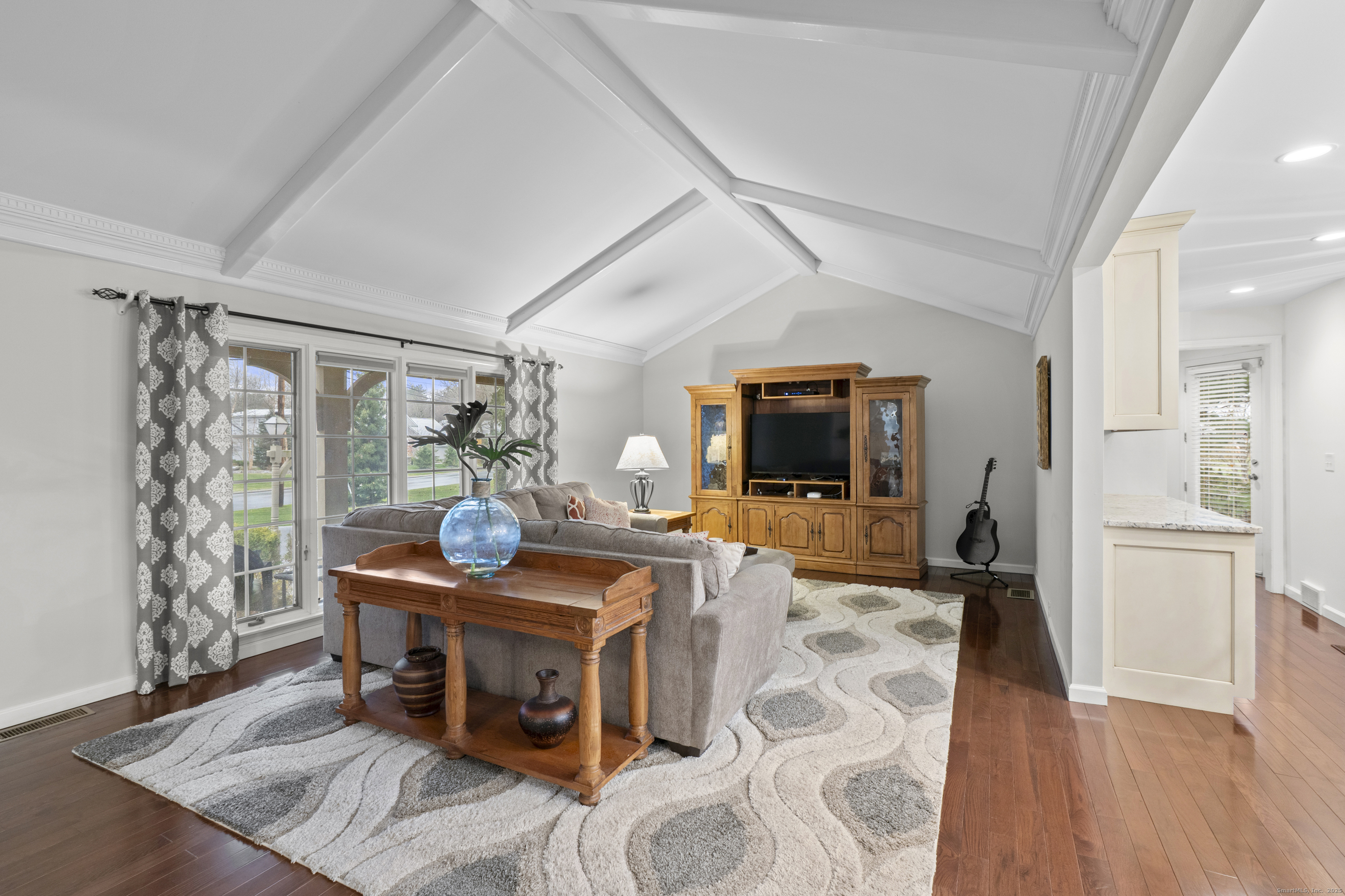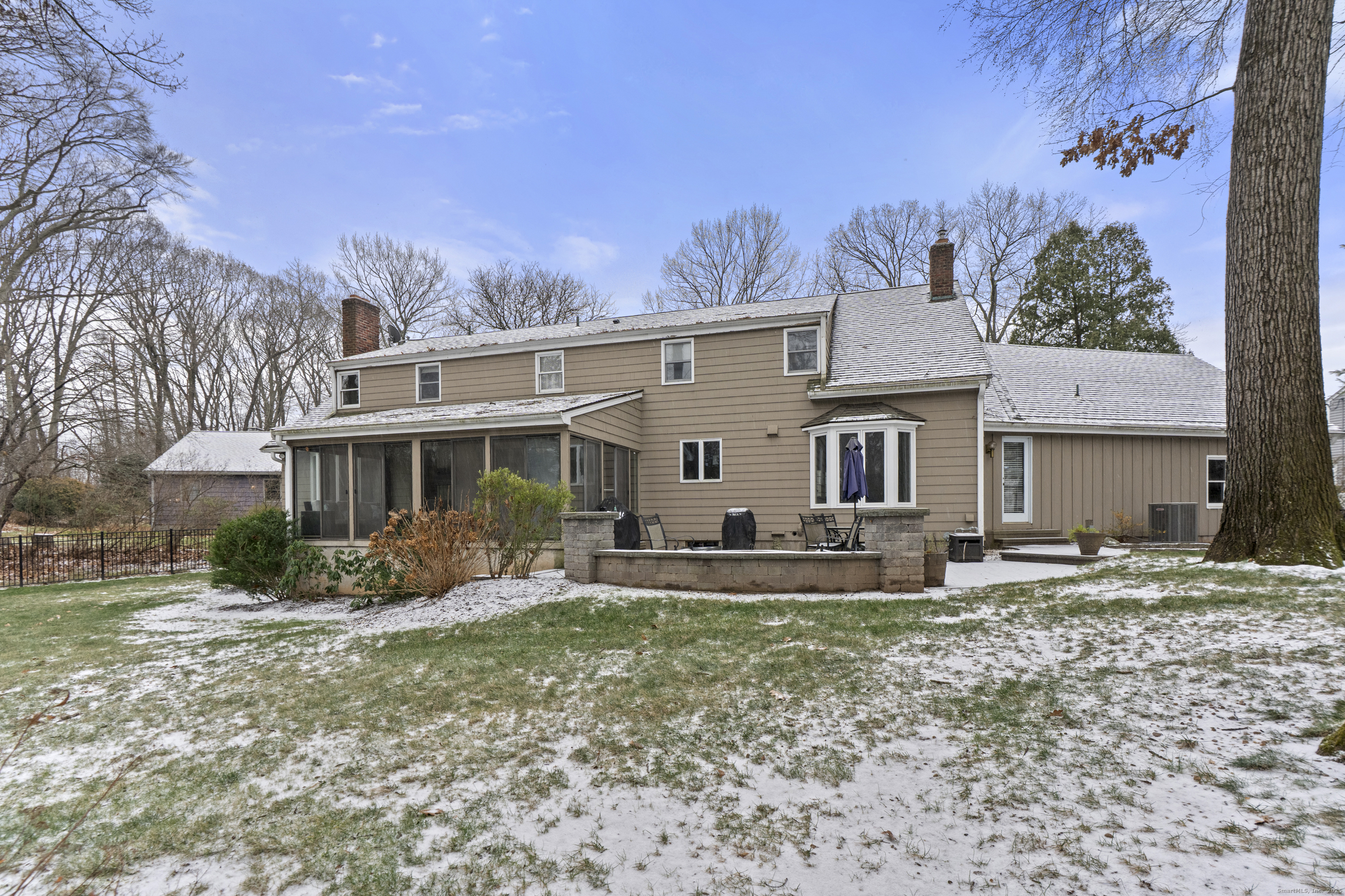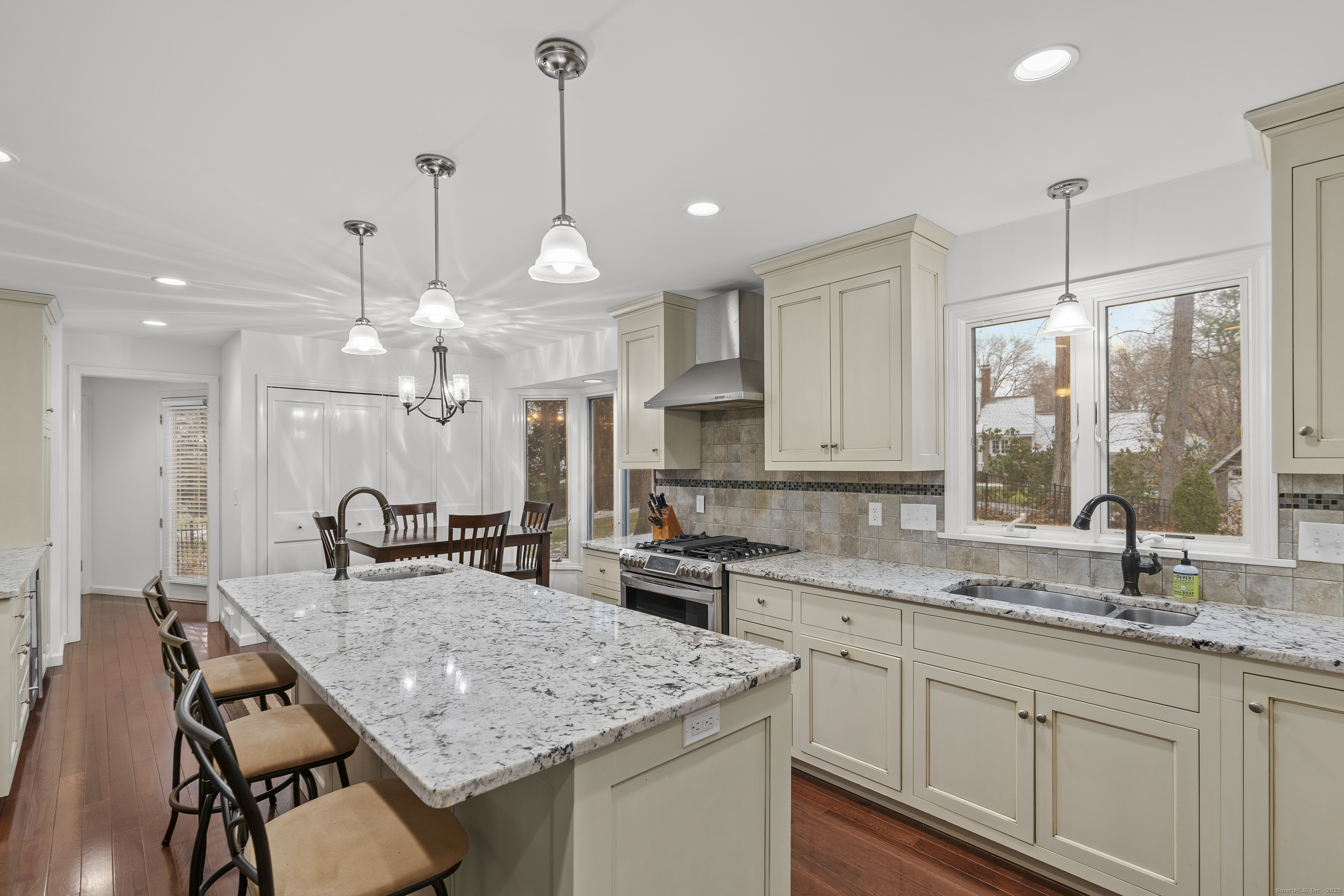 Welcome to 26 Berwyn Road, a beautifully updated Cape in one of West Hartford's most desirable neighborhoods. This inviting home features a gracious entry with hardwood floors throughout. The large vaulted-ceiling living room opens to the eat-in kitchen with granite counters, stainless appliances, counter seating, pantry, great storage, and space for a kitchen table overlooking the private backyard. Off the dining room, a charming three-season porch enhances the living space and offers peaceful views of the landscaped yard. The first-floor primary suite includes a large updated bathroom with a freestanding tub, separate shower, an expansive walk-in closet and access to the porch. A home office/den along with convenient first-floor laundry and half bath complete the first floor. Upstairs are two spacious bedrooms, a full bath, and generous storage areas off each bedroom. The partially finished walk out lower level offers a refreshed bonus space with new drop ceiling, vinyl plank flooring and a full bathroom (currently not working and not in use) and plenty of storage. Additional features include gas heat with three zones, central air plus mini-splits upstairs, 200-amp electrical, irrigation, and a two-car attached garage. Enjoy the stunning, fully fenced-in backyard with beautiful stonework and a built-in fire pit-perfect for relaxing or entertaining. Move-in ready and minutes to West Hartford Center, this home offers comfort, convenience, and timeless appeal.