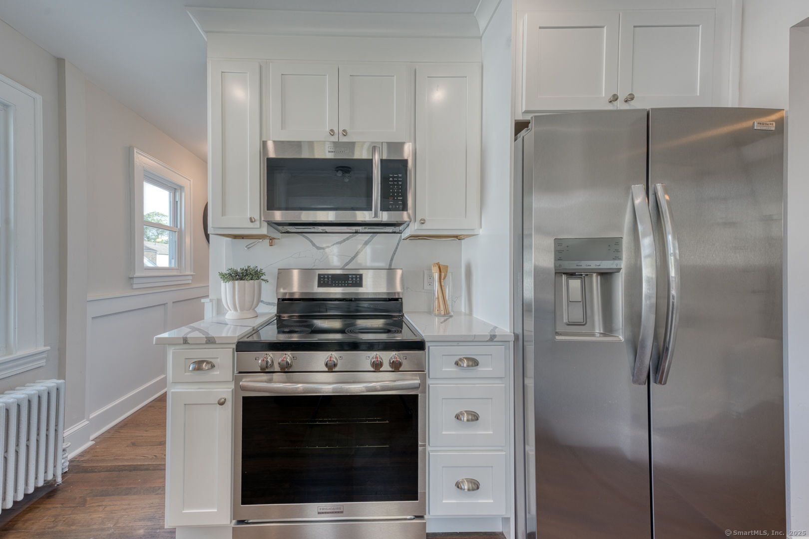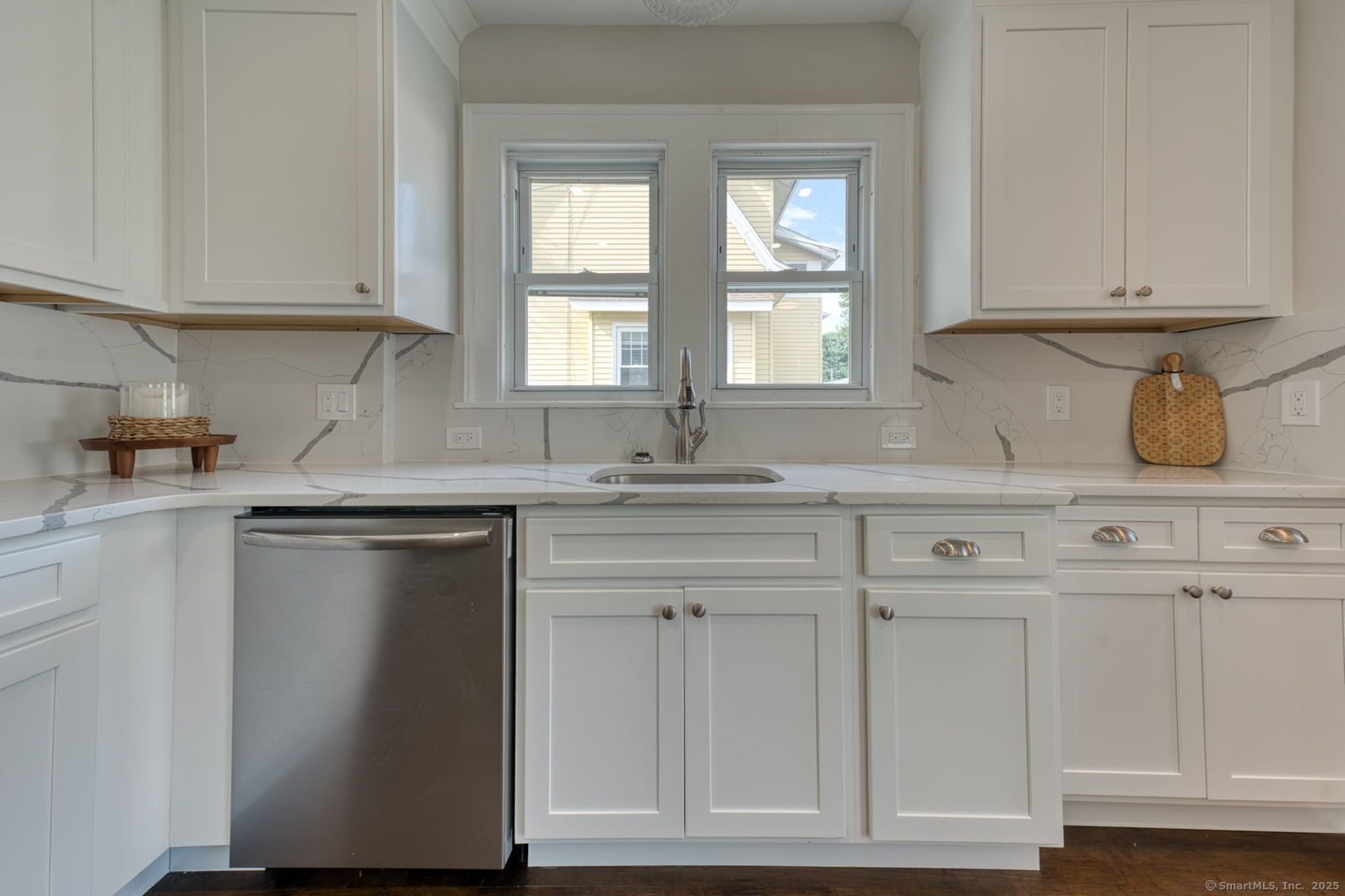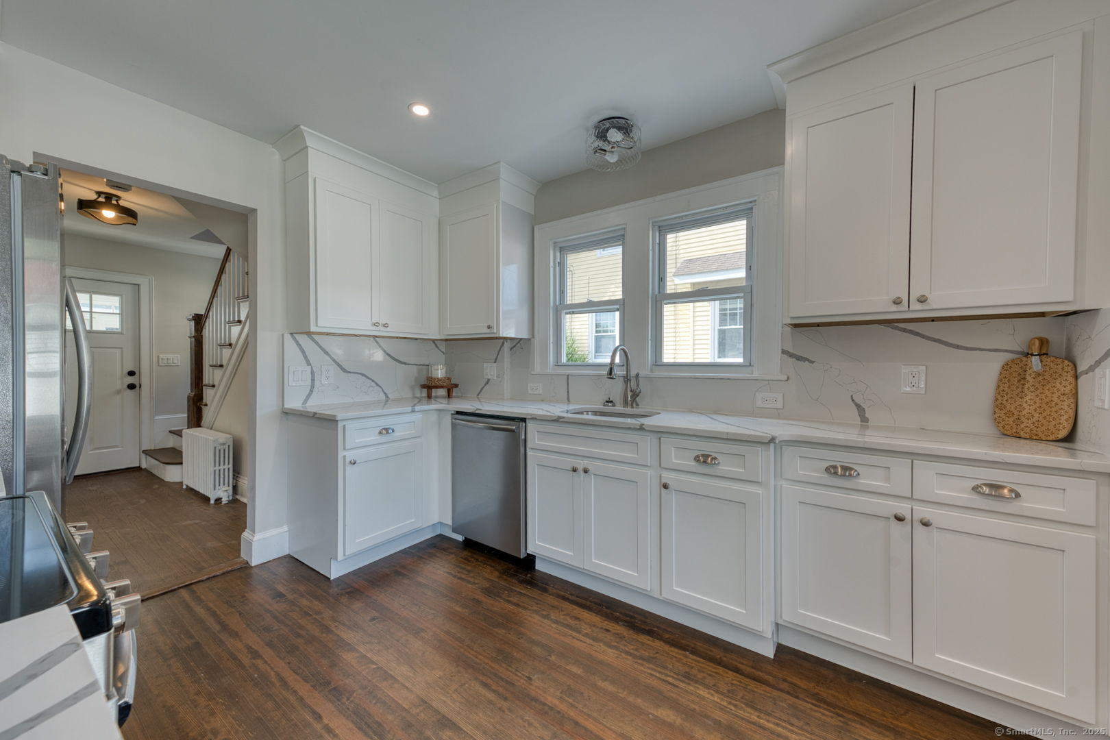 An exceptional residence, meticulously reimagined. This fully renovated home delivers refined living through a seamless blend of modern efficiency, timeless craftsmanship, and elevated design. From the moment you enter, the quality is unmistakable. The showpiece kitchen is anchored by custom Fabuwood cabinetry, striking Calcutta marble countertops, and a matching backsplash-an elegant, cohesive space designed for both everyday living and entertaining. Energy-efficient appliances, all new plumbing, and a upgraded 200 amp electrical system ensure comfort and performance without compromise. Refinished hardwood floors flow throughout, complemented by tailored trim work and thoughtfully curated fixtures that create a clean, sophisticated aesthetic. Upstairs, the primary bath offers a spa-level experience with a custom walk-in shower, radiant heated tile floors, and a double vanity. Both full bathrooms have been completely redesigned with premium materials and designer finishes. Outdoors, enjoy effortless luxury with a low maintenance Trex deck, a newly installed paver patio, and a fully fenced backyard ideal for private gatherings or quiet relaxation. A 2 car garage provides convenience and additional storage. Perfectly positioned in one of West Hartford's most sought after neighborhoods, just minutes from Blue Back Square, West Hartford Center, acclaimed schools, parks, fine dining, and major commuter routes.