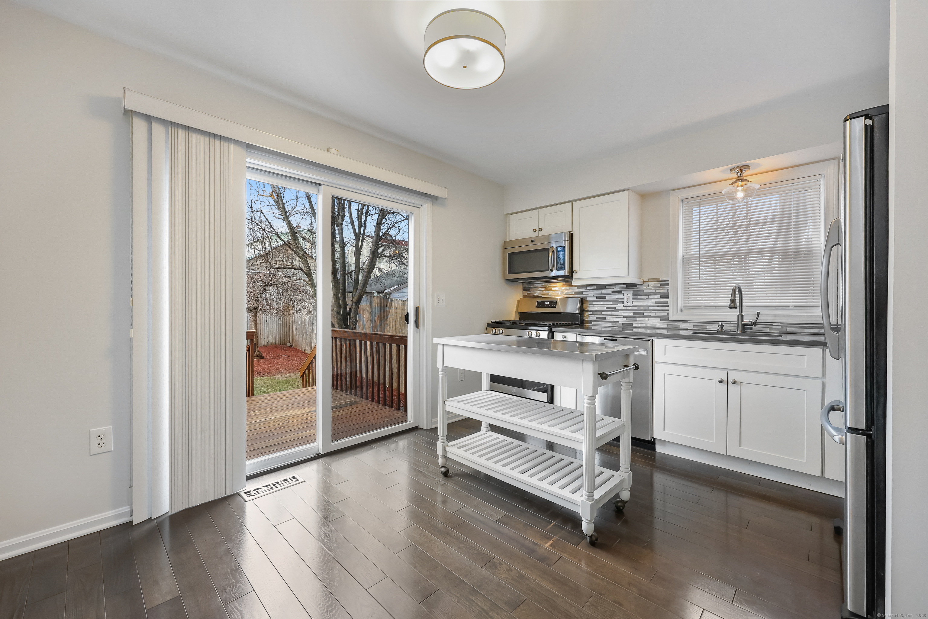 Cove Beach Stamford sunny and spacious 2-bedroom, 1.5-bathroom townhome in Stamford's desirable Cove neighborhood. This newly renovated townhome boasts a generous floor plan with stylish updates throughout on three levels. The updated eat-in kitchen w/ stainless steel appliances flows seamlessly into the warm, light and inviting living and dining areas, featuring gleaming hardwood floors. The sliders from the kitchen open to a private deck and fenced-in beautifully landscaped yard that's perfect for outdoor dining or relaxation and all on the main level. Upstairs you'll find nice-sized bedrooms with wall-to-wall carpeting, providing comfort and coziness and a spectacular view of Cove beach which is a short distance away. The large entry level w/ceramic tile has additional space that's ideal for an office, den, recreation room, or playroom. It also has the washer dryer and storage on this entry level. Central air conditioning and off-street parking for two cars. Beautiful yard with deck & mature plantings make this picture perfect. Situated just steps away from Cove Island Park, residents have beach rights and enjoy easy access to the beach, park facilities, tennis courts, and convenient location to trains and highway - a commuter's delight! Don't miss the opportunity to move right-in to this beautiful townhome!