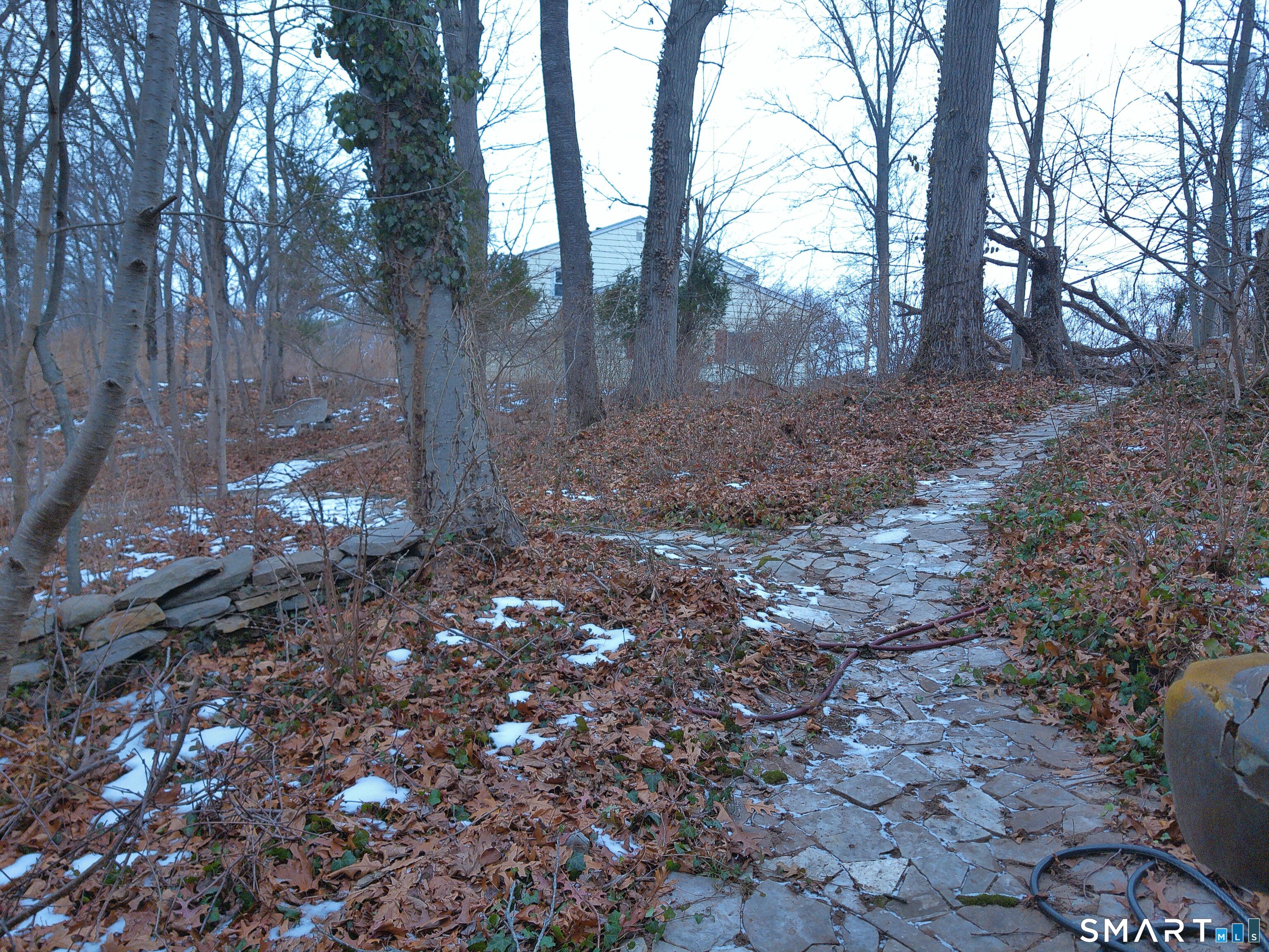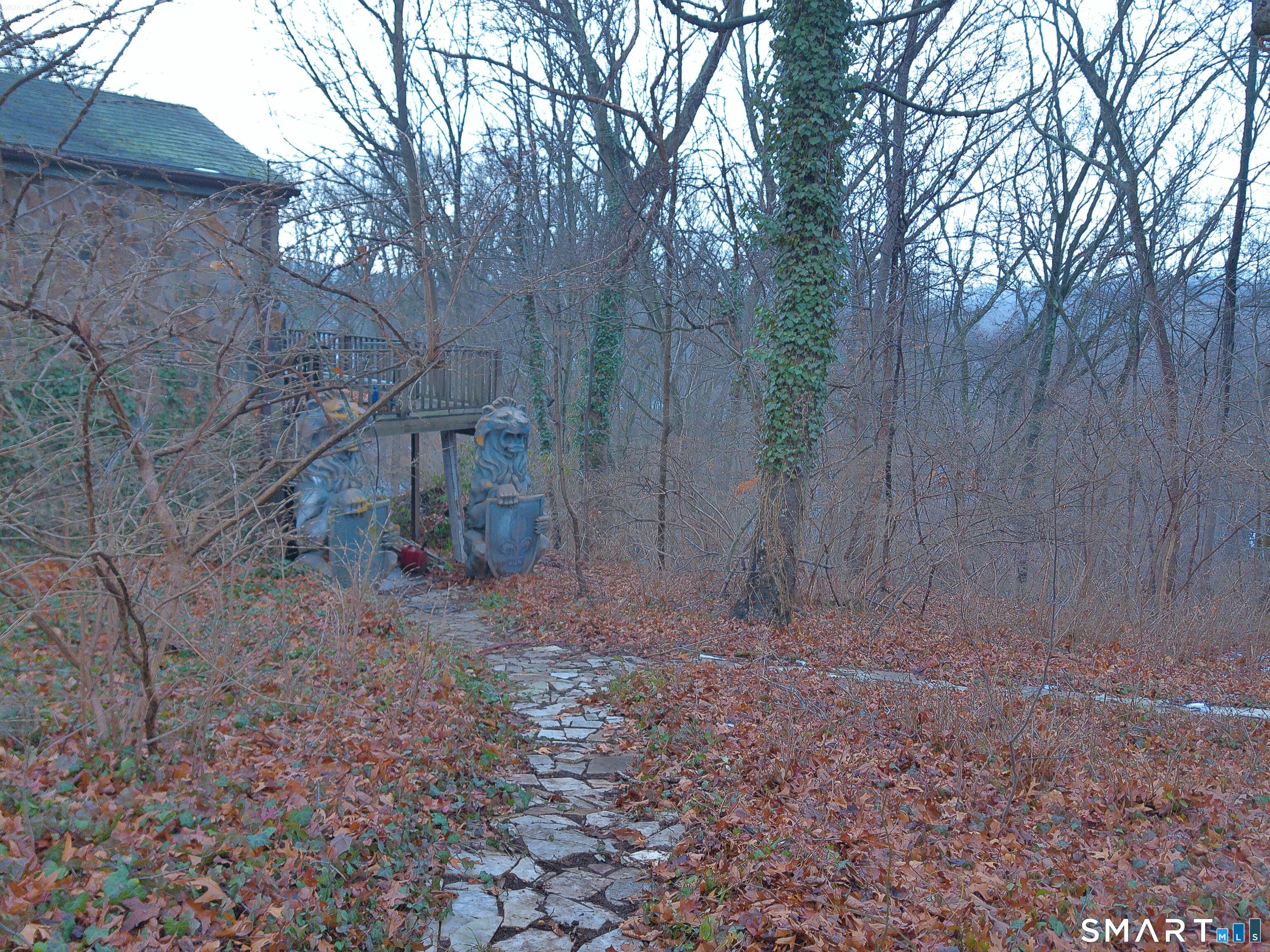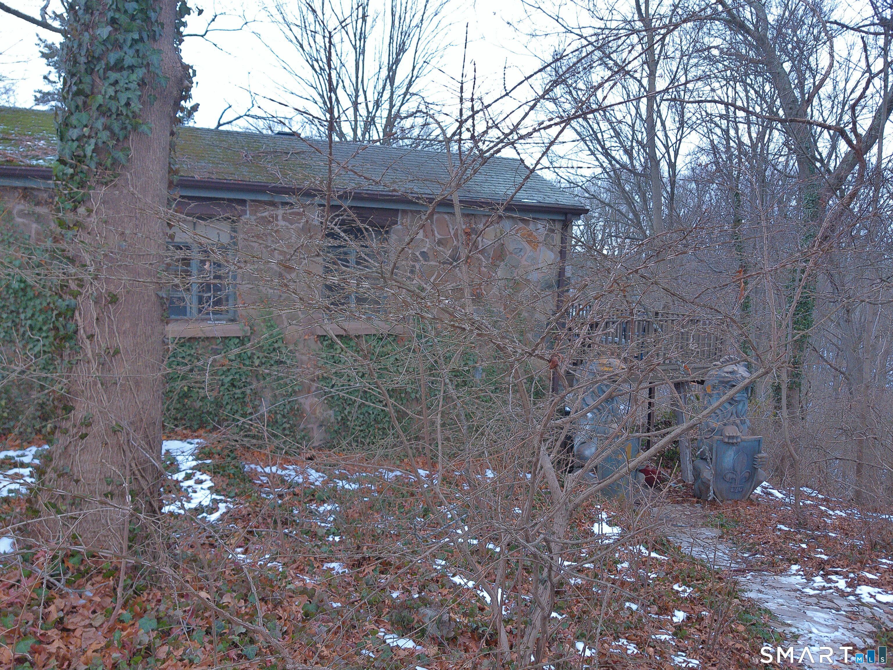 Double Play! Mid century modern stone ranch ready for your creative vision to make this your own. Great bones, solid oak hardwood floors throughout. If you're craving something a little bit quirky, you'll fall in love with the up lighting, unique fixtures and movable bookshelf. The lower full daylight level with massive windows offers an opportunity for easy expansion, for additional bedroom, playroom or entertainment hub-you decide. Oversized lot with separate 25' ROW (right of way) access at rear may offer an additional building lot (please verify with zoning) Or meander through your wooded area on stone paths enjoying nature's bounty at home.