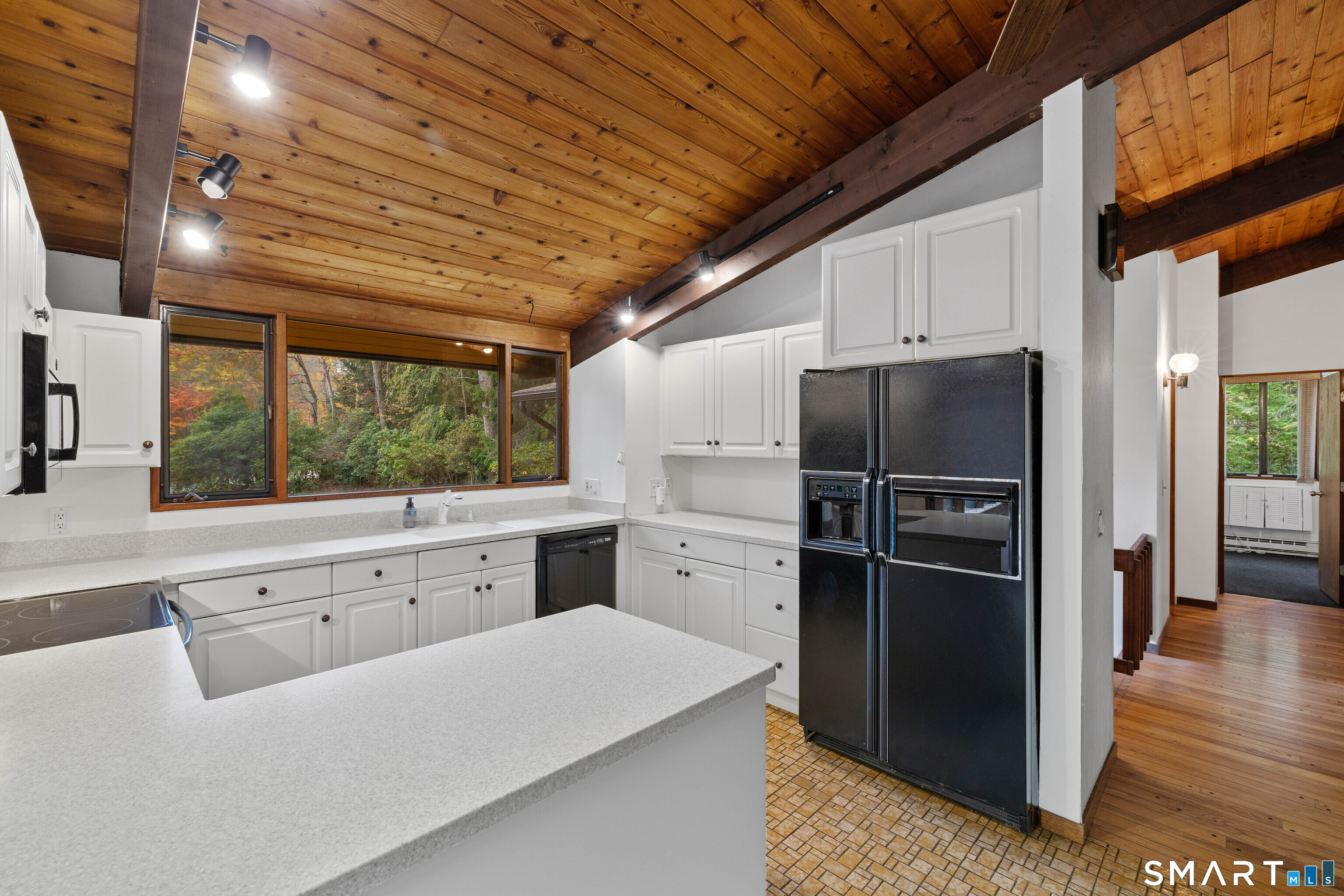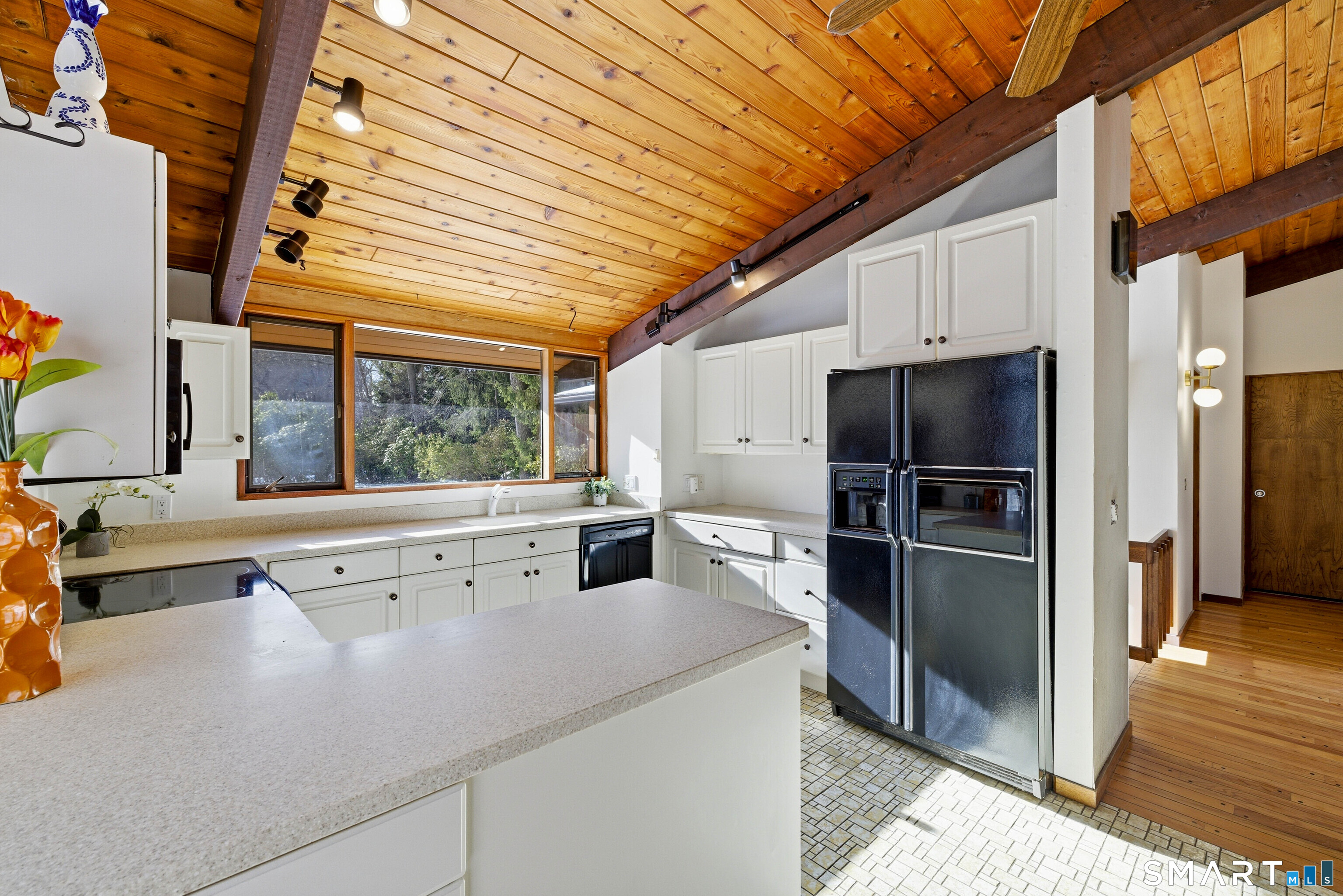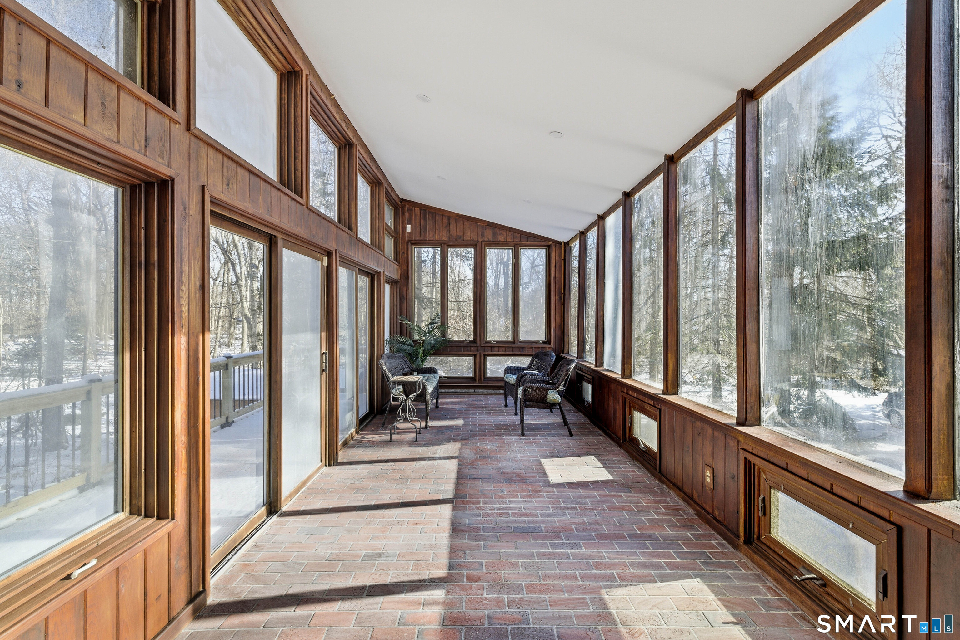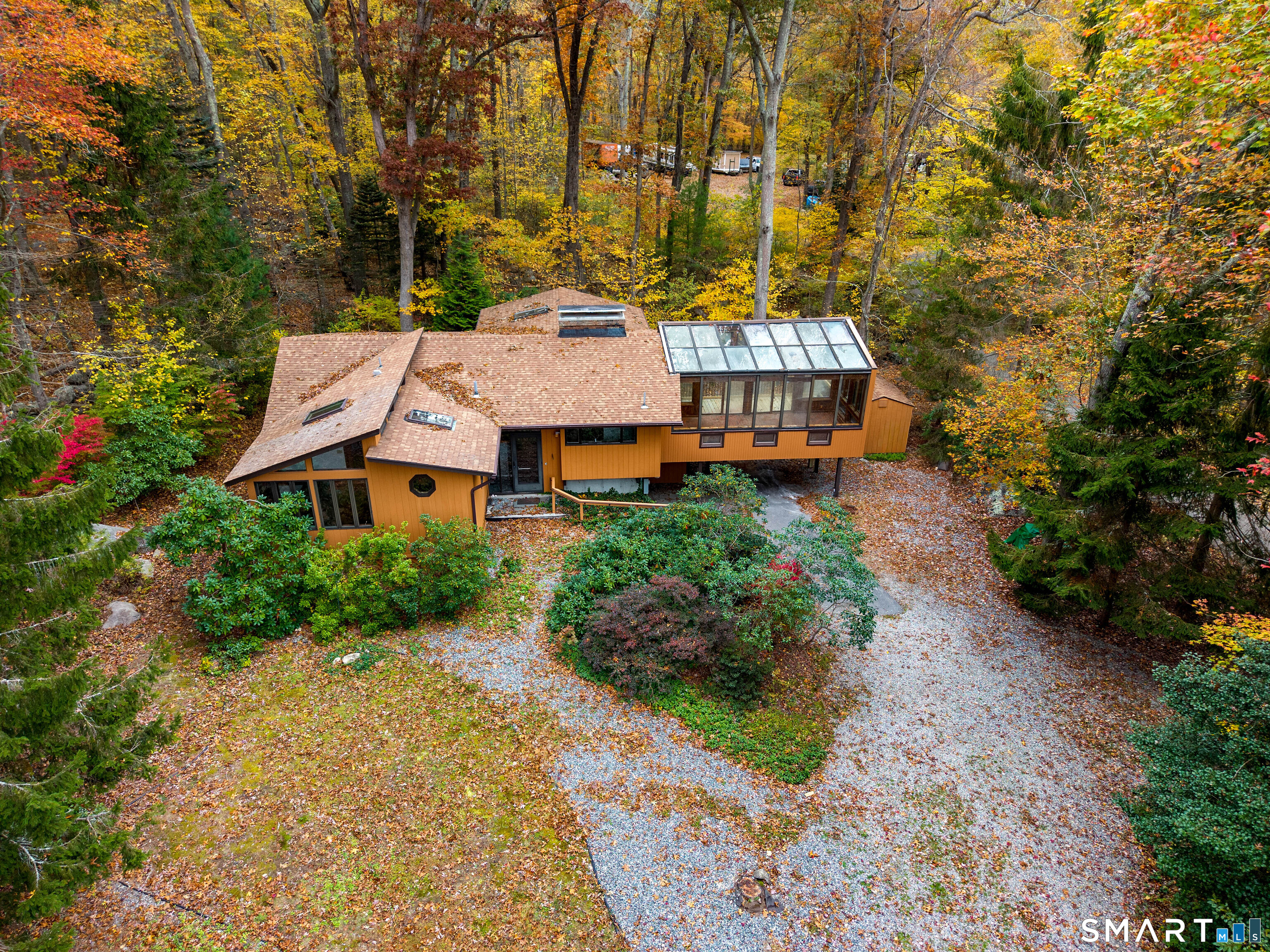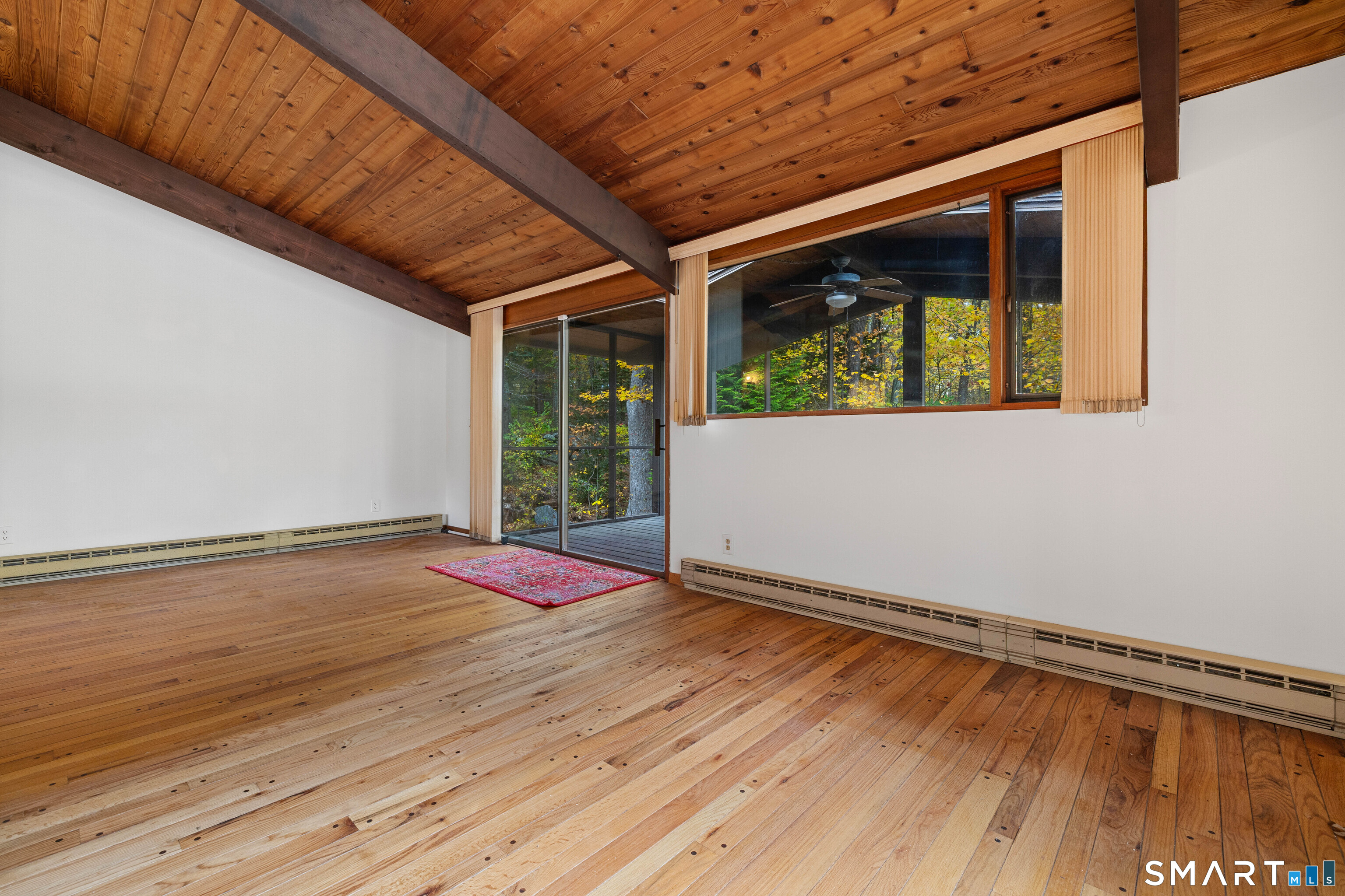 Designed by the iconic Acorn Deck House Company, this captivating mid-century contemporary is a rare blend of architectural artistry and inviting modern comfort. Soaring vaulted cedar ceilings, dramatic exposed beams, and expansive walls of glass blur the line between indoors and out, bathing the home in natural light and tranquil woodland views. The open kitchen flows effortlessly into a glass-wrapped sunroom and screened porch-perfect for savoring morning coffee or unwinding in the evening, immersed in nature. A striking double-sided brick fireplace serves as the heart of the living space, enhanced by rich hardwood floors and a seamless indoor-outdoor connection. Nestled amid lush, vibrant woods, this home offers timeless design, warmth, and a peaceful retreat unlike any other.