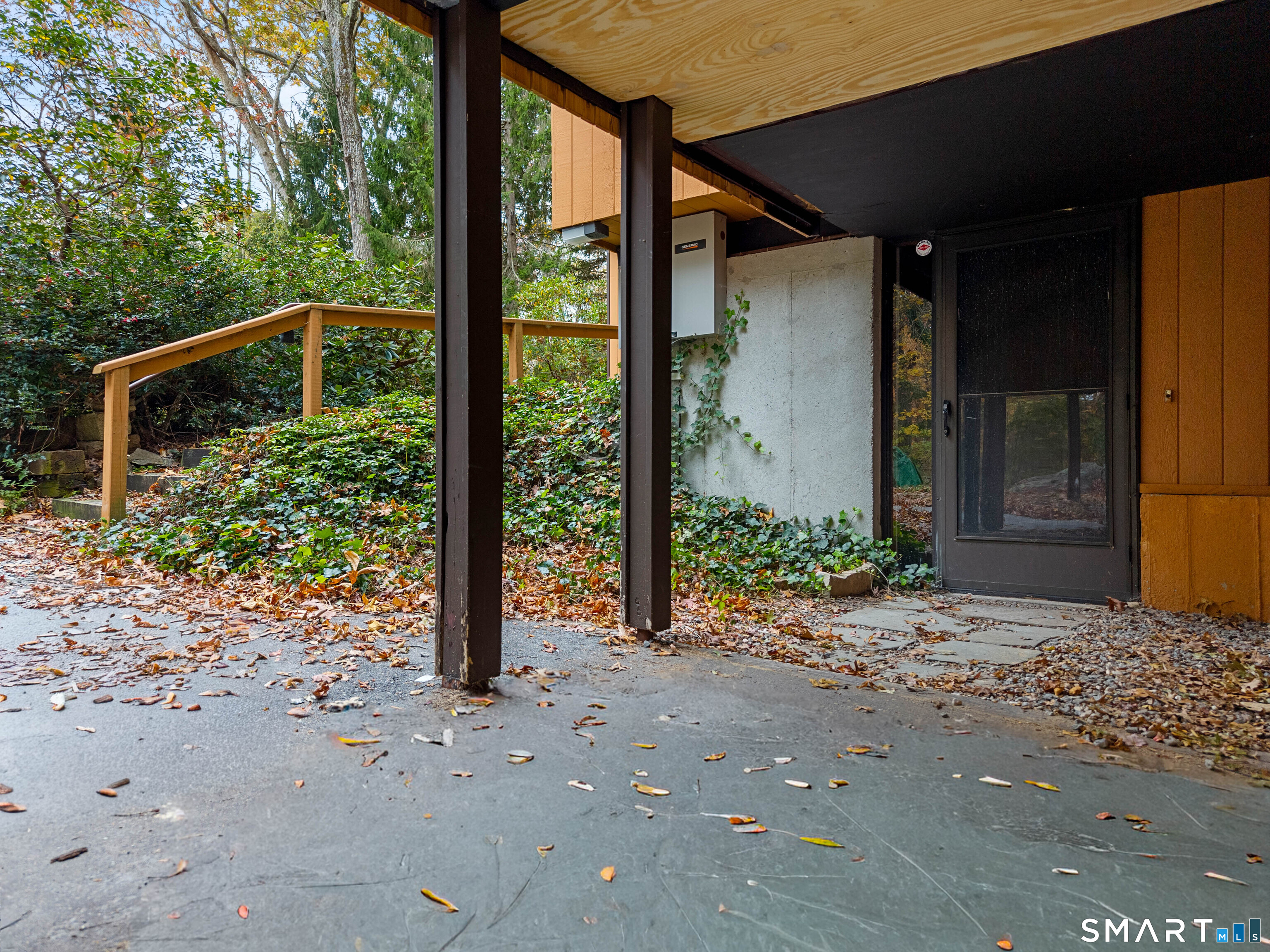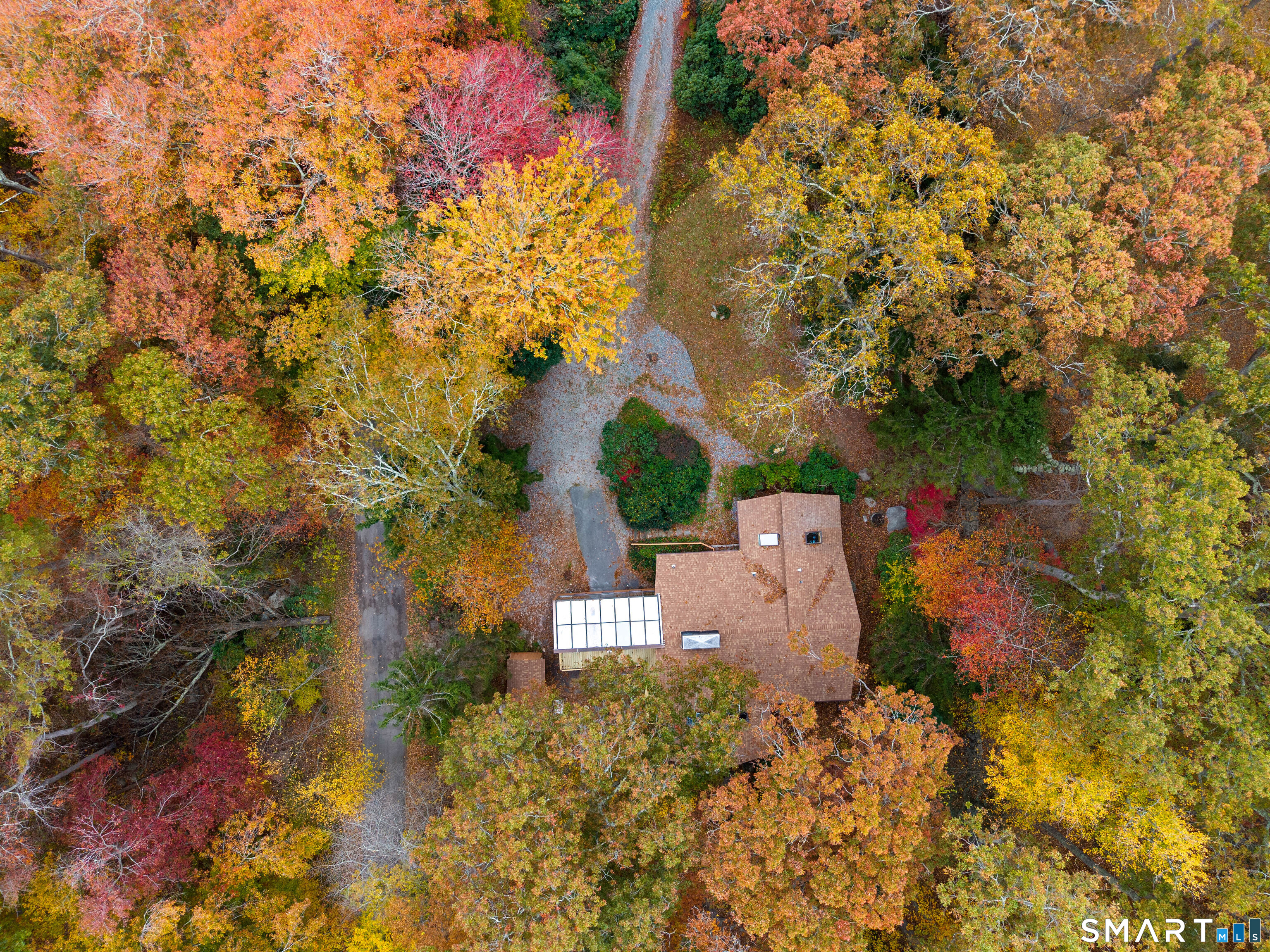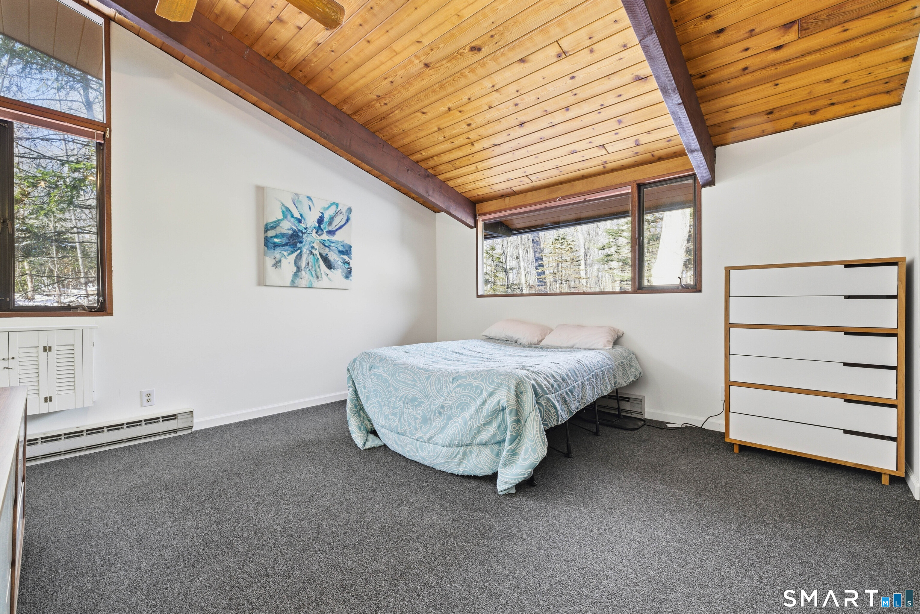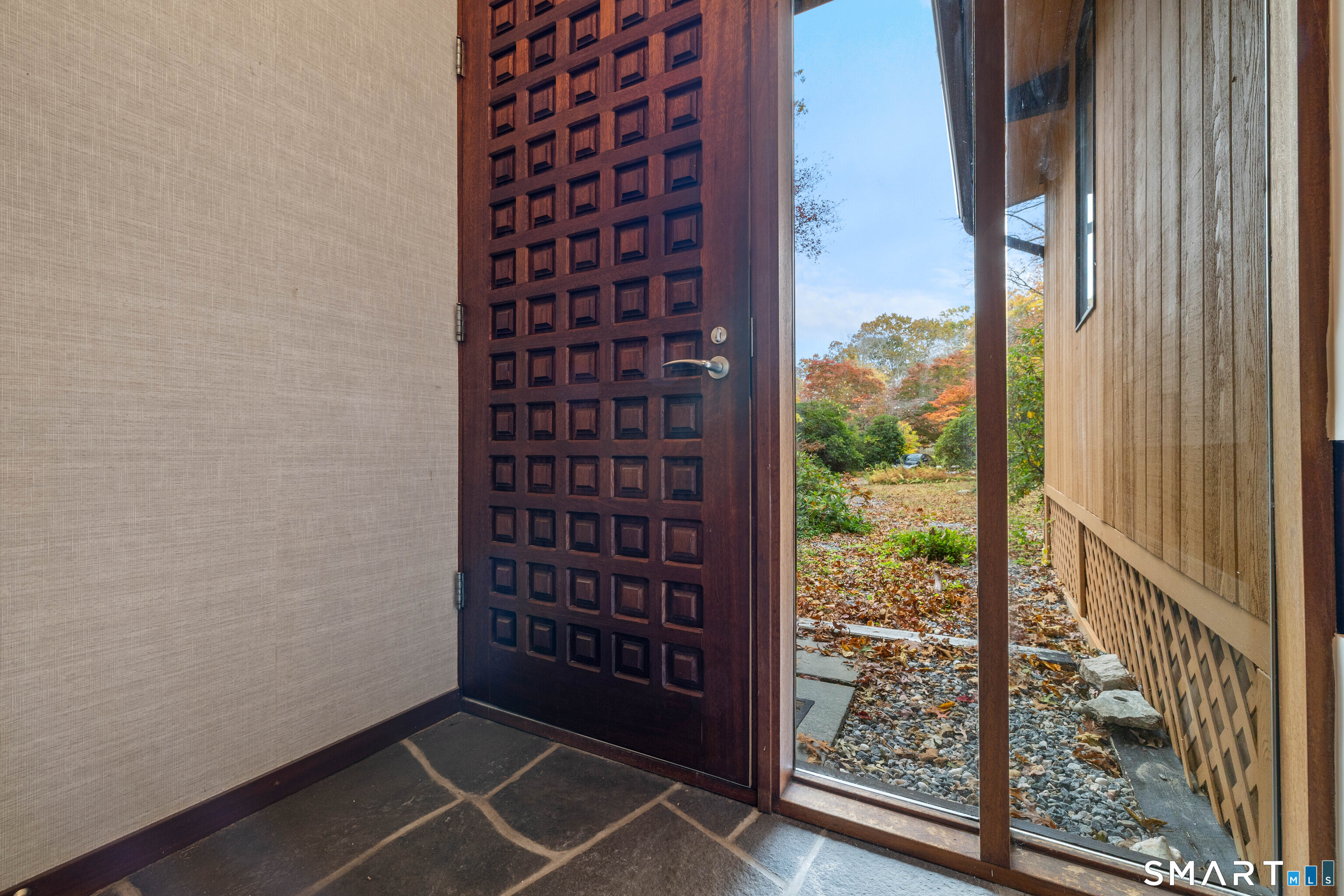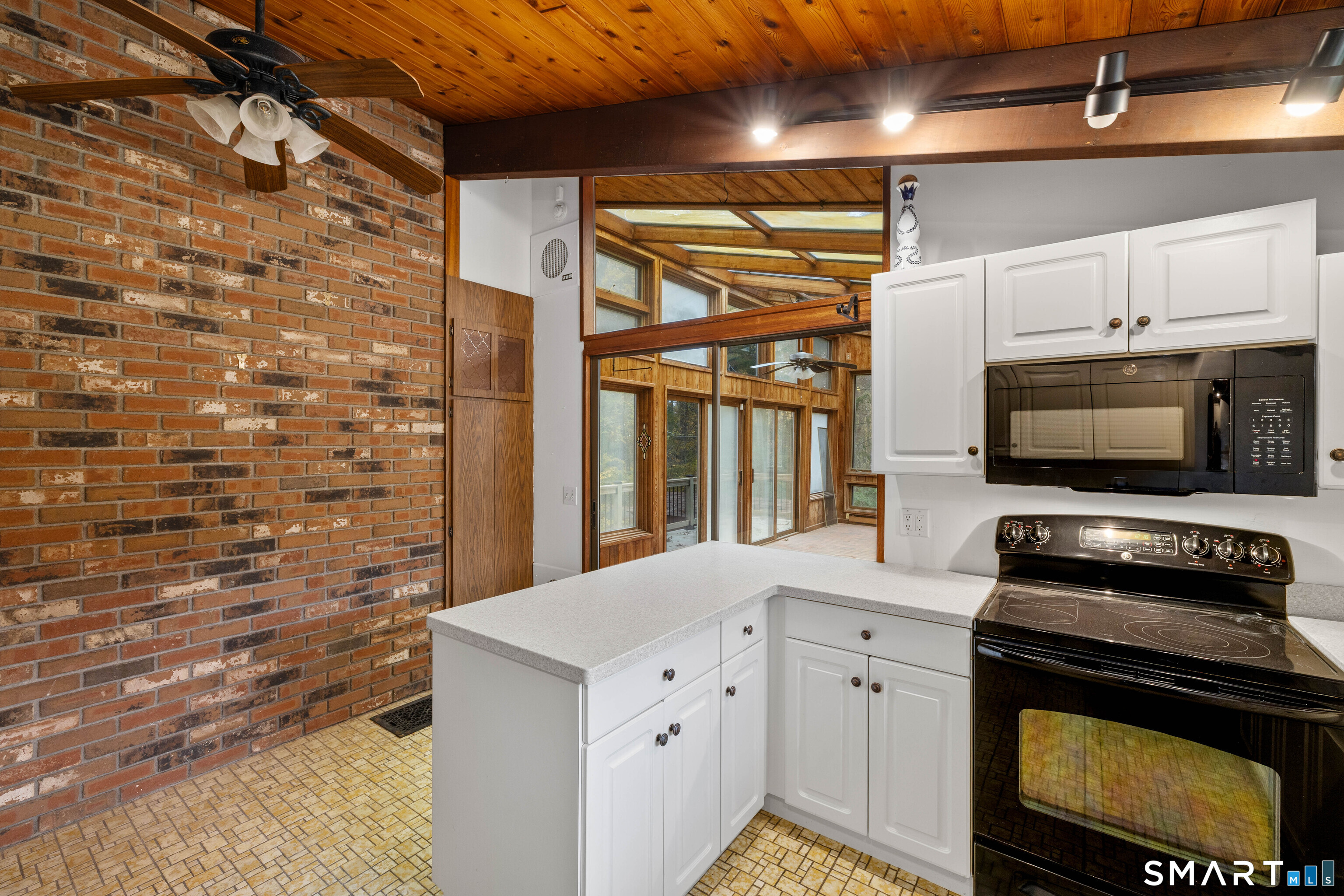 Designed by the iconic Acorn Deck House Company, this captivating mid-century contemporary is a rare blend of architectural artistry and inviting modern comfort. Soaring vaulted cedar ceilings, dramatic exposed beams, and expansive walls of glass blur the line between indoors and out, bathing the home in natural light and tranquil woodland views. The open kitchen flows effortlessly into a glass-wrapped sunroom and screened porch-perfect for savoring morning coffee or unwinding in the evening, immersed in nature. A striking double-sided brick fireplace serves as the heart of the living space, enhanced by rich hardwood floors and a seamless indoor-outdoor connection. Nestled amid lush, vibrant woods, this home offers timeless design, warmth, and a peaceful retreat unlike any other.