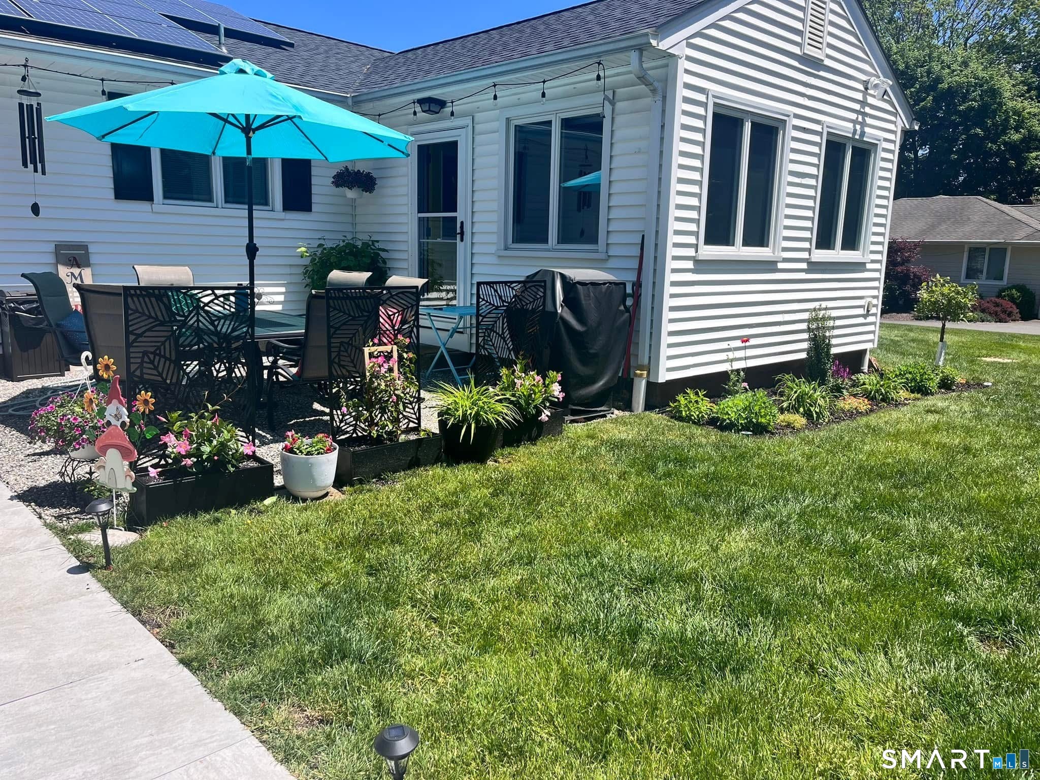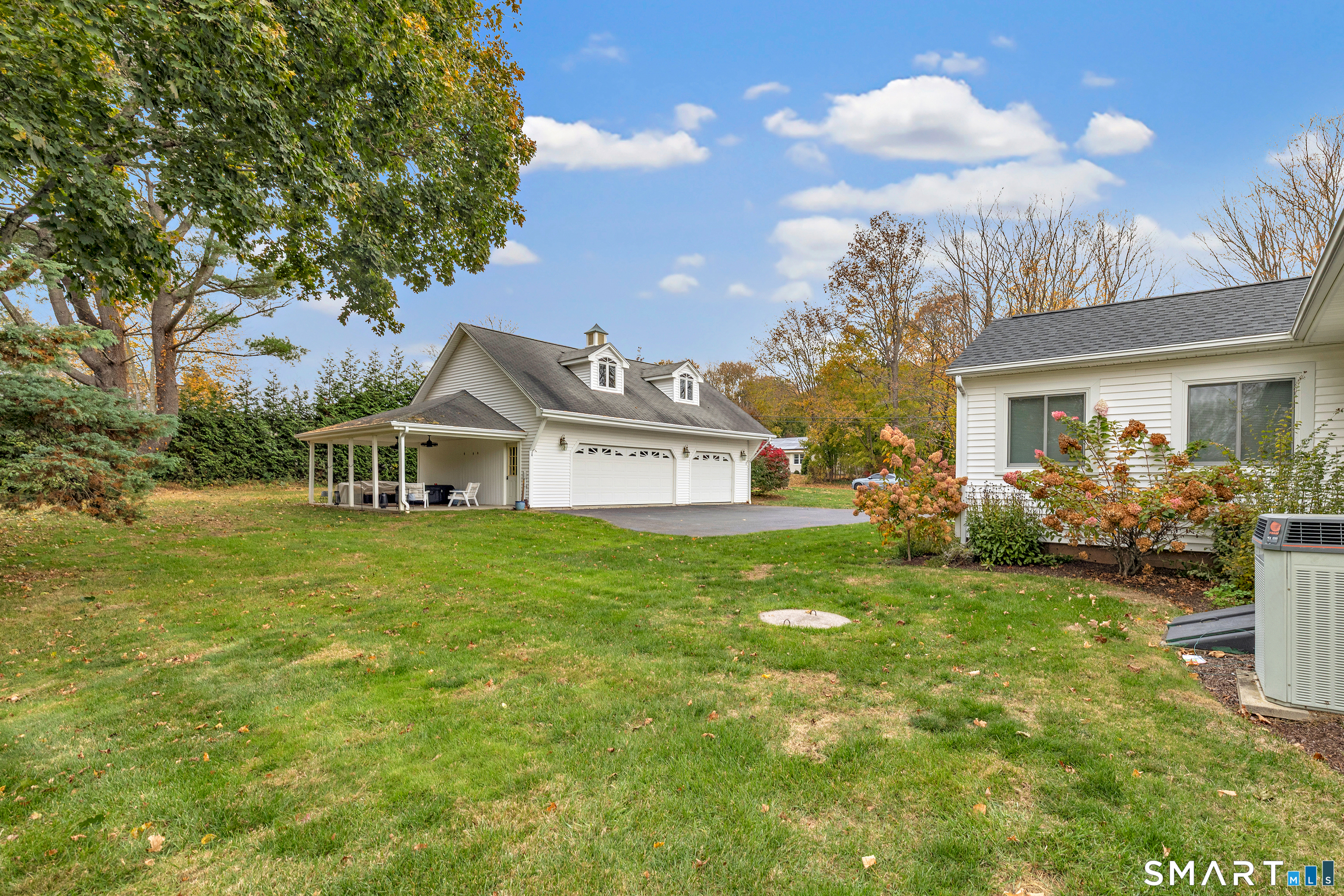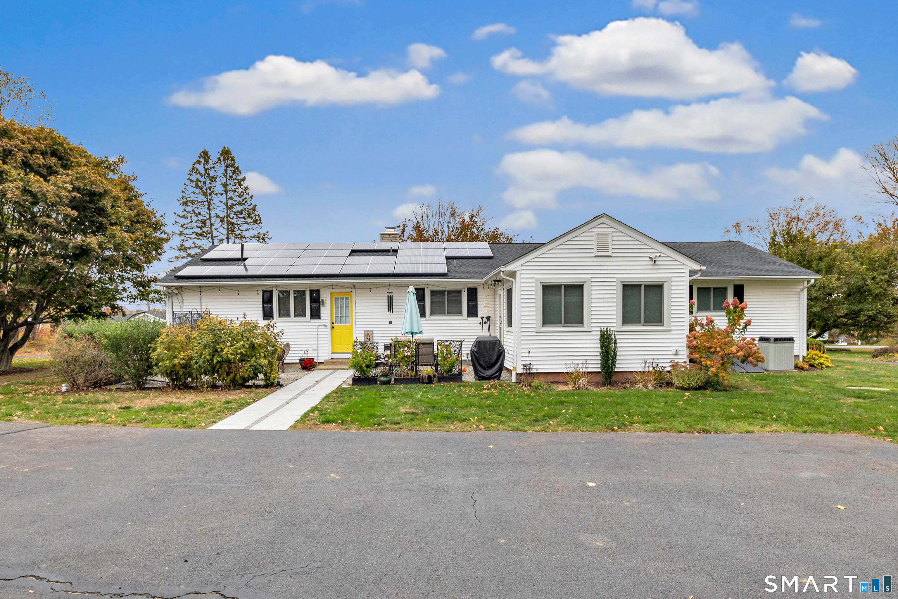Experience single-floor living at its finest in this well maintained 4-bed, 2-bath ranch in sought after Huntington Center. Set on a level corner lot, this home blends comfort, efficiency and timeless appeal. With an open-concept flow connecting the kitchen, dining area and sunroom creating a bright, inviting space ideal for everyday living and hosting gatherings. The updated kitchen features beautiful wood cabinetry, quartz countertops and stainless steel appliances. The newly renovated sunroom with vaulted ceilings and exposed beams offers a bright, airy retreat. The living room with fireplace is ideal for cozy evenings. The primary bedroom suite provides a private escape with a full bath, walk-in closet, and mini-split system. Three additional bedrooms offer flexibility for guests or home office space, while main-level laundry adds convenience. The finished lower level offers a spacious rec room with 1038 sqt for games, movies, or hobbies. Two outdoor patios and a fire pit create a perfect setting for entertaining. The 3-car detached garage is equipped with a walk-up loft offering exceptional storage or future possibilities. Notable recent improvements include Andersen windows, roof, heating system, tankless water heater, well equipment, mini split in primary bedroom and septic tank. Owned 4 yr solar panels to be paid off at closing provide long-term energy efficiency and cost savings. This home is fueled by propane, has central ac and is on private well and septic.