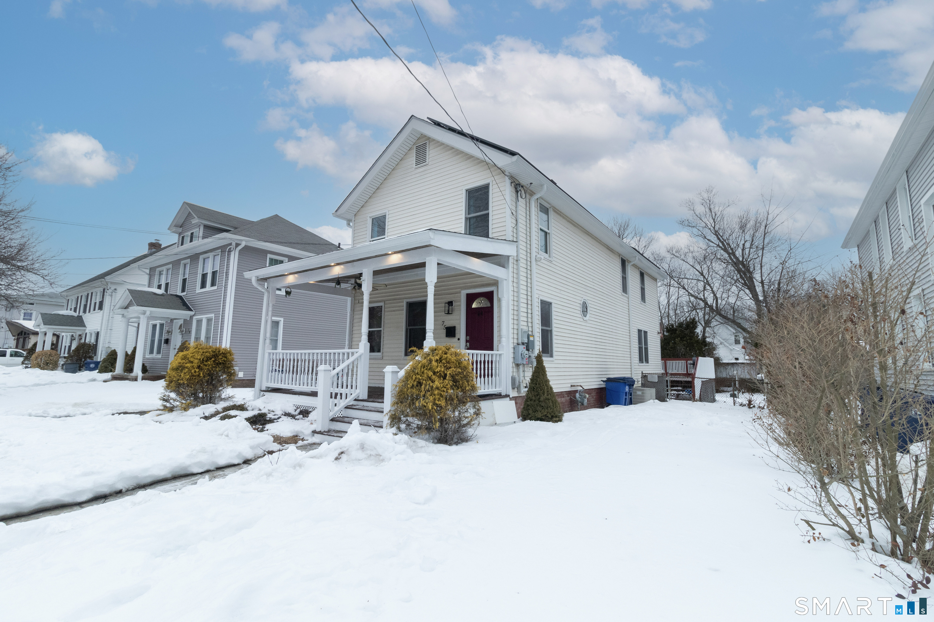 Tastefully updated 1800's Colonial offering timeless character and modern convenience. A welcoming covered front porch leads into a bright living room open to a spacious dining area, ideal for everyday living and entertaining. The large eat-in kitchen features abundant oak cabinetry, stainless steel appliances, tile flooring, and a sliding door to the deck overlooking a deep, level, fenced yard. Beautiful natural woodwork and hardwood floors are found throughout. The first floor is completed by a convenient half bath and laundry area. Upstairs, the king-size primary bedroom offers triple closets, along with three additional bedrooms serviced by a remodeled full bath with tub/shower enclosure. A full, dry basement provides plenty of storage! Additional highlights include maintenance free vinyl siding, three-year-old roof, tankless gas hot water heater, central air, and solar panels providing significant electric cost savings. A wonderful home to just move-in and enjoy!