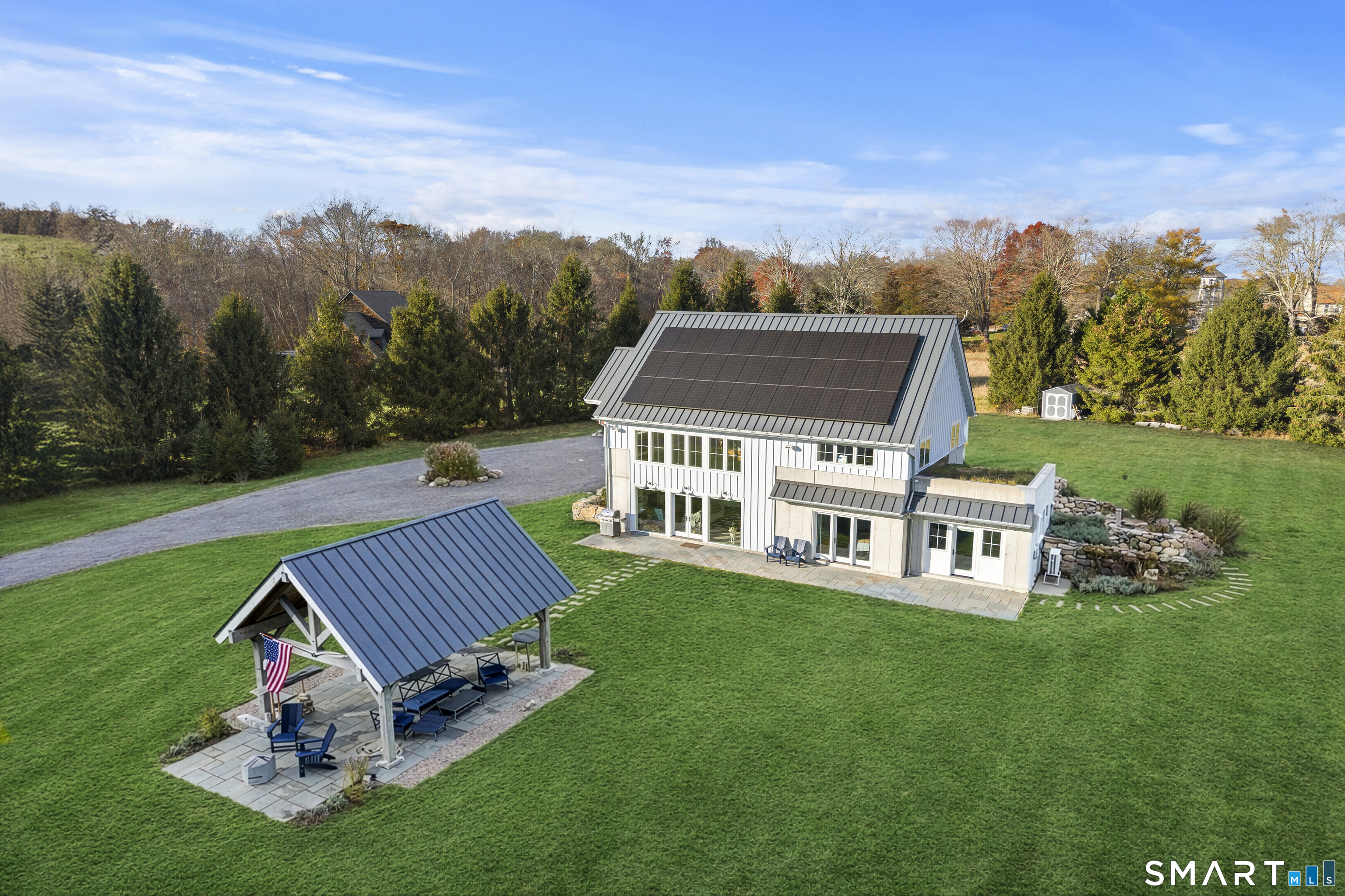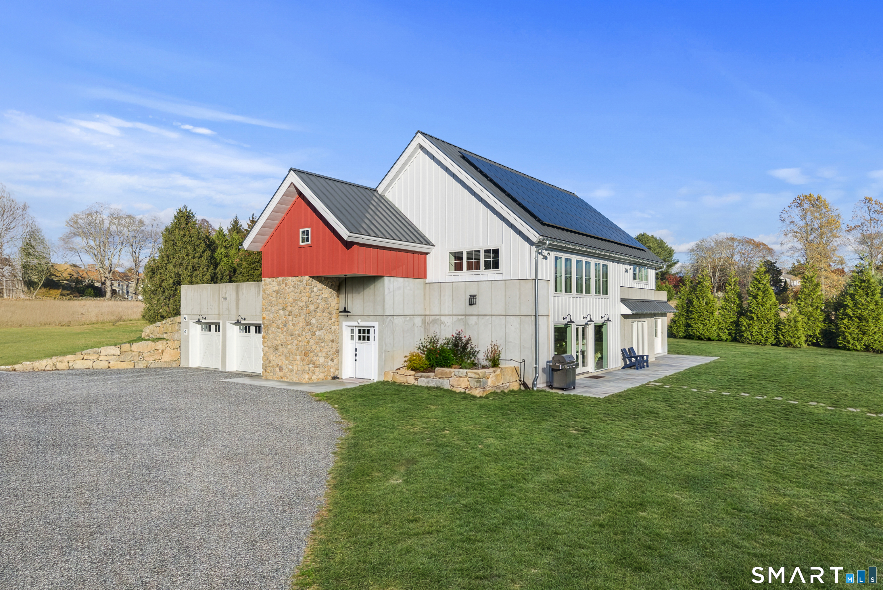 Discover a New-Generation Modern Farmhouse set on 7.3 pristine acres on one of the most coveted addresses in Historic Stonington. Once Colonial Farmland, now a Masterfully Designed Private Estate combining timeless character with cutting-edge performance. This 3 Bedroom 2 and 1/2 Bath home was thoughtfully constructed in 2019 to the highest Passive House, Net Zero Plus, and extreme weather-resilience standards. Enjoy a stunning First-Floor Primary Suite retreat with sauna and the spa-like heated-floor bath designed for two, walk-in closet, and glass doors opening to the patio, create a serene private sanctuary. Adjacent, a sun-filled exercise/recreation room and is ideal for a gym, studio, or indoor garden. The expansive open-concept living and dining space is anchored by soaring 30-foot post-and-beam ceilings and a striking gas fireplace, perfect for elegant entertaining and everyday comfort. The Chef's Kitchen is impeccably appointed with GE Wall oven, Sub-Zero refrigeration, Wolf induction cooktop, Miele commercial dishwasher, custom cabinetry, built-ins, and a Custom Island with Quartz Countertop. Outdoor living is equally extraordinary featuring a 20'x16' Post and Beam Pavilion, a 40' Bluestone Patio and also includes a Custom Rock-Enclosed Outdoor Shower. Infrastructure is already in place for a 40-foot lap pool, including electricals and equipment slab. Many Recent upgrades including professional landscaping.