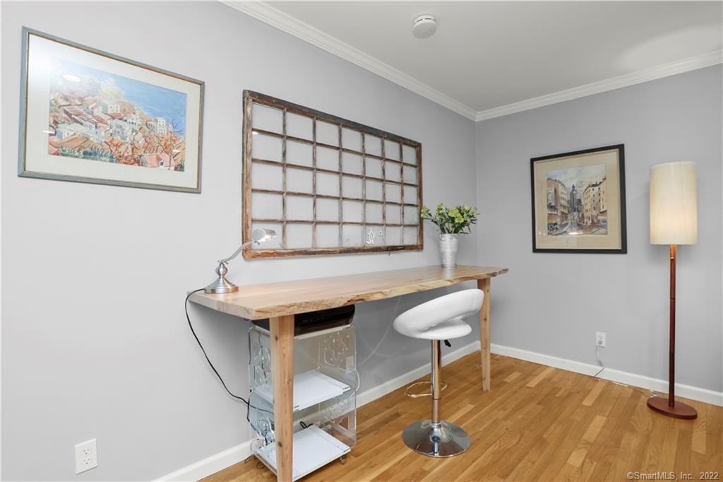Prepare to be wowed by this stunning two bedroom, first floor corner unit condo in the desirable Mosswood complex located in Fairfield Center just steps away from the train station and downtown. No details were spared for this rental. As you enter you are invited by the bright, open concept living space. The formal dining room w/wainscoting can accommodate a large dining table. The dining room flows into the spacious living room perfect for a sectional couch and custom built-ins w/TV console. There is an office nook which includes a custom live edge wood table. The living room also leads out to a covered porch. Show-stopping kitchen w/beautiful white shaker cabinets, glass subway backsplash, st/st appliances including gas range, and quartz counters. There is also a combo washer/dryer unit in the kitchen. The tastefully appointed primary bedroom has two closets, one is a walk-in closet and the other is a double door closet. Primary en-suite bath complete w/new custom vanity and newly renovated shower w/subway tile. The second bedroom also has a walk-in closet and updated en-suite bath. Hardwood floors throughout the living areas and bedrooms. Convenient forced air gas heat and central air. One reserved parking space and plenty of guest parking spaces throughout the complex. There is a additional storage space in the basement & community laundry facility (if needed) on site. Move right in and enjoy!