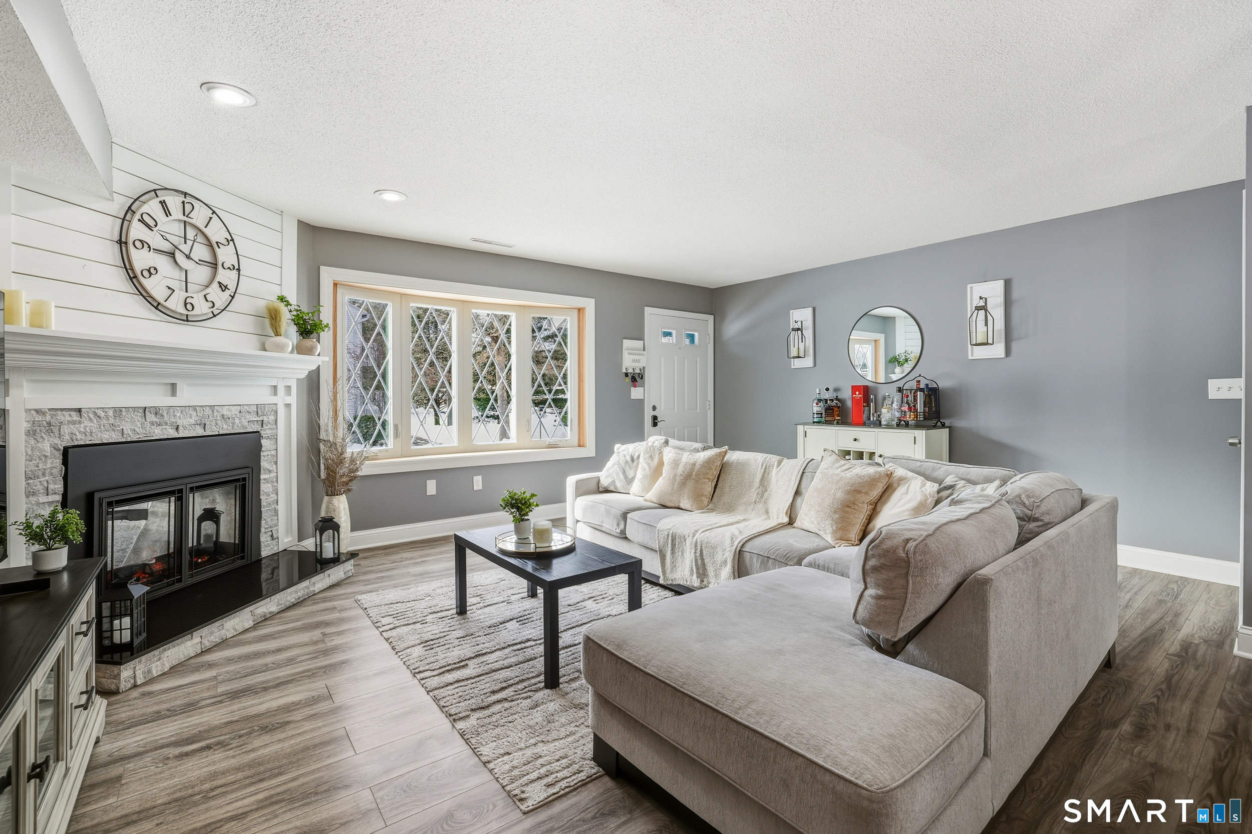 Gorgeous end-unit townhouse in pristine condition in Clearview Hills-nothing to do but move in! This exceptional 2-bedroom, 2.5-bath home offers over 1,520 square feet of beautifully finished living space with upgrades throughout. These highly sought-after units are rarely available, and this is currently the only one on the market. The combined living and dining room features a stunning bay window, a stylish electric fireplace, and a shiplap accent wall, creating a warm and inviting space. The gourmet kitchen offers the perfect layout for cooking and entertaining, featuring rich cherry cabinets, granite countertops, tile backsplash, stainless steel appliances, and a beautiful island with seating, cooktop, and modern hood. French doors lead to a private deck with outstanding scenic views, ideal for morning coffee or evening relaxation. An updated half bath with a quartz-topped vanity and wood accent wall completes this level. The second floor features a spacious primary suite with double closets, sliders to a private balcony, and a remodeled full bath with a beautifully tiled shower, quartz vanity with dual sinks and a shiplap accent wall. The second bedroom also includes its own full bath, a full closet, and a linen closet. Laundry is conveniently located on this level. The lower level offers a finished recreation room and direct access to an oversized one-car garage.