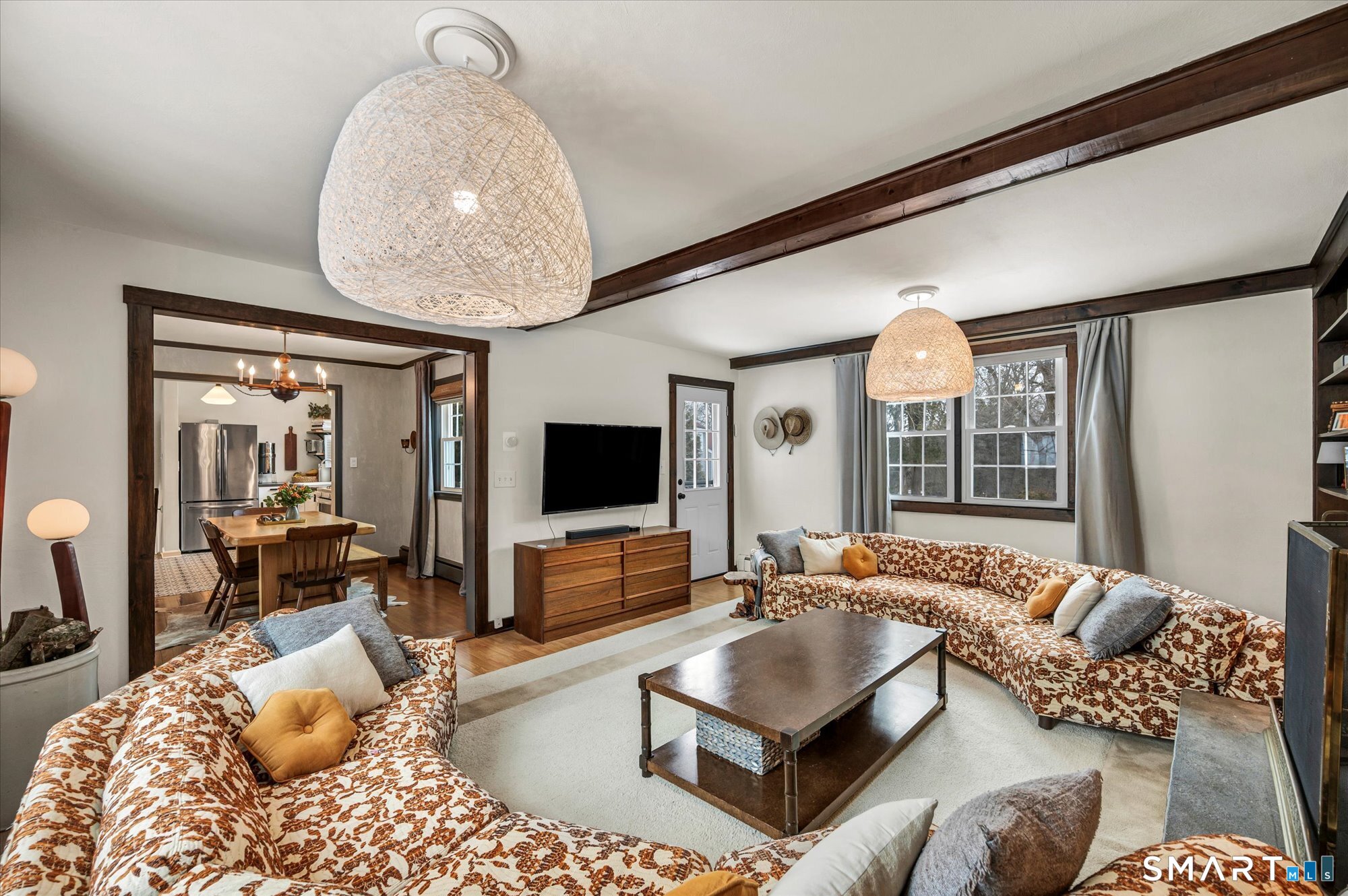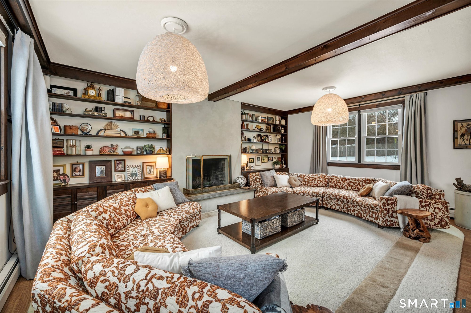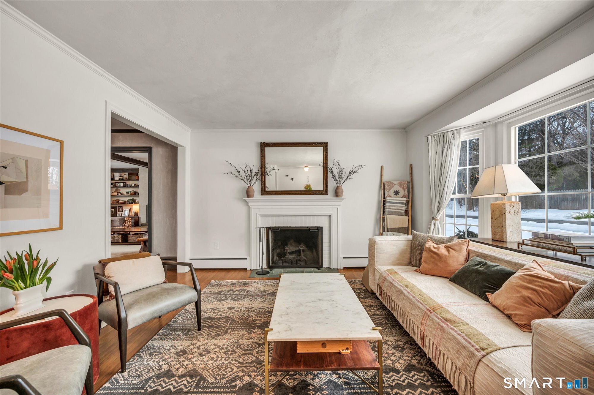 Welcome to 195 Hepburn Road, A meticulously maintained and thoughtfully updated four-bedroom, 21/2-bath home that blends timeless charm with everyday comfort. Step inside to a gracious formal living room anchored by a classic wood-burning fireplace - a warm and inviting space for gathering with family and friends. The updated kitchen showcases modern, custom finishes and flows seamlessly into the dining room and spacious family room, where a second wood-burning fireplace creates the perfect setting for relaxing or entertaining. Upstairs, you'll find three well-proportioned bedrooms along with a full bathroom. Privately situated on its own level, the primary suite offers a peaceful retreat with exceptional privacy. Timeless hardwood flooring runs throughout the home, adding warmth and character at every turn. The lower level provides flexible living space complete with a half bath, playroom, and media room - ideal for movie nights, recreation, or a home office. Outside, beautifully manicured gardens surround a welcoming fire pit area, perfect for quiet evenings or hosting guests. The Trex deck is sure to become a favorite spot during the warmer months - ideal for gatherings or simply enjoying your backyard oasis.