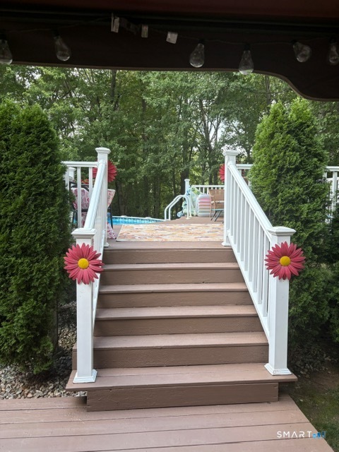 Welcome to 68 Doris Road, a beautifully maintained and thoughtfully updated home nestled in one of Bristol's most sought-after, family-friendly neighborhoods-Rockwood Estates. Set on a private .93-acre lot, this 3-bedroom, 2.5-bath home offers 1,744 square feet of living space plus an additional 600 square feet of finished lower-level space. From the moment you arrive, you'll appreciate the curb appeal, mature trees, and landscaped grounds, creating a serene, park-like setting. The expansive backyard is a true showstopper, featuring a sparkling pool and a stunning two-tiered deck designed for effortless entertaining and gatherings. This outdoor retreat offers rare privacy and generous space to relax or host. The main level boasts a spacious eat-in kitchen with updated appliances, a formal dining room, and a sun-filled front-to-back living room complete with a fireplace and hardwood floors throughout. A convenient half bath completes the first floor. Upstairs, you'll find three well-appointed bedrooms, including an expansive front-to-back primary suite with an ensuite bath and two walk-in closets. An additional full bath serves the remaining bedrooms. The finished lower level provides flexible living space ideal for a family room or home office. Additional highlights include central AC, baseboard heat, and wiring for a full-house generator, ensuring year-round comfort. Located near schools, parks, shopping, and major highways between New York and Boston, this home has it all!