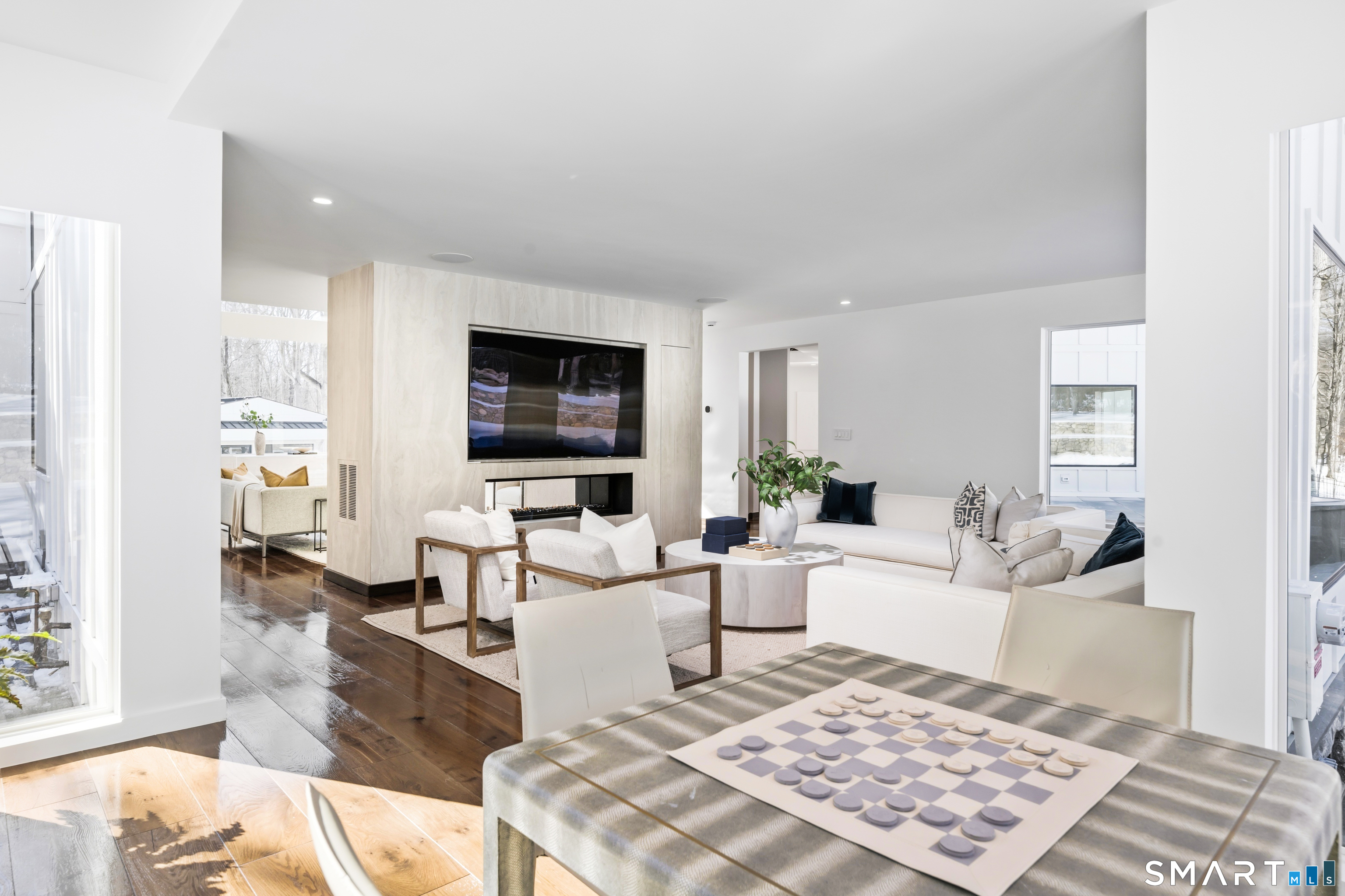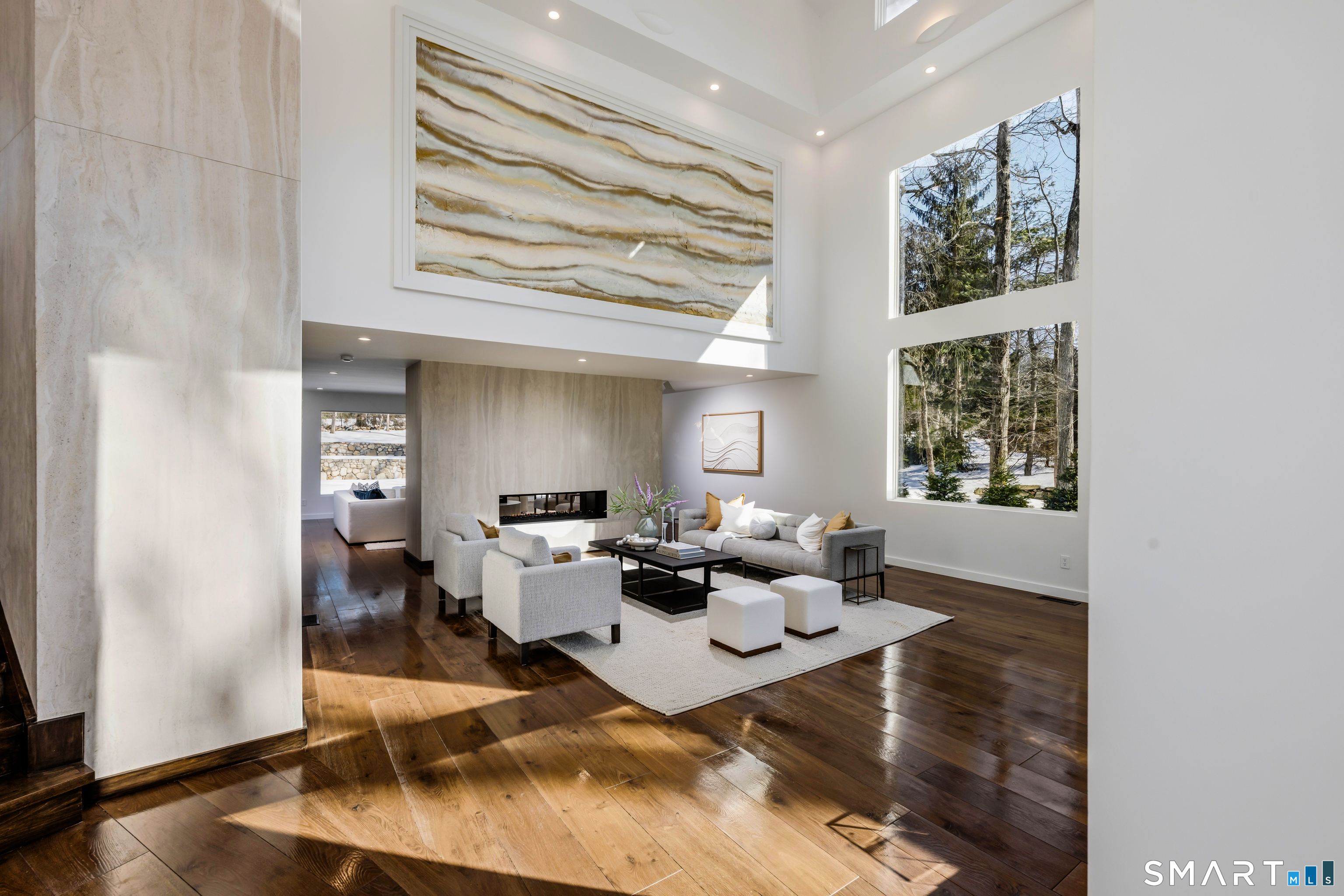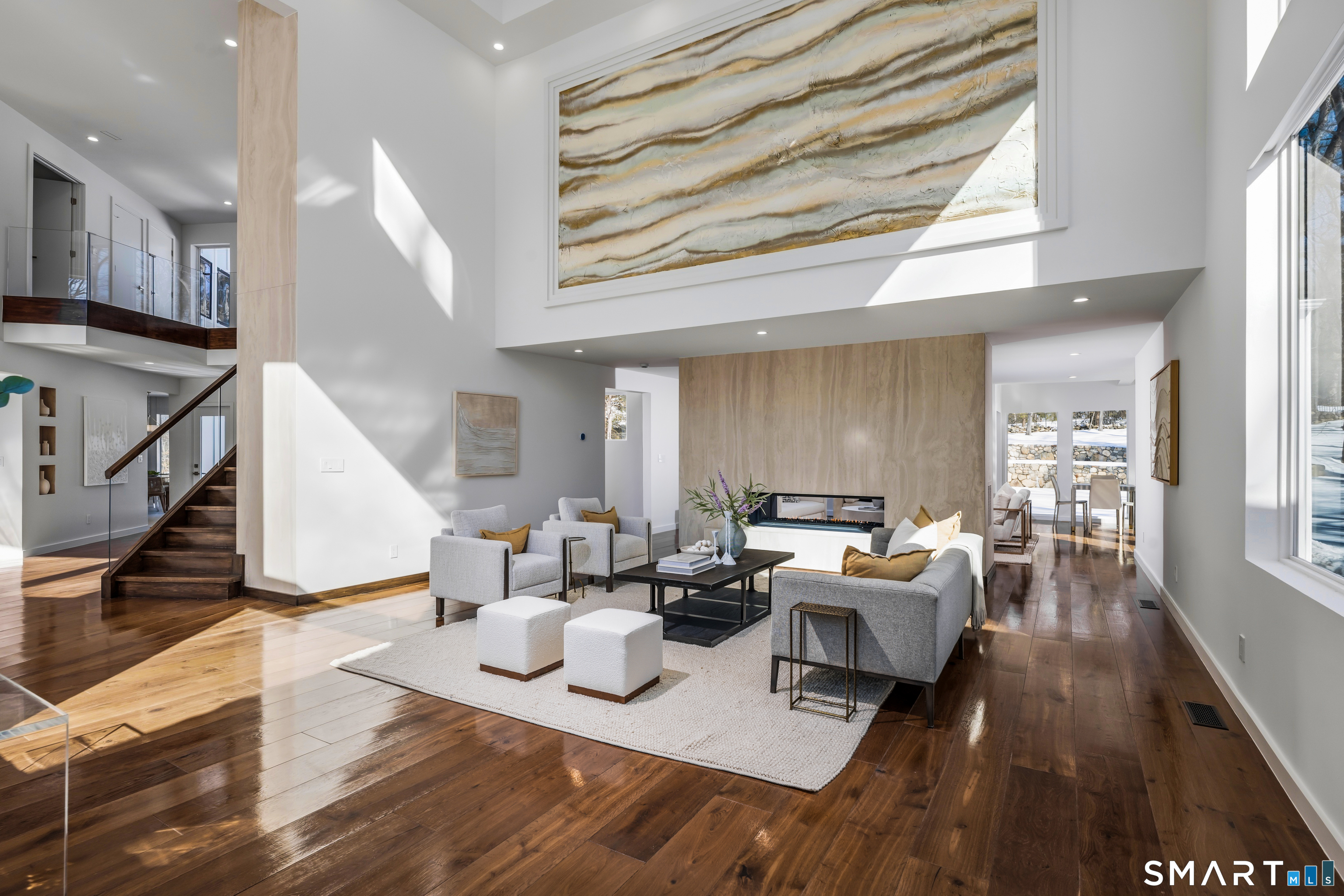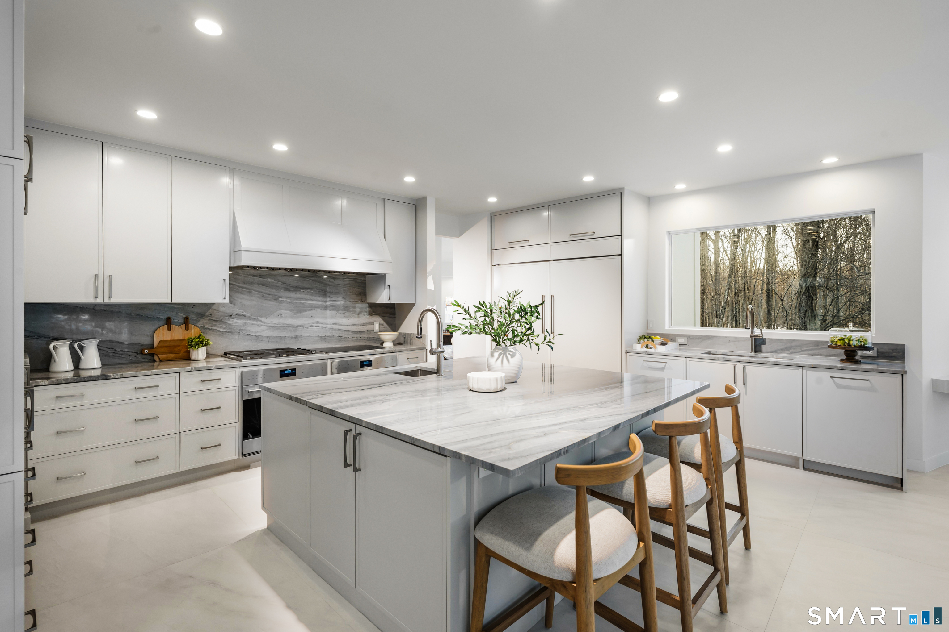 Set within The Ridge in Greenfield Hill, Fairfield's gated residential community, this residence originally designed by renowned architect Bill Blanski has been completely rebuilt and thoughtfully reimagined with the scale and finish of new construction. Spanning over 7,500 square feet, the home offers four bedrooms and six full and two half baths, with wide plank oak floors, multiple fireplaces, and expansive windows that frame tranquil pond views. A double height foyer with floating staircase introduces sunlit living spaces that move naturally from formal rooms to a chef's kitchen appointed with double Sub-Zero and Wolf appliances, quartzite surfaces, and a built-in bar adjoining the family room, while a main level suite provides flexibility for guests or a private office. Upstairs, the primary suite features vaulted ceilings, a fireplace, walk-in closets, and dual marble baths with heated floors, accompanied by two additional en suite bedrooms and a laundry room. The walkout lower level offers additional living space with a fireplace, kitchenette, wine room, full bath, and flexible areas for guests, work, or recreation. Exterior stonework, a metal roof, terraces with fire pit and built-in grill, smart home technology, generator, and all new systems complete the property, with community amenities including a staffed gatehouse, clubhouse, pool, tennis courts, and private roads minutes from Fairfield and Westport town centers, area beaches, and rail access to NYC!