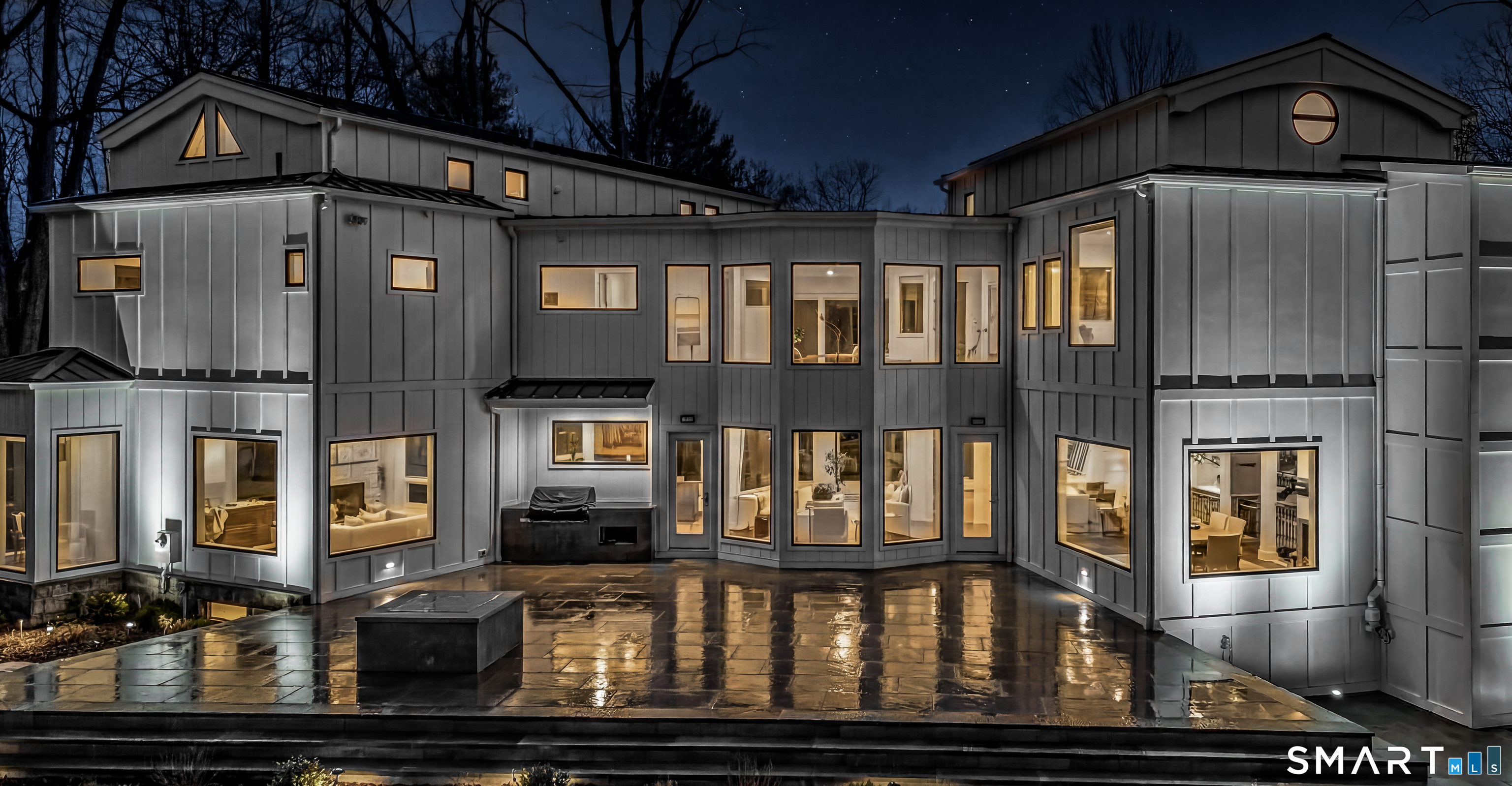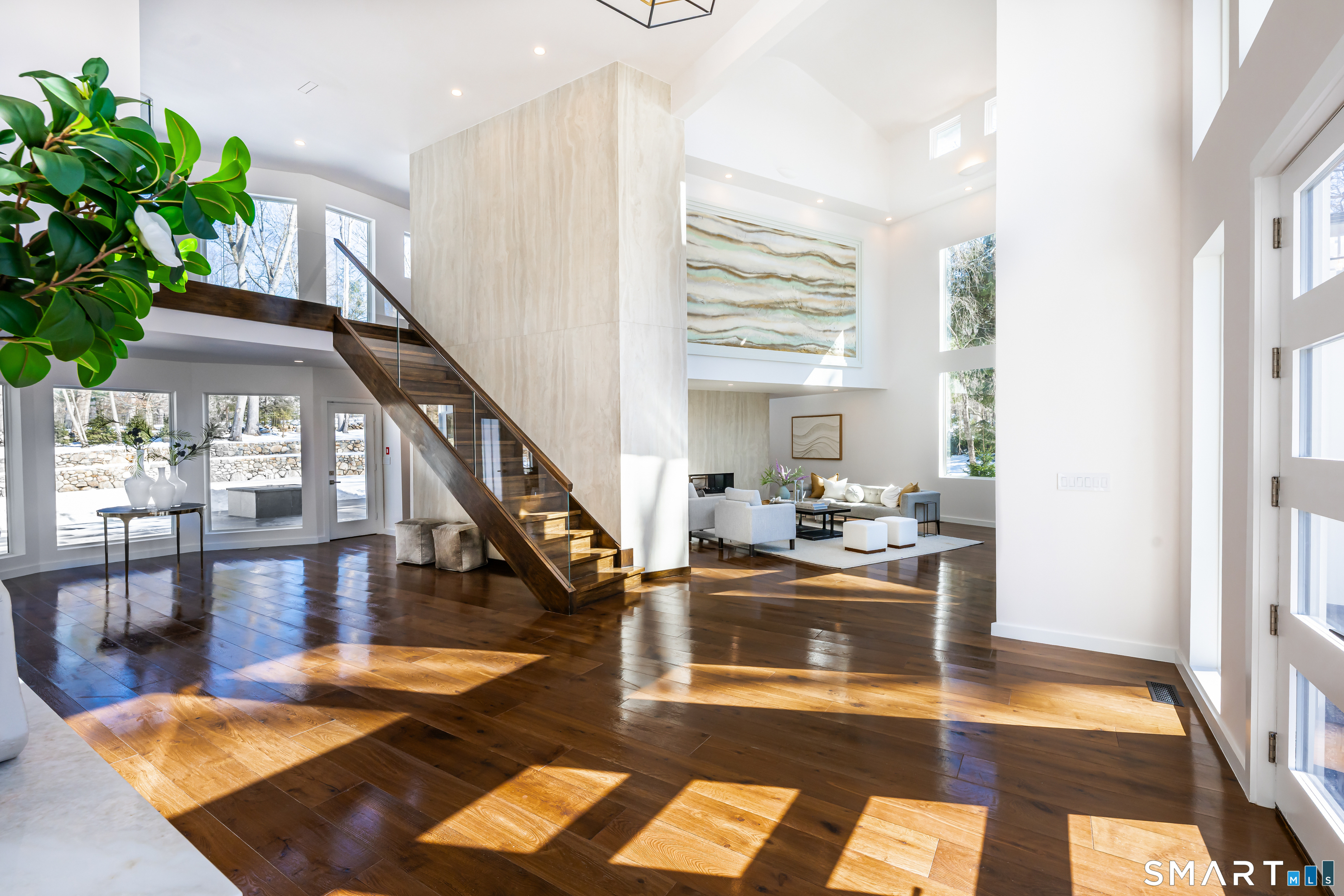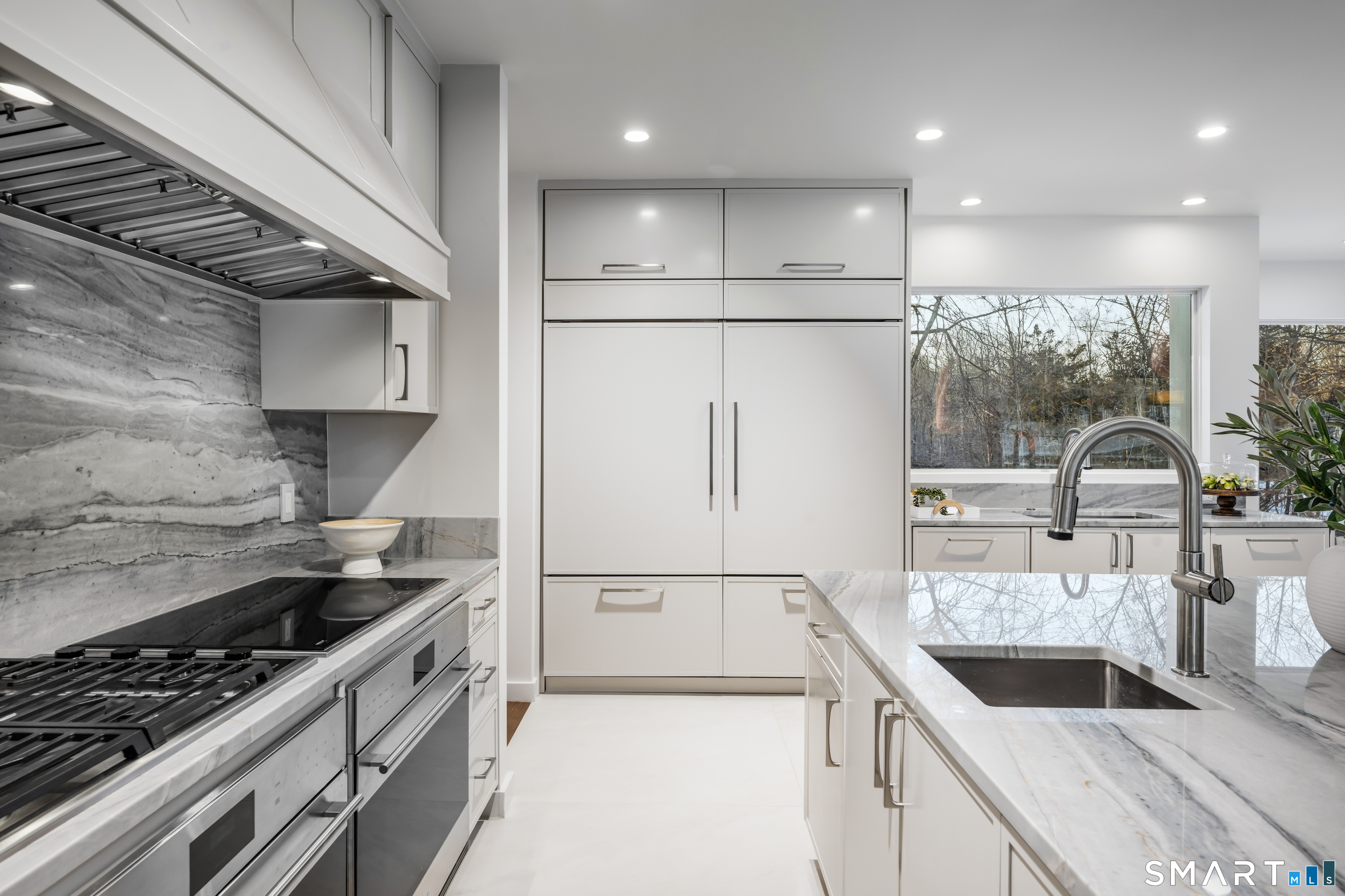 Set within The Ridge in Greenfield Hill, Fairfield's gated residential community, this residence originally designed by renowned architect Bill Blanski has been completely rebuilt and thoughtfully reimagined with the scale and finish of new construction. Spanning over 7,500 square feet, the home offers four bedrooms and six full and two half baths, with wide plank oak floors, multiple fireplaces, and expansive windows that frame tranquil pond views. A double height foyer with floating staircase introduces sunlit living spaces that move naturally from formal rooms to a chef's kitchen appointed with double Sub-Zero and Wolf appliances, quartzite surfaces, and a built-in bar adjoining the family room, while a main level suite provides flexibility for guests or a private office. Upstairs, the primary suite features vaulted ceilings, a fireplace, walk-in closets, and dual marble baths with heated floors, accompanied by two additional en suite bedrooms and a laundry room. The walkout lower level offers additional living space with a fireplace, kitchenette, wine room, full bath, and flexible areas for guests, work, or recreation. Exterior stonework, a metal roof, terraces with fire pit and built-in grill, smart home technology, generator, and all new systems complete the property, with community amenities including a staffed gatehouse, clubhouse, pool, tennis courts, and private roads minutes from Fairfield and Westport town centers, area beaches, and rail access to NYC!
