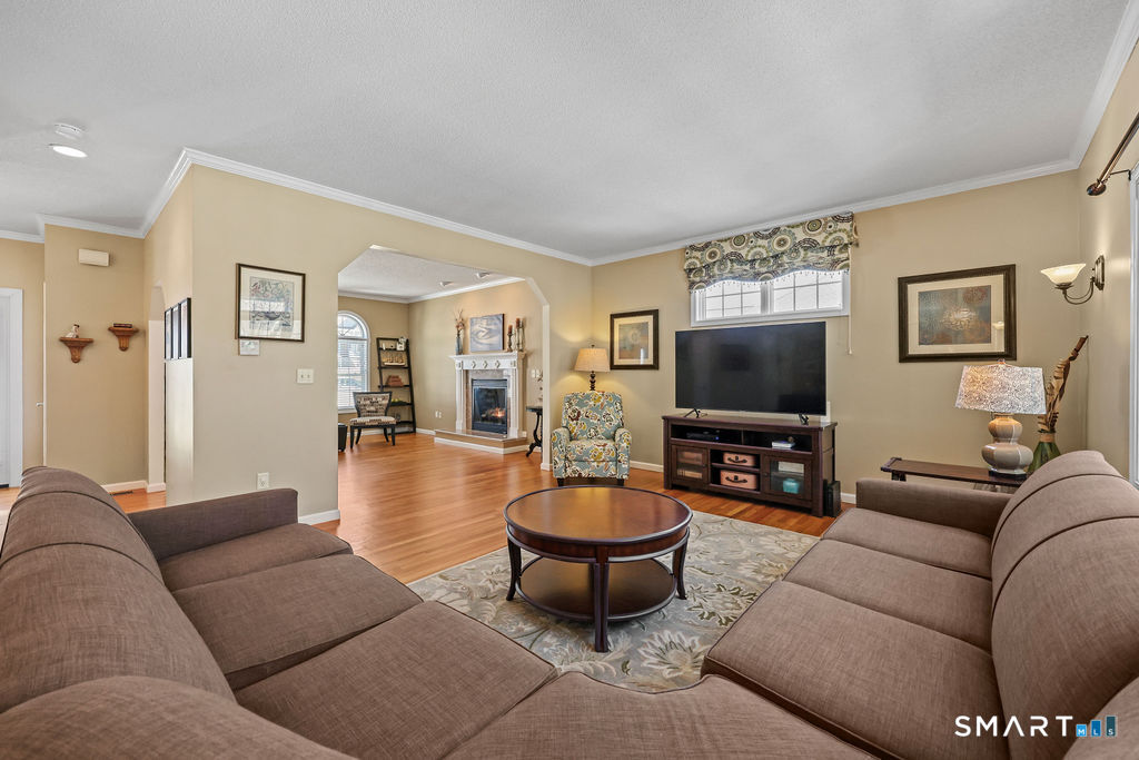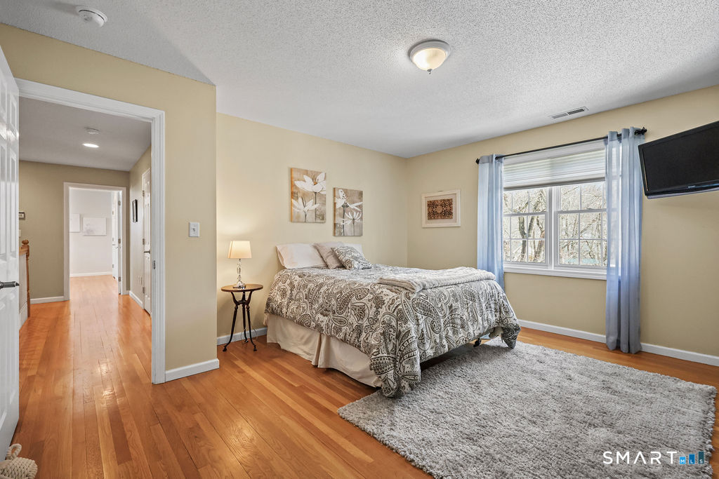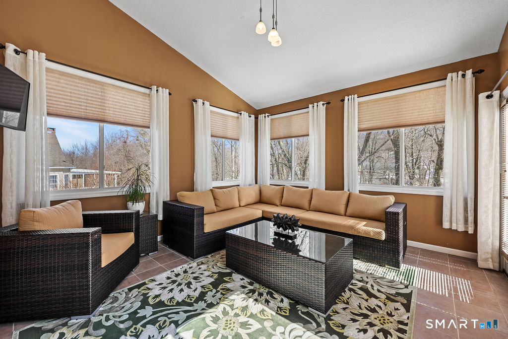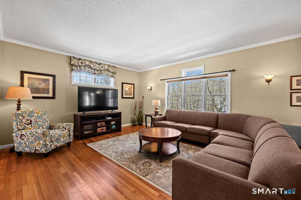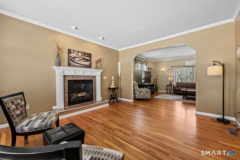 Set on a peaceful double cul-de-sac street, this beautiful modern colonial home blends privacy, charm, and a layout designed for easy living and effortless entertaining. As you arrive, a welcoming covered front porch greets you - the perfect place to enjoy morning coffee, connect with neighbors, or unwind at the end of the day. The property backs to a serene wooded area, providing natural privacy in the rear yard, while the side and front yards offer additional space for play and outdoor enjoyment. A brick patio just off the walkout basement creates an inviting setting for gatherings, grilling, or relaxing in your own backyard retreat. Inside, hardwood floors run throughout the main and upper levels, adding warmth and continuity to the home. The thoughtfully designed floor plan allows for seamless flow, with the family room opening directly to the spacious eat-in kitchen and dining area - ideal for everyday living and entertaining alike. A gas fireplace anchors the living room, adding both comfort and charm. The expansive kitchen is truly the heart of the home, featuring a custom two-tier island with electricity, abundant cabinetry, a large pantry, and generous prep space. Just off the kitchen, a stunning heated sunroom surrounded by windows on all sides fills the home with natural light and offers year-round enjoyment. From there, step onto the deck overlooking the peaceful wooded backyard - a perfect extension of the living space.