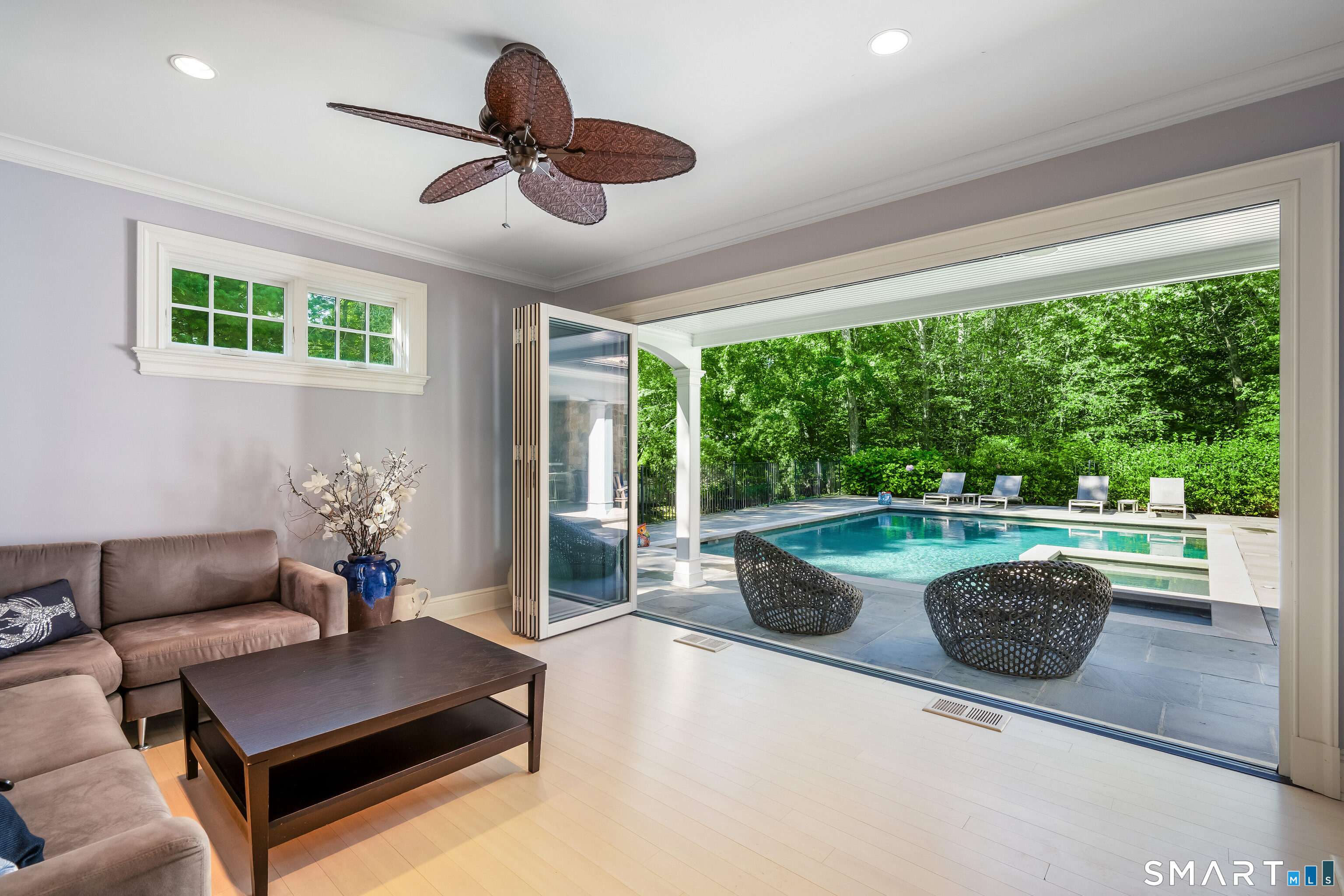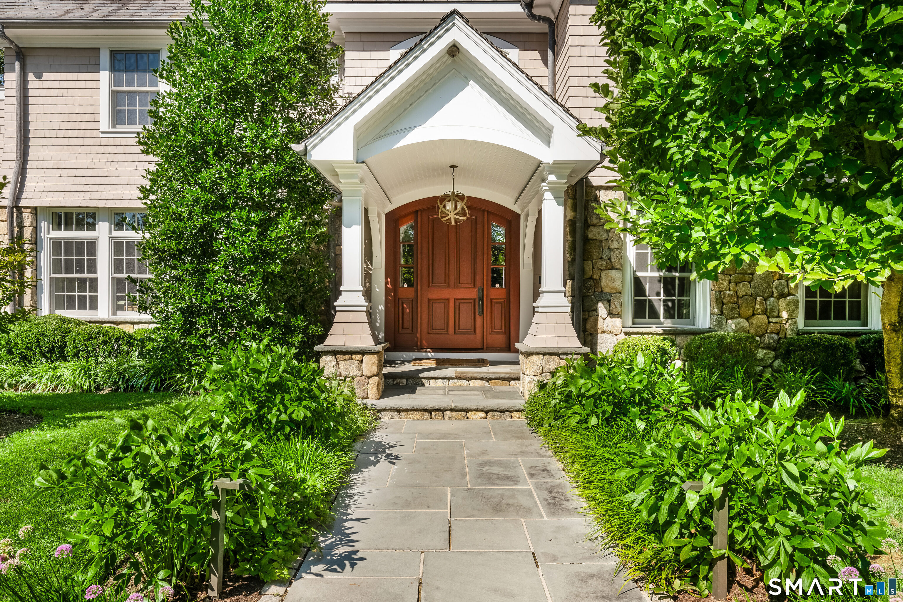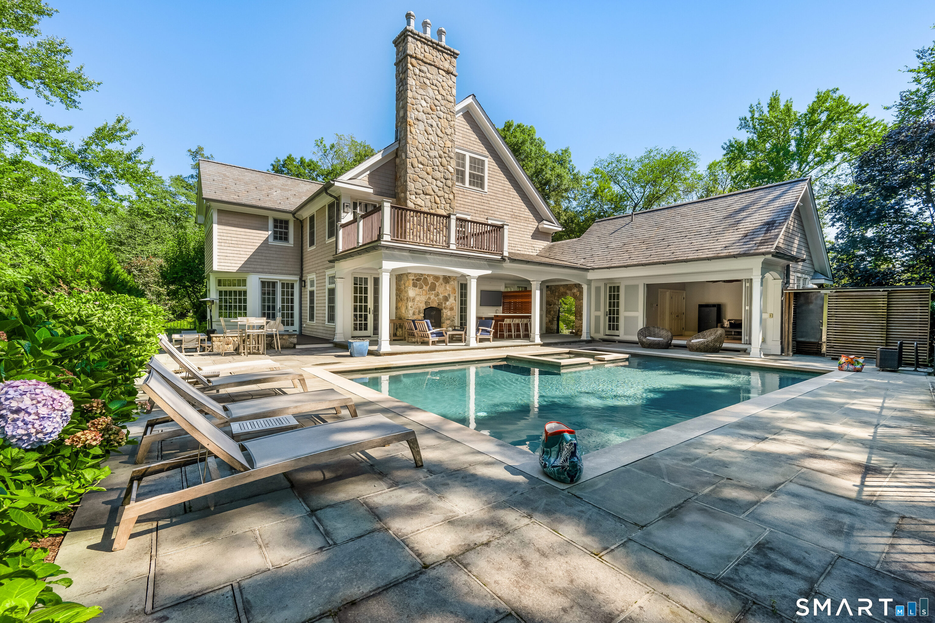 Welcome to 473 Hollow Tree Ridge Road in Darien - a custom built, stone and shingle Colonial set on 1.3 professionally landscaped acres offering exceptional indoor and outdoor living. This 5-bedroom smart home blends timeless architecture with extensive upgrades and modern technology throughout. The resort-style backyard features a pool with spa, pool house with nano doors, outdoor shower, custom outdoor bar, Lynx grill, fireplace, and covered patio. A slate roof, horseshoe driveway, whole-house 25kW Generac generator, and oversized 3-car garage with heated epoxy floors, built-ins, and wainscoting provide both convenience and peace of mind. The fully remodeled kitchen includes a Wolf range, additional wall oven, Sub-Zero double refrigerator/freezer, double islands with prep sink and second dishwasher, Negresco granite and quartz countertops, island seating, and a wet bar with glass dishwasher and ice maker. A paneled office, homework stations, guest/au pair suite with private access, oversized mudroom, laundry, and two powder rooms complete the main level. Upstairs, the primary suite features a renovated spa bath with heated floors, freestanding tub, oversized shower with rain head, and custom walk-in closets. Two additional ensuite bedrooms, a fourth bedroom with hall bath, game room with full wet bar, media room, and office/workstations provide flexible living.