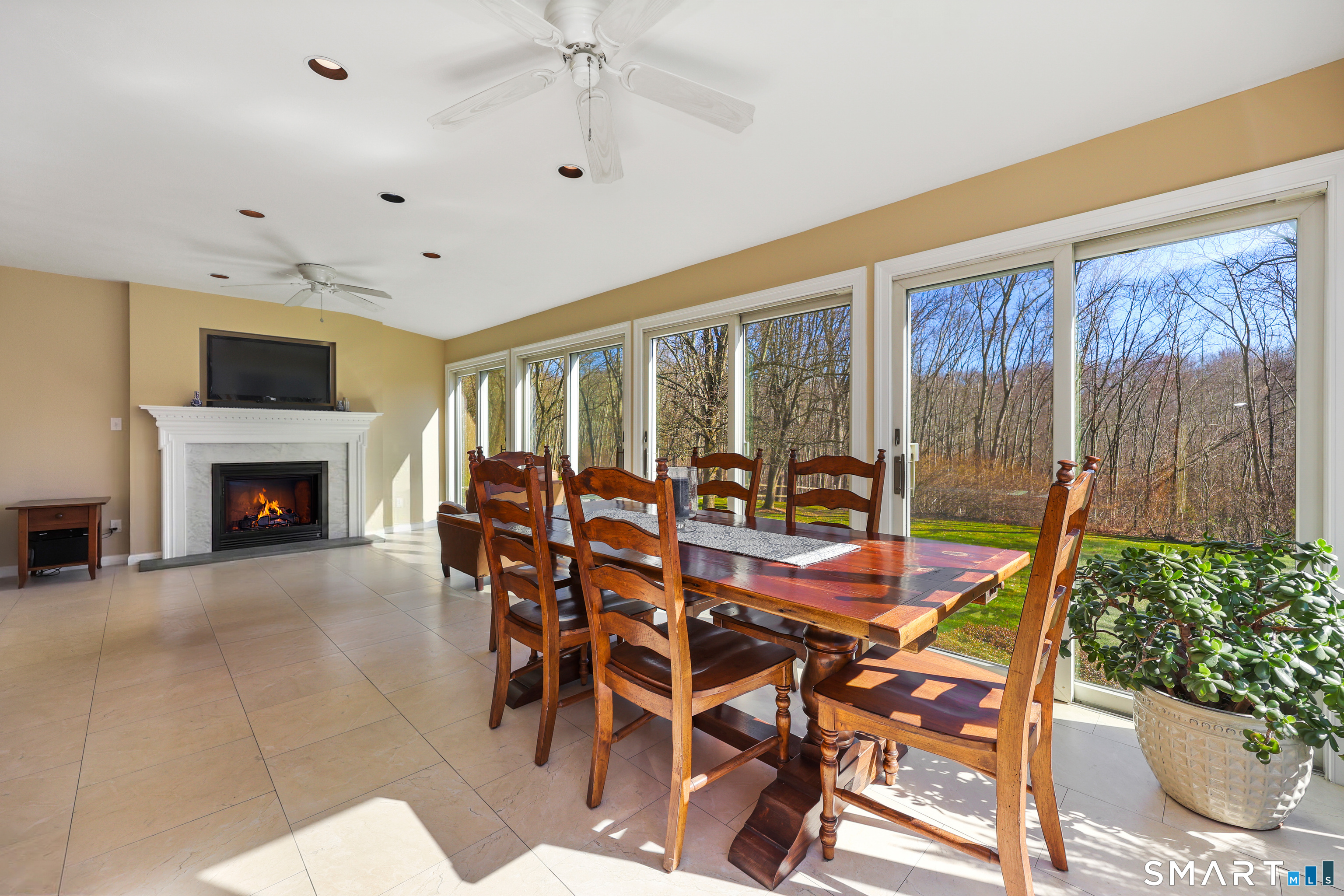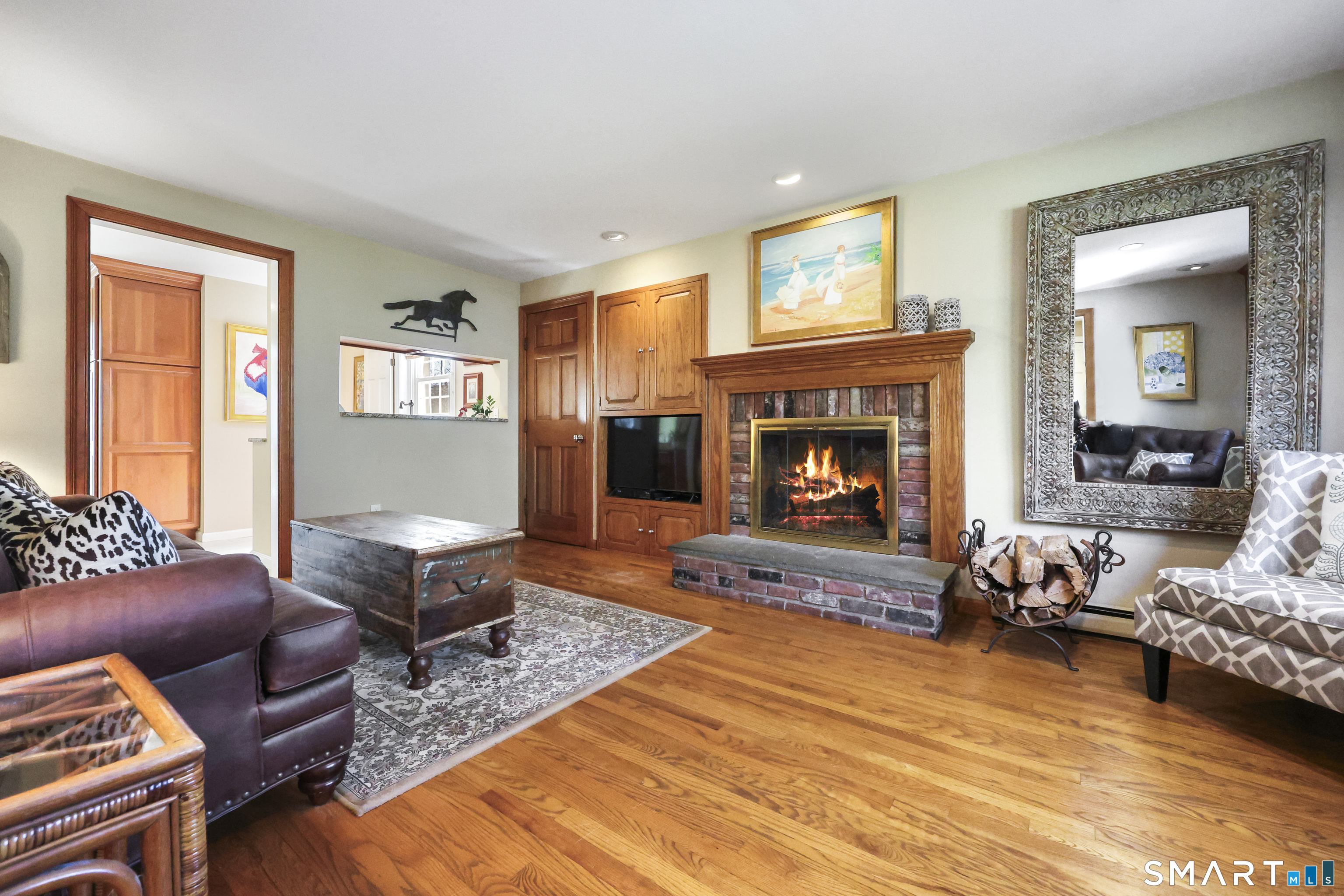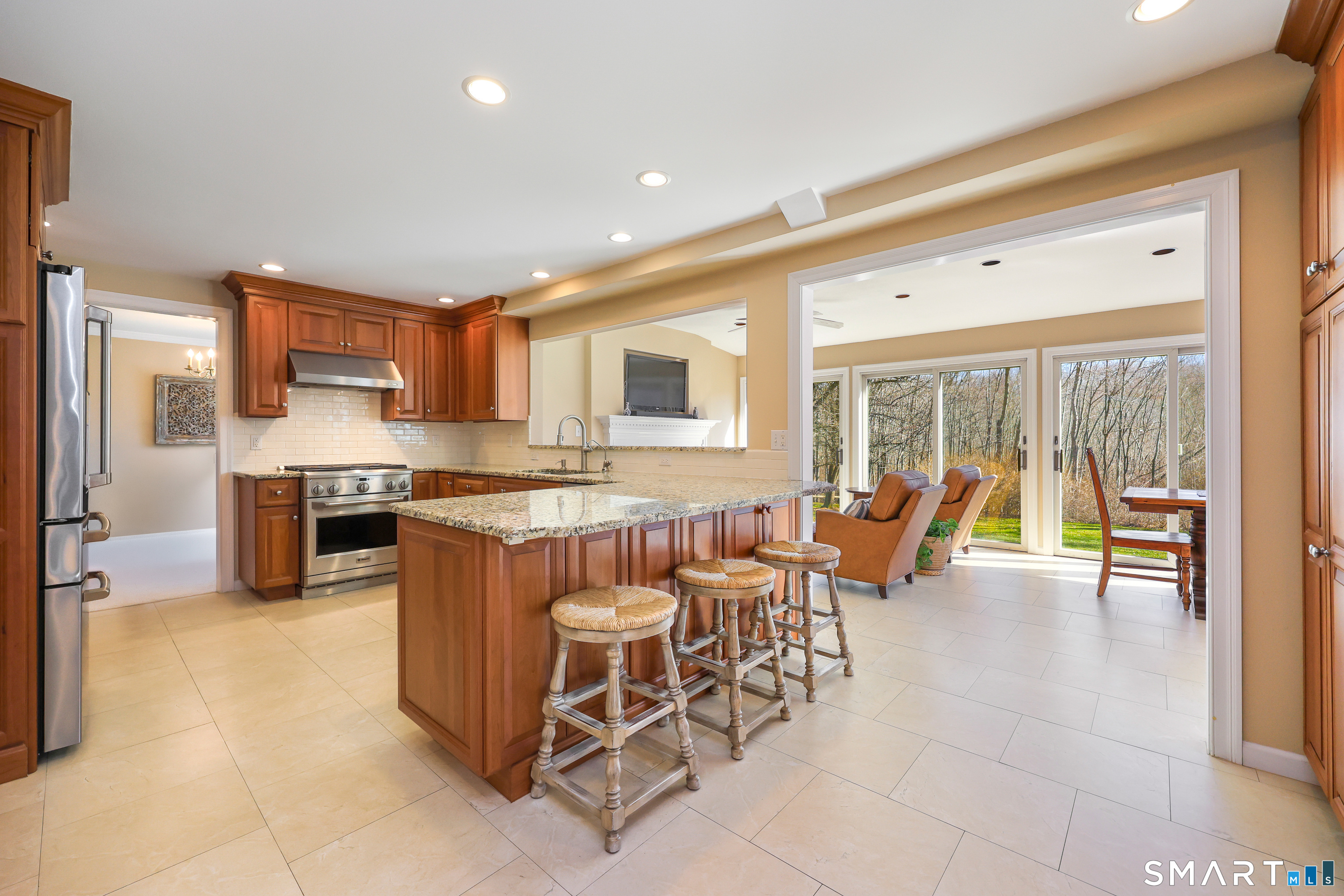 Turnkey living on a flat .57-acre lot in a quiet cul-de-sac with a beautifully manicured yard. This well-maintained Colonial offers 4 bedrooms including a primary ensuite and 2.5 baths. The home features a spacious open living and dining room, plus a comfortable family room with hardwood floors and fireplace. The kitchen with stainless steel appliances and granite countertops opens to a bright sunroom with gas fireplace and wet bar perfect for entertaining. Glass sliders lead to a spacious deck where you can watch beautiful sunsets, while the sunroom overlooks the backyard and fills the home with natural light. Lower level offers a flexible workout or playroom. Convenient to the Merritt Parkway, shopping, and all that Greenwich has to offer.