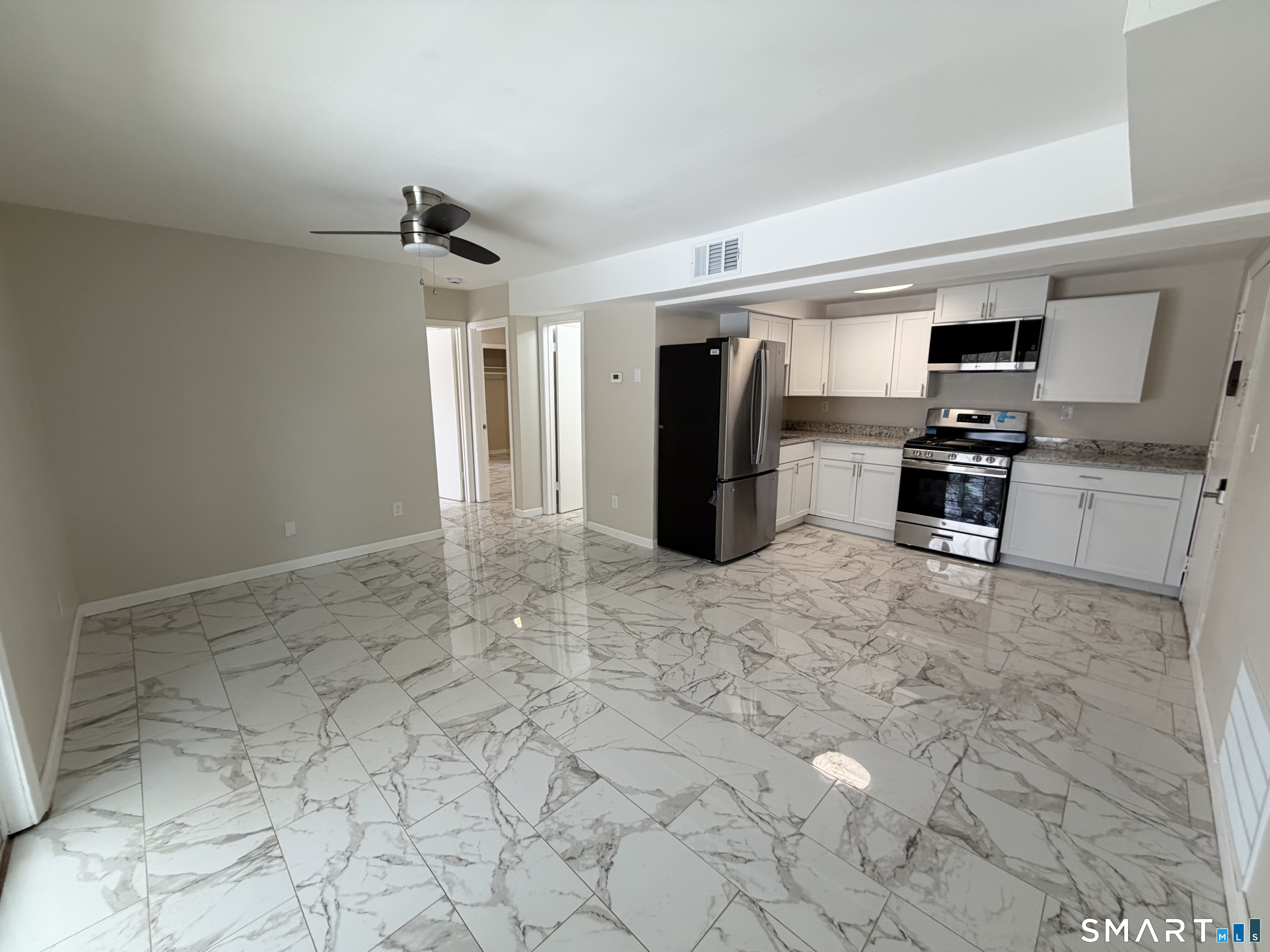 Welcome to Unit 103 at 267 Branford Road a beautifully renovated 2-bedroom apartment offering modern design and spacious open living. This stunning unit features oversized marble-look tile flooring throughout, creating a sleek, high-end feel with easy maintenance. The open-concept layout flows seamlessly into a fully updated kitchen complete with white shaker cabinetry, granite countertops, stainless steel appliances, and ample cabinet space perfect for both everyday living and entertaining. The spacious living area is filled with natural light and offers sliding glass doors leading to outdoor access, adding to the bright and airy atmosphere. Both bedrooms are generously sized with large closets and neutral tones, providing a clean and versatile space to make your own. The updated bathroom features modern tile work, a full tub/shower combination, and contemporary fixtures for a polished finish. Additional highlights include updated lighting, modern hardware, and a fresh, move-in-ready interior throughout. Conveniently located near shopping, dining, and major highways, this beautifully finished unit offers comfort, style, and accessibility all in one.