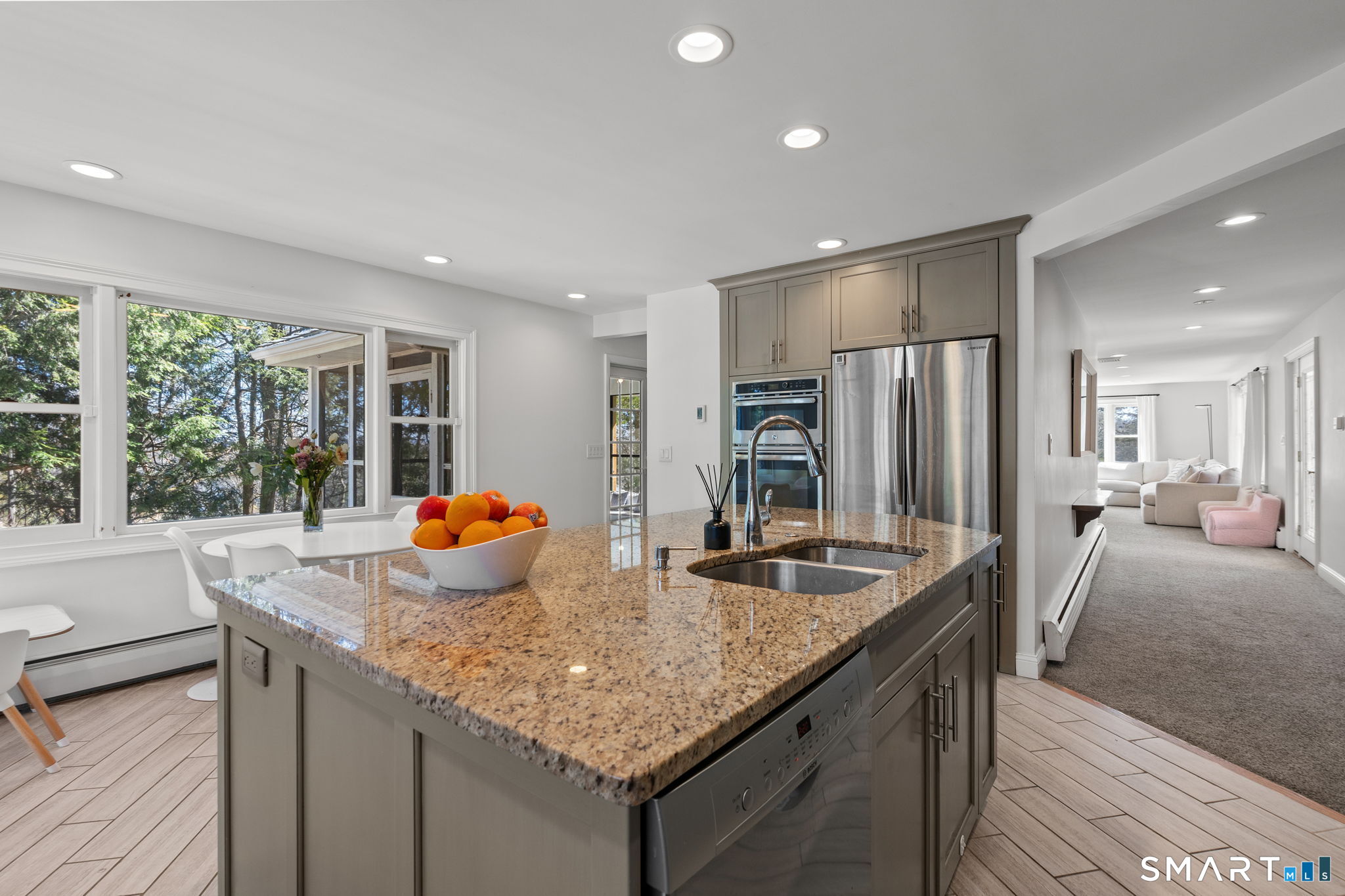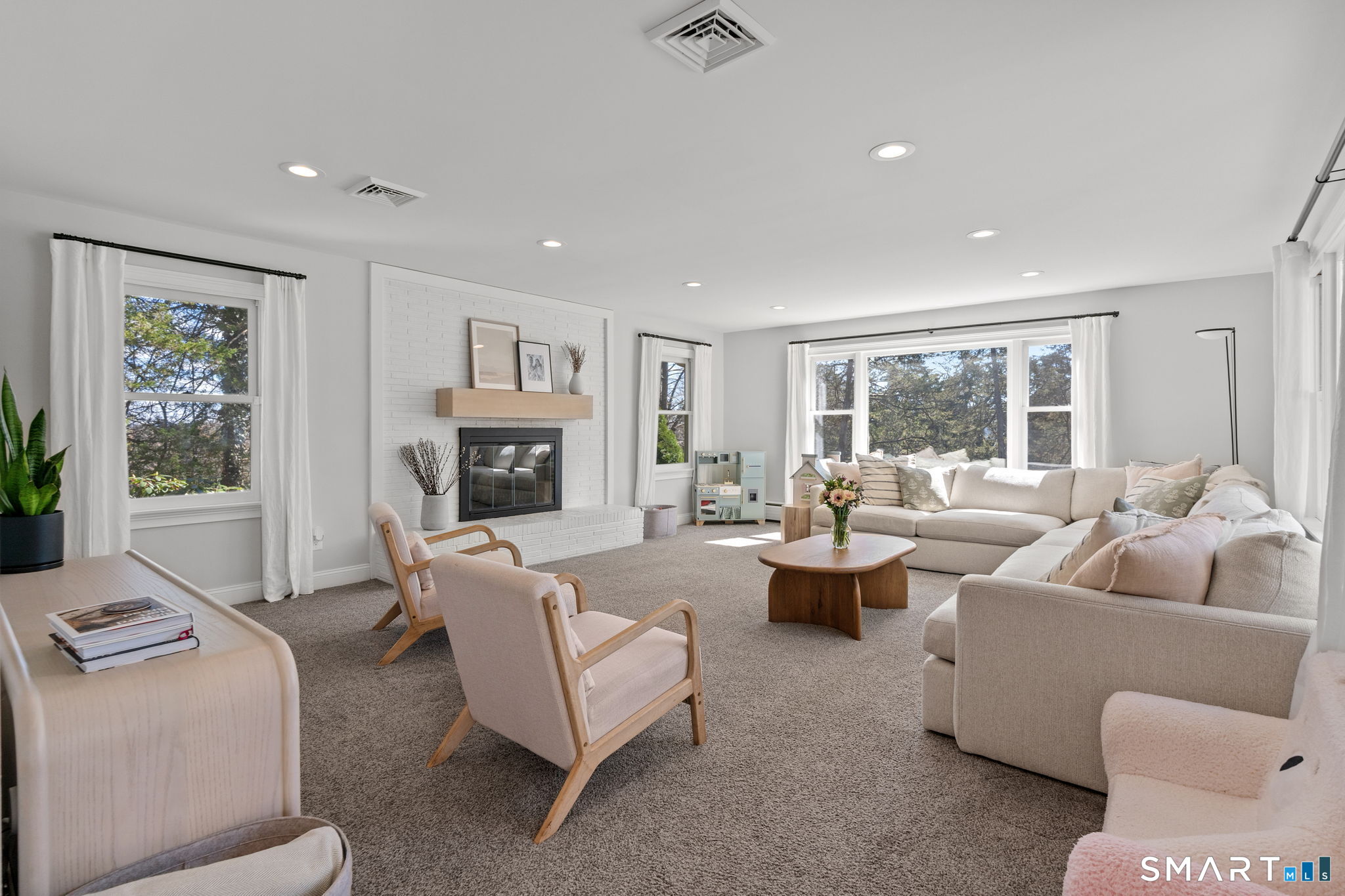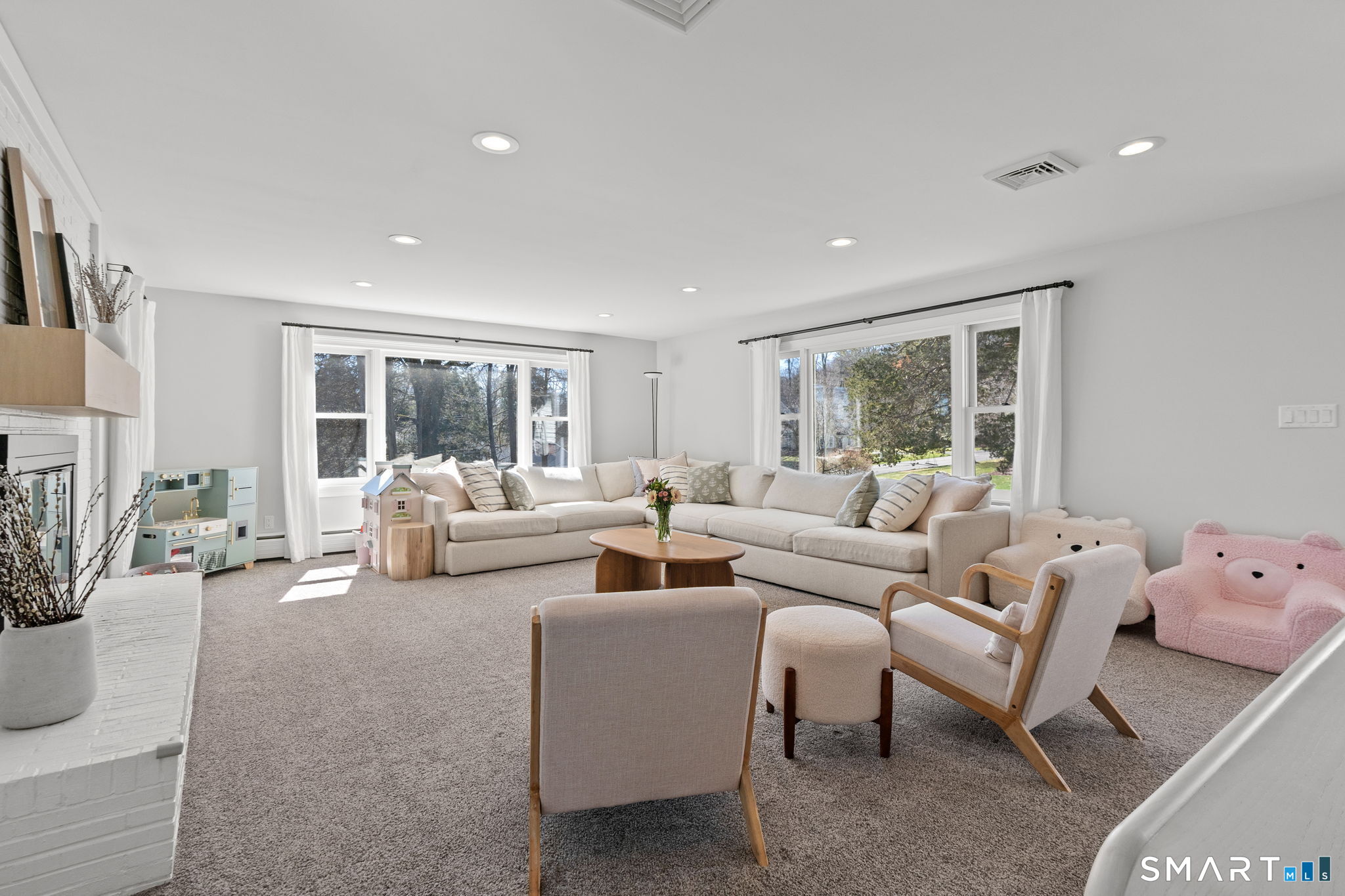 Welcome to 84 High Farms Road, a beautifully updated and thoughtfully designed home set near the top of one of West Hartford's most desirable streets. Offering over 2,600 square feet of living space, this 4-bedroom, 2.5-bath residence is filled with incredible natural light, enhanced by southern exposure and expansive windows throughout. The home features generously sized rooms and a seamless, inviting flow ideal for both everyday living and entertaining. A stunning living room-anchored by a white brick fireplace and walls of windows-creates a warm yet airy gathering space. The gracious dining room connects effortlessly to the updated kitchen. Complete with a large island, high ceilings, abundant workspace, and radiant heated floors, the kitchen also offers direct access to a screened-in porch and a spacious composite deck. Just steps away, an additional family room provides flexible space for a playroom, gym or office. Upstairs, a wide hallway leads to four well-proportioned bedrooms, including a primary suite with an updated en-suite bath and walk-in shower. A beautifully renovated hall bath with double vanity serves the additional bedrooms. Outside, the property shines with professionally landscaped grounds featuring flowers that bloom throughout the spring and summer months, creating a vibrant and welcoming setting.