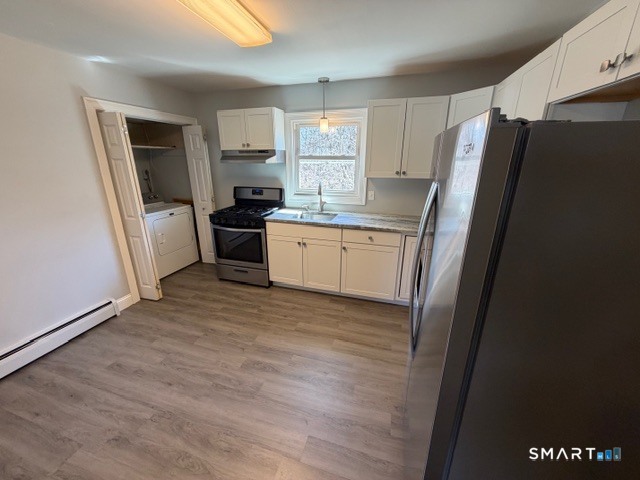 Move right into this beautifully updated second-floor apartment, featuring two bedrooms and one bathroom. Hardwood floors throughout the unit add elegance and warmth to each room. The eat-in kitchen has been completely renovated and includes modern amenities, stove, refrigerator, and recessed lighting. Convenience is at your fingertips with in-unit laundry-washer and dryer are included for your use. This apartment is ideally located just 0.05 miles from the Black Rock Metro-North train station, making it only a 10-12-minute walk for commuters. Easy access to I-95 and the Merritt Parkway makes travel a breeze. You'll also find grocery stores, gyms, and pharmacies within close proximity, ensuring all your daily needs are within reach. Lovely park across street with many amenities. Three on-site parking spaces are available for residents.
