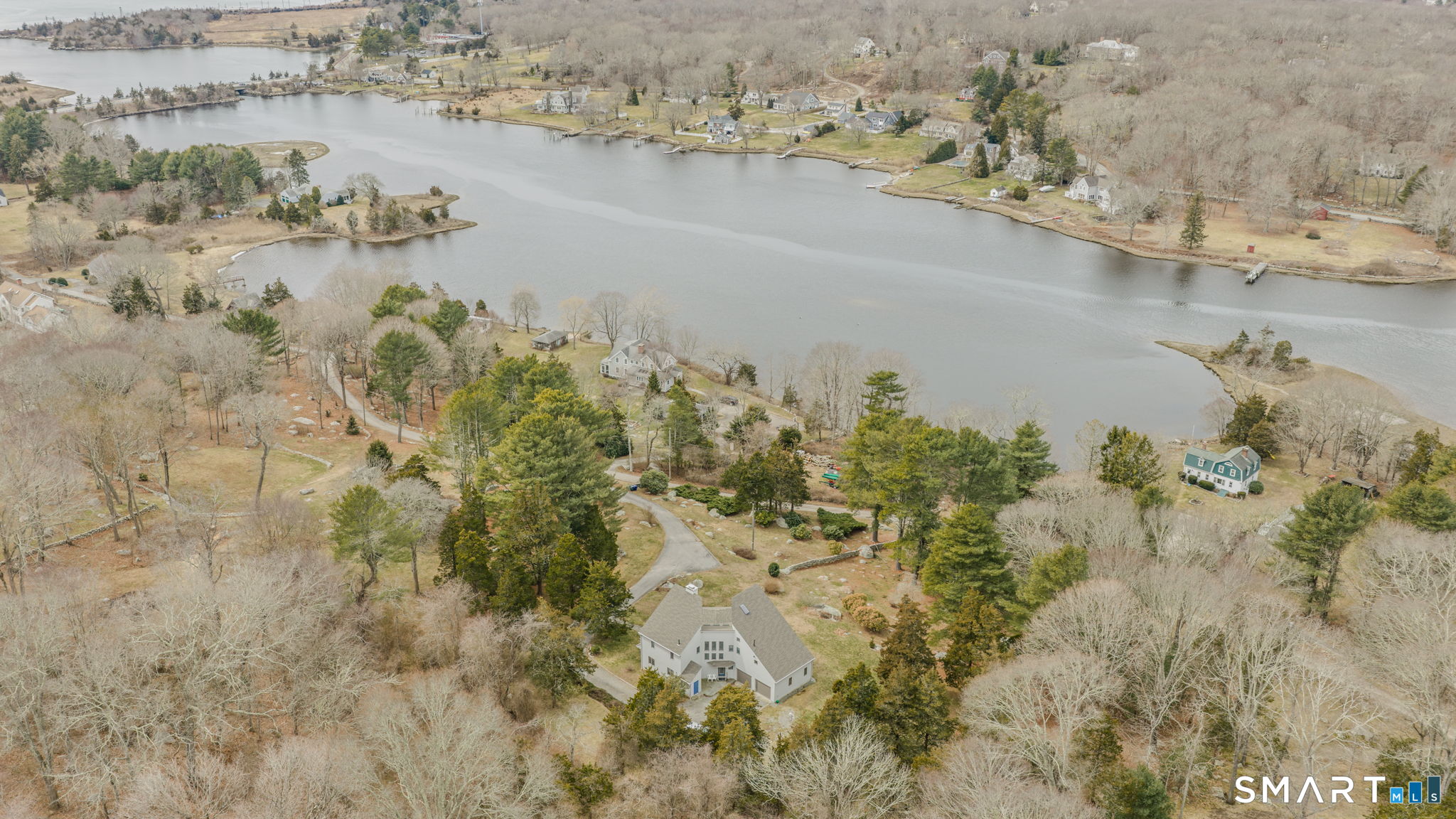 Custom designed one-owner Contemporary home positioned on a 2.29 acre professionally landscaped hilltop w/views & kayak access to coastal inlet Quiambaug Cove. Quiet setting includes stone walls, large garden shed, greenscapes and plenty of birdwatching & natural enjoyment. Home is structured around a floor-to-ceiling stone fireplace with wall of windows overlooking "Azek" covered front porch and cove below. Unique and well appointed kitchen w/cherry cabinetry, terracotta tile & breakfast bar. Living room/dining combination w/vaulted ceiling and brand new skylights. Hardwood flooring throughout. In addition to first-floor bedroom find two oversized bedrooms on 2nd floor, both with modern full baths and generous closet space. A separate updated laundry room w/lots of cabinetry and a folding station also present. Featured on the 3rd floor, via a spiral staircase, is a studio/office w/sweeping views as far as Fishers Island! Full basement, new roof (2025) and efficient "Buderus" heating & hot water system (2024). In addition to all that Stonington has to offer, enjoy vibrant downtown Mystic, Mystic Seaport and access to I-95 just minutes away. Bring your vision to this meticulously maintained home. This is an estate. Note square footage appears to be closer to 2,600 sf.