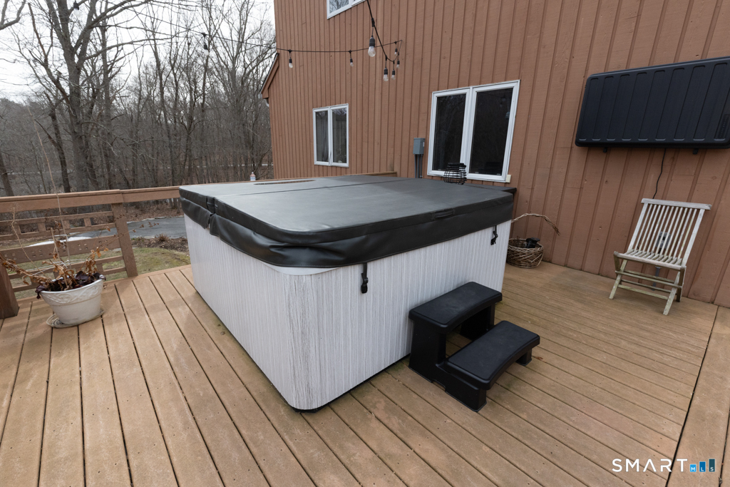 Well maintained home set in a private, nature filled setting. The remodeled kitchen features quartz countertops, while vaulted ceilings and skylights create a bright, airy feel throughout. Step outside to a spacious deck with a hot tub, overlooking beautifully natural landscaping. Additional highlights include central air, a partially finished basement with a convenient half bath, and solar panels that enhance both efficiency and affordability.