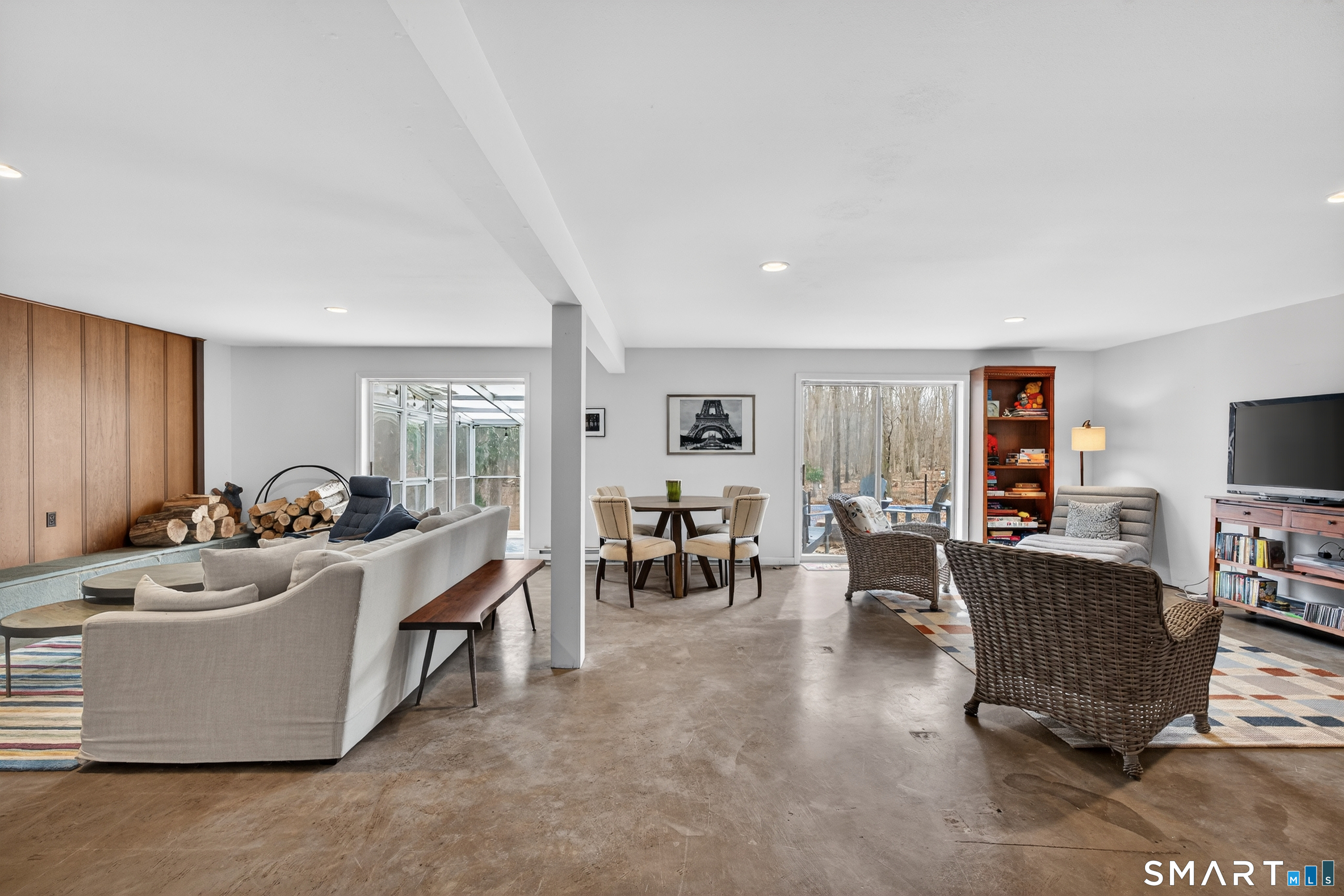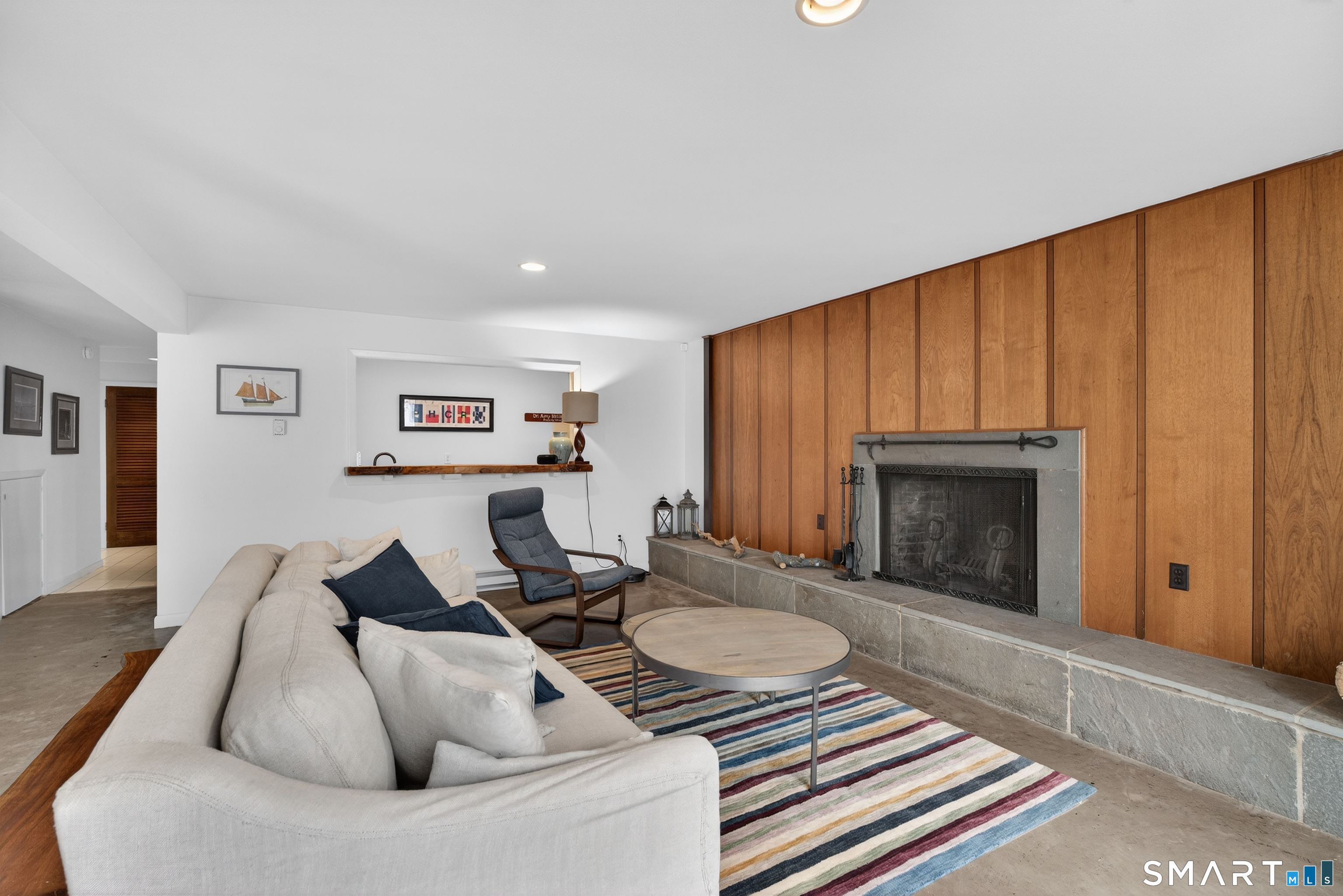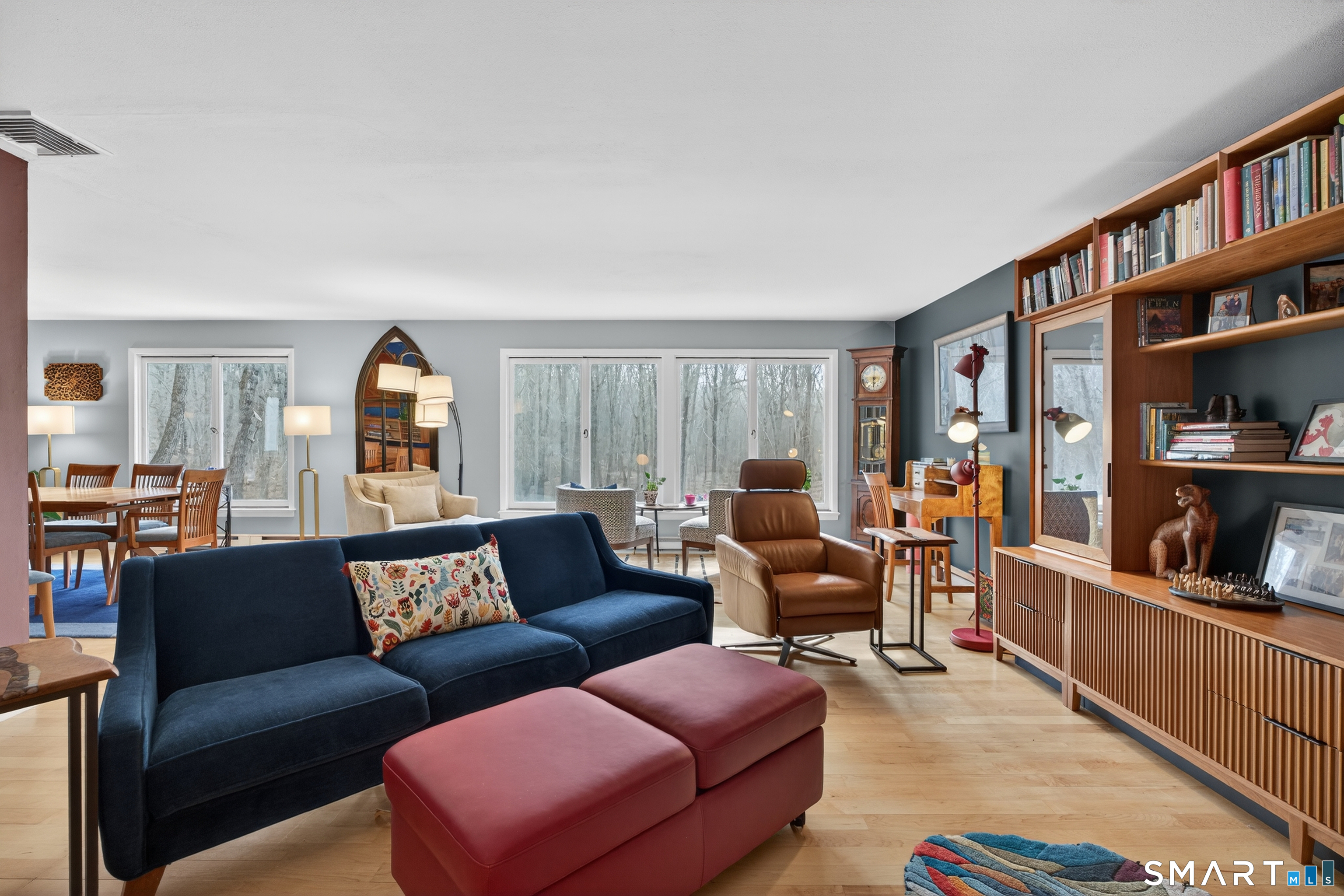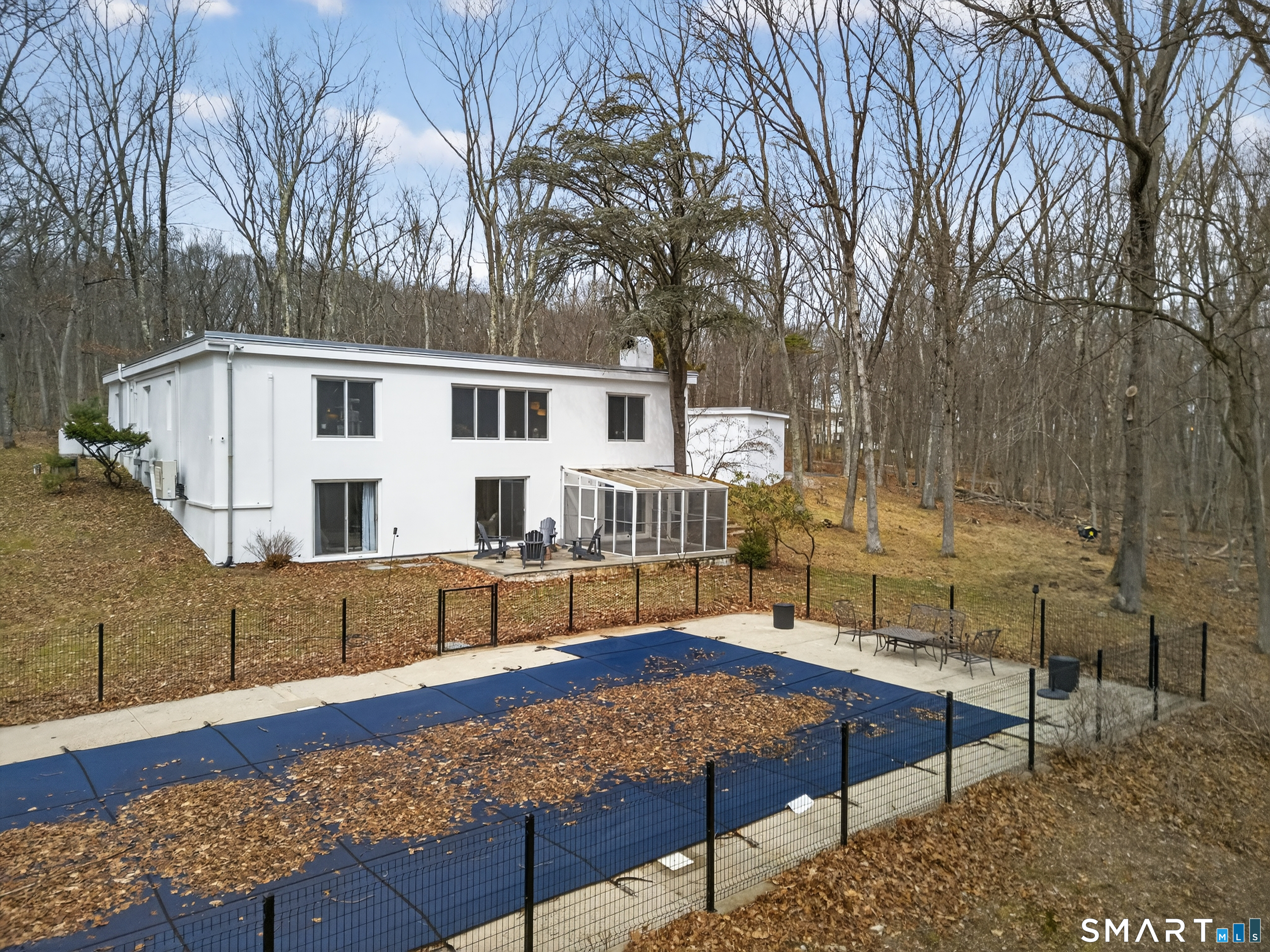 Privately set on 3.4 acres at the end of a cul-de-sac in Hamden's Mount Carmel neighborhood, this contemporary residence offers over 4,000 square feet of living space defined by mid-century modern design. Built in 1968, the home features 5 bedrooms and 3 full baths along with 1 half bath, arranged across a spacious layout with multiple living areas. The main level includes a living and dining area highlighted by expansive windows that bring in natural light and overlook the surrounding grounds. The kitchen connects to the main living spaces, creating a central gathering area. A library with built-in shelving, additional bedrooms, and baths complete the upper level. A distinctive staircase leads to a finished walk-out lower level featuring a large great room with fireplace and wet bar, additional bedrooms, bathrooms, laundry area, and access to a sunroom and outdoor spaces. Exterior features include a screened porch, patio, and pool, set within a wooded setting that offers privacy and open space. Located near local amenities, universities, and major highways, the property is positioned within the Mount Carmel section of New Haven County.