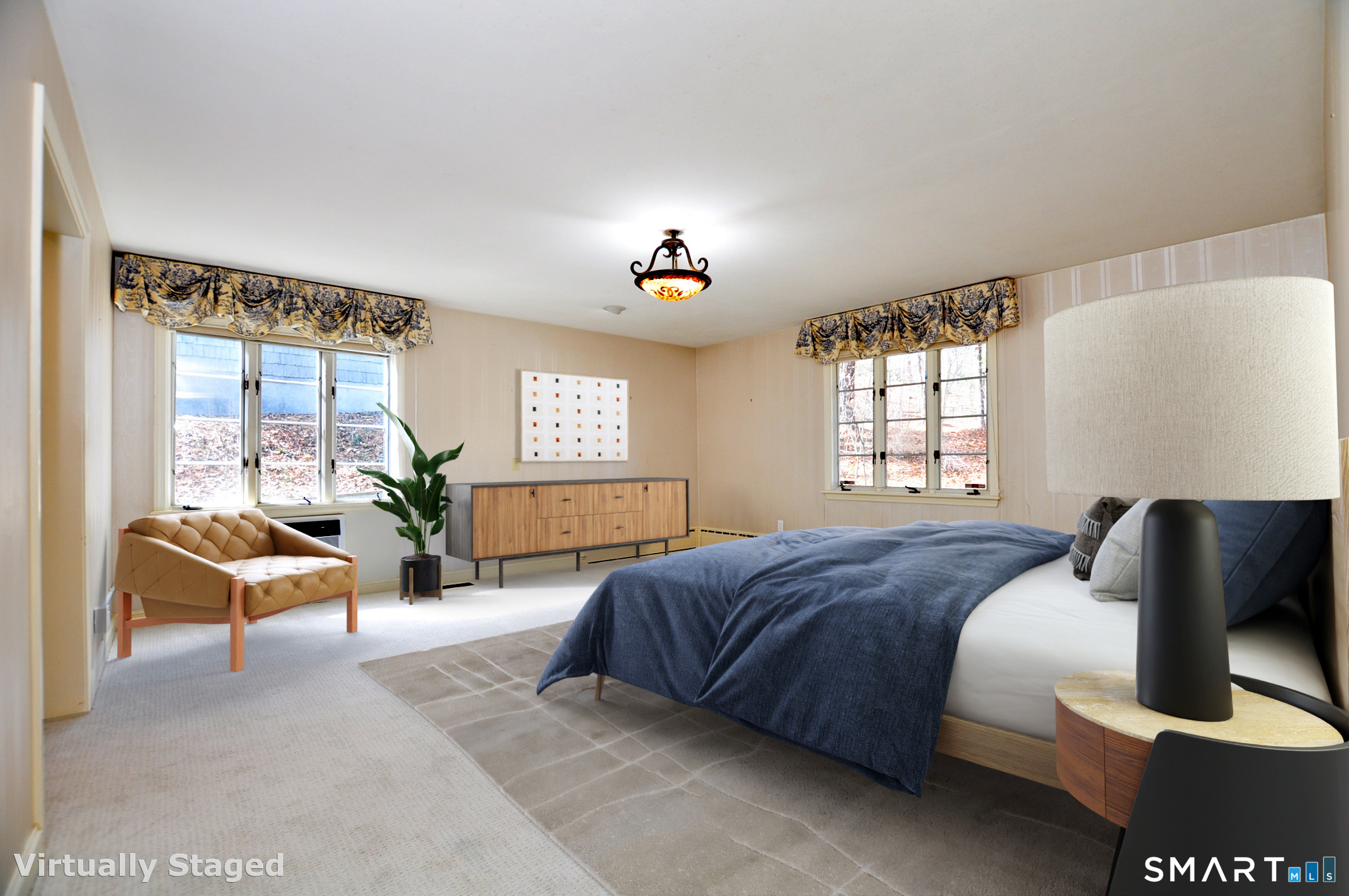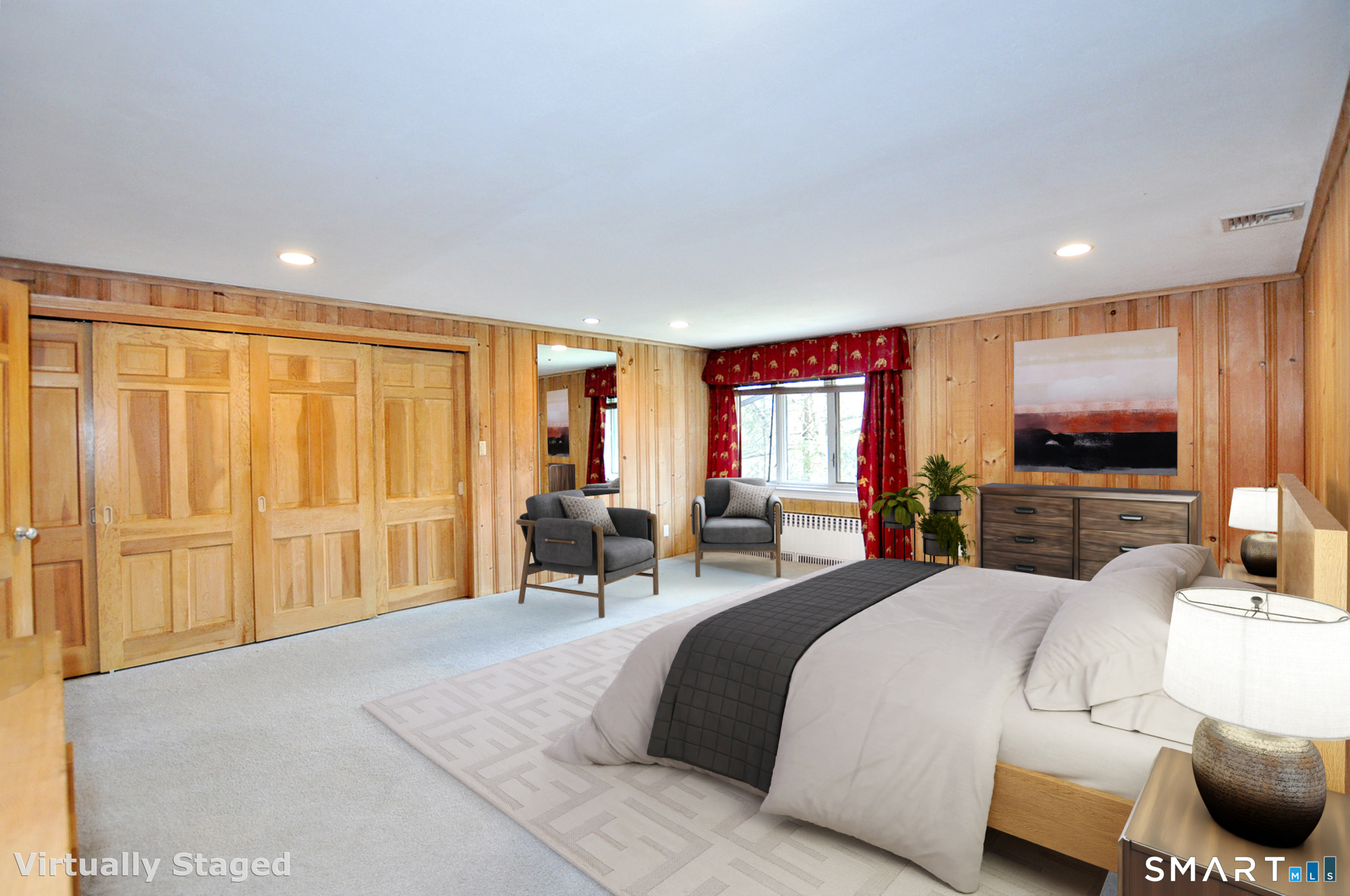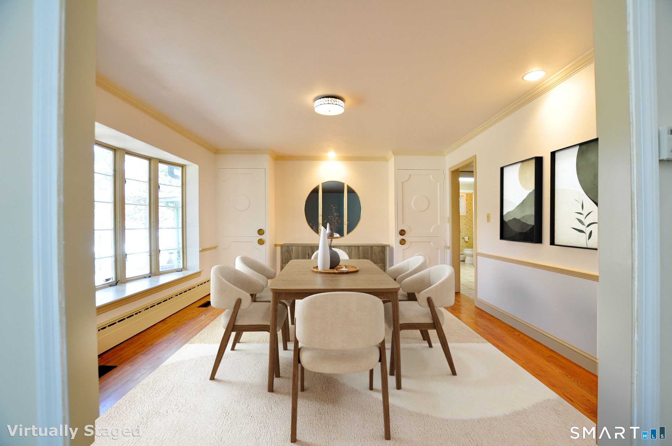 Rare Find!! First floor primary bedroom suite, with full bath and generous walk-in closet. Wonderful sunfilled living room with floor-to-ceiling windows, wide-board stunning new oak floor and a lovely field stone fireplace with raised hearth. Additionally, there is a first floor spacious family room with built-ins, chair-rail molding, bay window, parquet floors and brick fireplace with raised hearth. The formal dining room has a bay window, chair-rail moldings and two cabinets that provide plenty of storage. The large entryway to the home has blue stone flooring with ample closets and sidelites flanking a classic mid-century front door. The eat-in kitchen has birch cabinets, Corian counters, tile back spash, undermounted sink and tile floor, and the eat-in area has views out to patio and lightly wooded lawn. The first floor laundry is kitchen ajacent. A heated sunroom with catherdral ceiling and skylight is accessed from kitchen or living room. The floor plan is perfect for entertaining. Two very large bedrooms and a full bath are located on the second floor. Including tons of storage space and closets. The home is very conveniently located, mere minutes to the reservoir, to hiking and bike trails, Cornerstone pool, tennis, indoor skating rink, and multiple golf courses and fine dining in West Hartford town center, as well as just a few miles to Bishops corner with multiple shops and varied grocery stores.