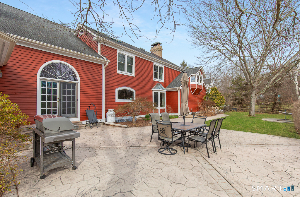 Grand scale & suburban serenity converge in this commanding Colonial, rising gracefully within one of Woodbridge's most coveted cul-de-sacs. 4,707sf of beautifully curated living begins w/ the light-filled foyer spread beneath a soaring ceiling & sweeping 2nd floor catwalk. Rich HW floors, handsome millwork & beams weave warmth throughout the home including the formal living room, home office, & the dramatic, open-concept family & dining rooms which are anchored by a 2-story chimney w/ cozy wood FPs on either side. Vaulted ceilings, exposed beams w/ ambient up-lighting, & French doors w/ half-round transom windows create a symphony of light & scale. Adjoining the family room is a gazebo-style sunroom that steals the spotlight w/ its panoramic picture windows framing the patio, curated gardens, & resort-resemblant pool w/ spa-a private perennial paradise. The expansive eat-in kitchen pairs performance w/ polish via granite counters, premium appliances, a pantry, breakfast bar, & bay-window dining area warmed by another magnificent stone FP. Upstairs, the primary suite suits royalty w/ its dedicated balcony, towering ceilings, walk-in closet, & luxurious tiled bath. 4 additional BRs provide remarkable space & storage. A main-level laundry hub, 3-car garage, 400-amp underground service, sprinkler system, & many thoughtful updates throughout ensure enduring ease. Minutes to New Haven & set within an award-winning school district, this is not merely a home-it's a lifestyle legacy.