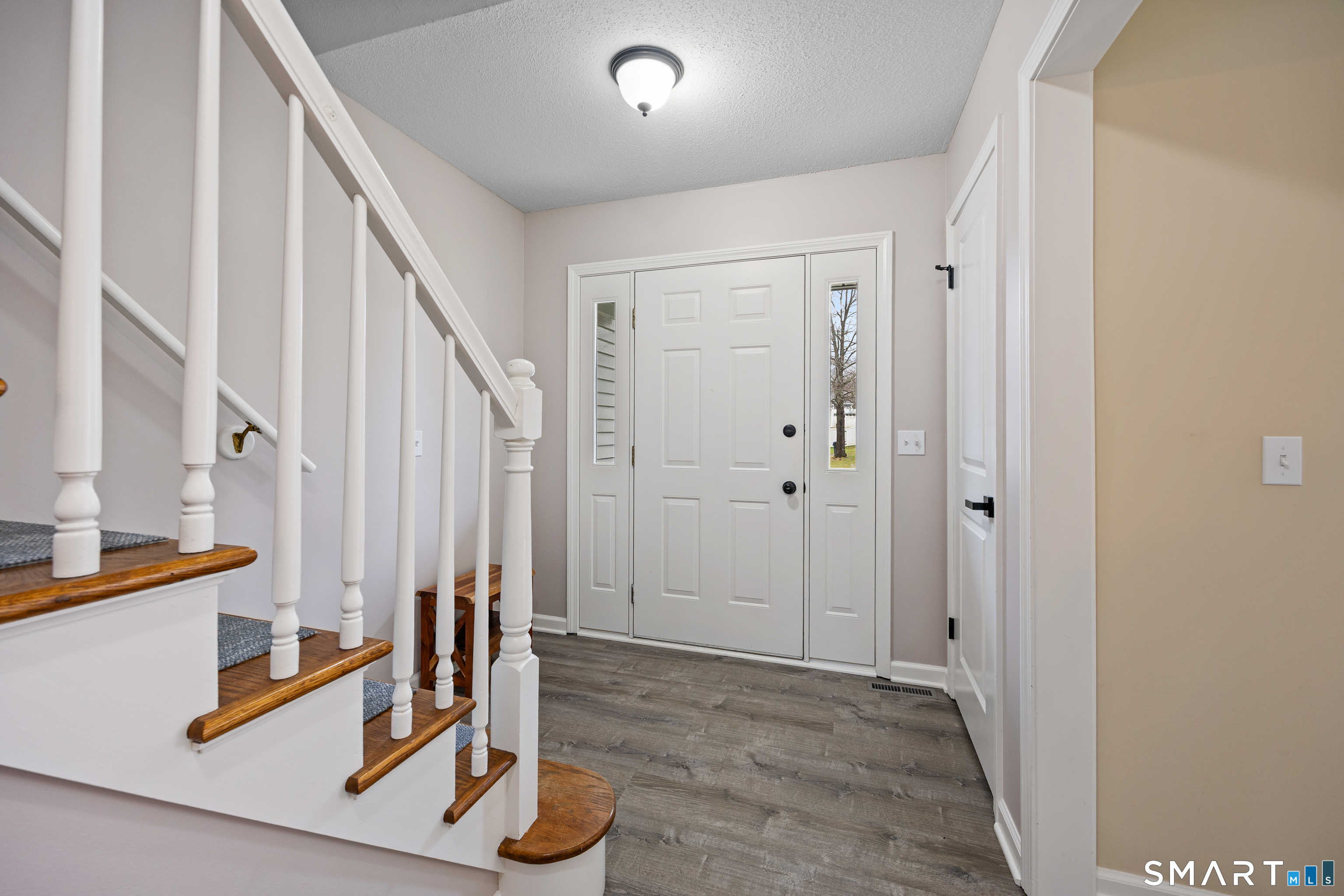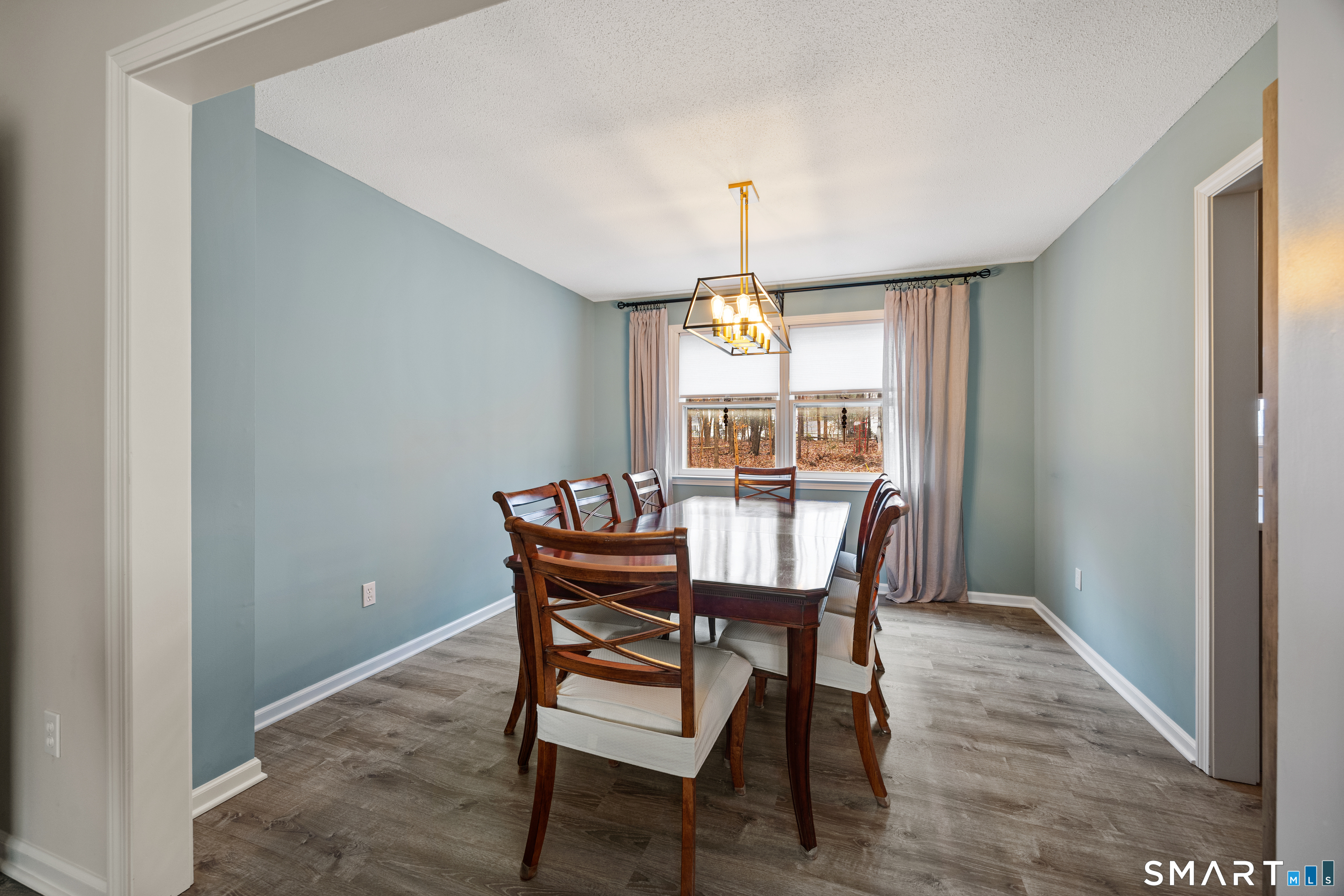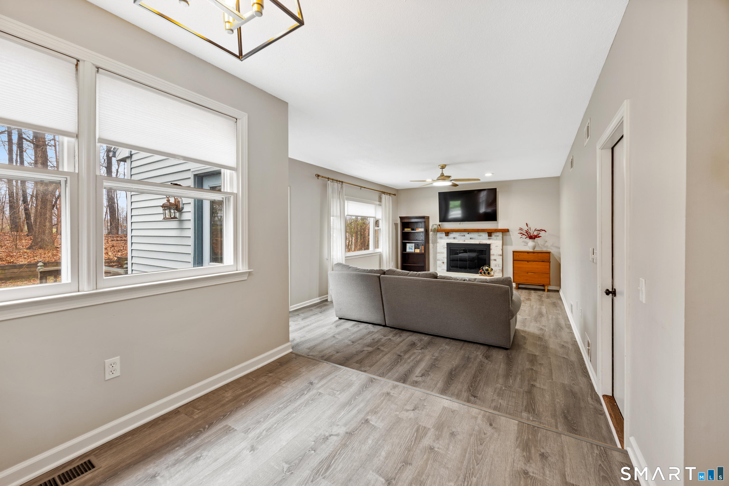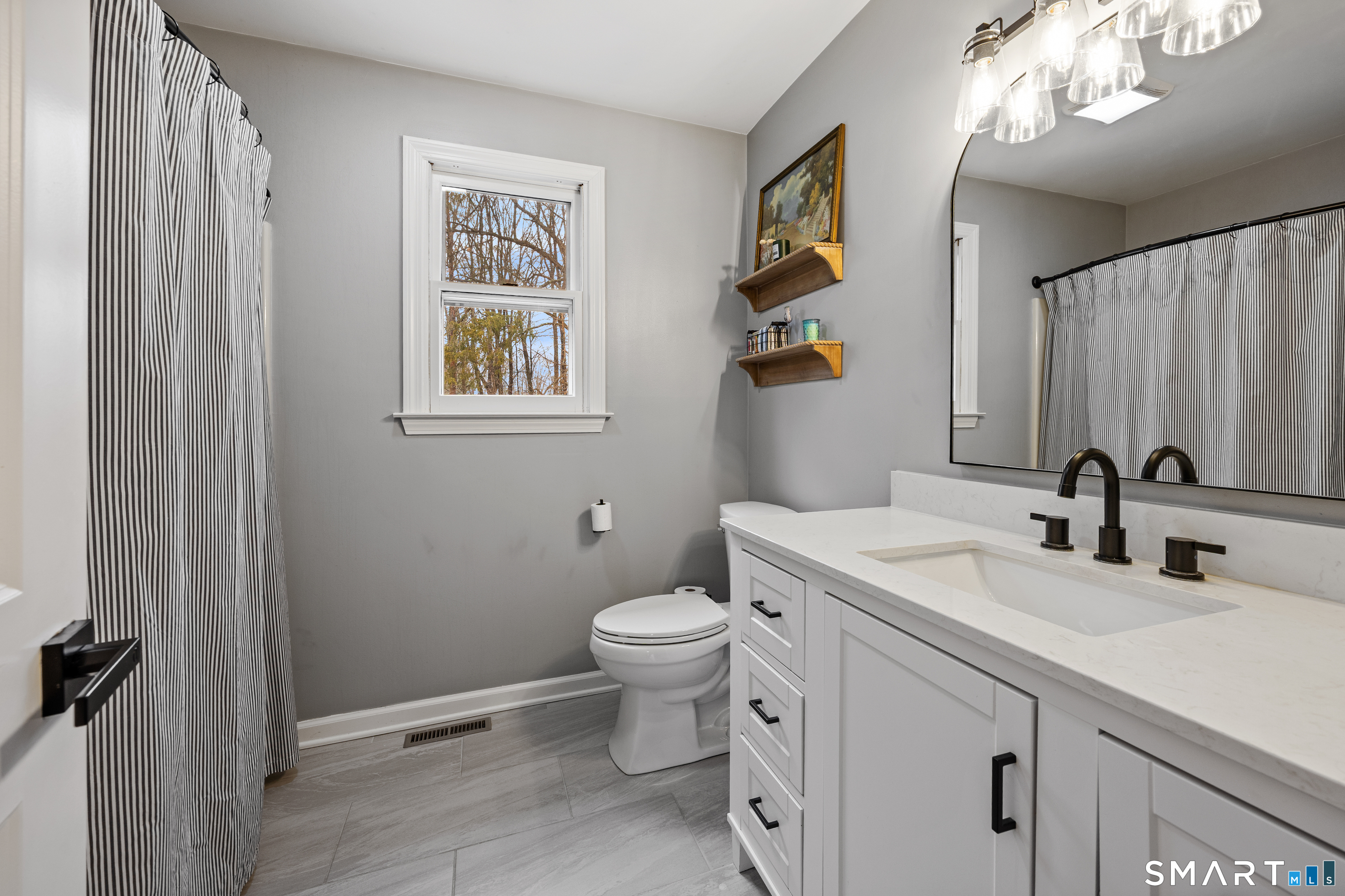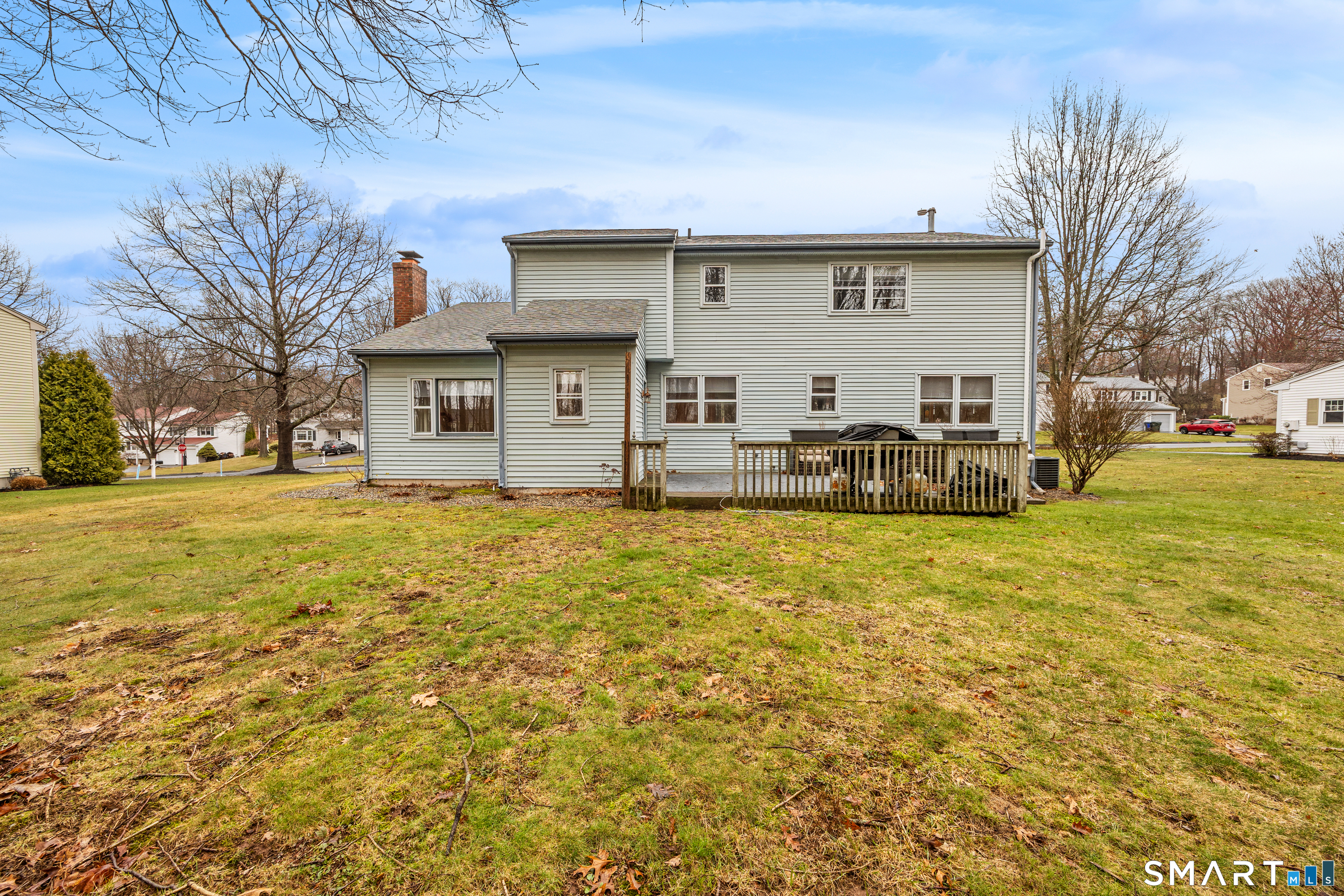 Simply Stunning! This beautifully maintained Colonial is ideally located in a desirable Rocky Hill neighborhood, just minutes from the highway for easy commuting. Step inside and enjoy an abundance of natural light complemented by gorgeous vinyl flooring and central air conditioning throughout. The updated kitchen features granite countertops, a tiled backsplash, stainless steel appliances, and charming vintage lighting. The open-concept layout seamlessly connects the kitchen, dining room, and living room-perfect for both everyday living and entertaining. The spacious family room offers a cozy stone fireplace, a convenient half bath with laundry, and direct access to the exterior deck. Step outside to a private, wooded backyard-an ideal setting for relaxing or hosting guests. Upstairs, the primary suite includes a walk-in closet and a newly remodeled full bathroom. Three additional generously sized bedrooms, each with ample closet space, and a second full bathroom provide flexibility for a variety of living needs. Additional highlights include an oversized two-car garage, a full dry basement offering abundant storage, natural gas heating, and city water and sewer-truly completing the package.