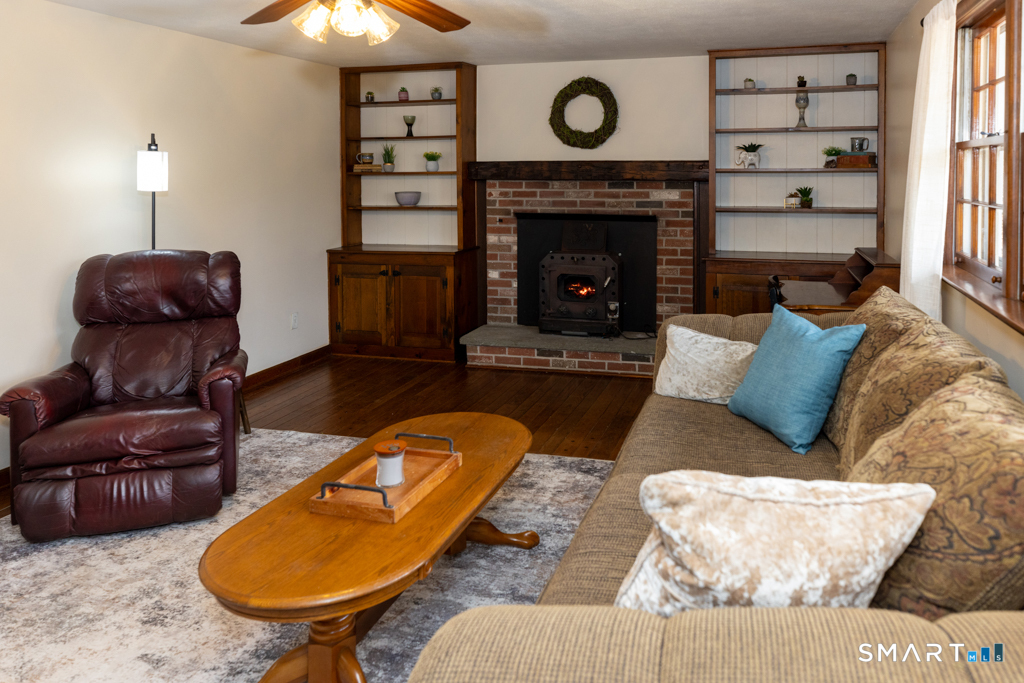 ****PLEASE HAVE ALL HIGHEST AND BEST OFFERS IN BY WEDNESDAY, 4/8 AT NOON****Enjoy easy one-floor living in this well maintained 3 bedroom ranch, conveniently located near town, schools, and Lake Pocotopaug. The home features a spacious living room with a cozy wood burning fireplace, perfect for relaxing or entertaining, along with pegged plank wood floors and solid wood doors throughout, adding warmth and character. The primary bedroom includes both a standard closet and a cedar walk-in closet for added storage. Custom-built cabinets, crafted by an expert East Hampton builder. The finished basement offers additional living space, including a 14x16 hobby room, half bath and laundry area. A ventilation fan efficiently pulls warm air out of the house to help keep the home cool during the summer months. An oversized two-car garage with a dedicated workshop area provides plenty of room for storage and projects. Situated on over 2 acres, the property offers endless possibilities-ideal for gardening or future expansion. The outdoor space features a fenced in side yard, a fire pit, and a stone patio set above a stone wall, complete with a swing, picnic table, and benches. The front porch bench is also included, creating the perfect setting to relax and enjoy the surroundings.