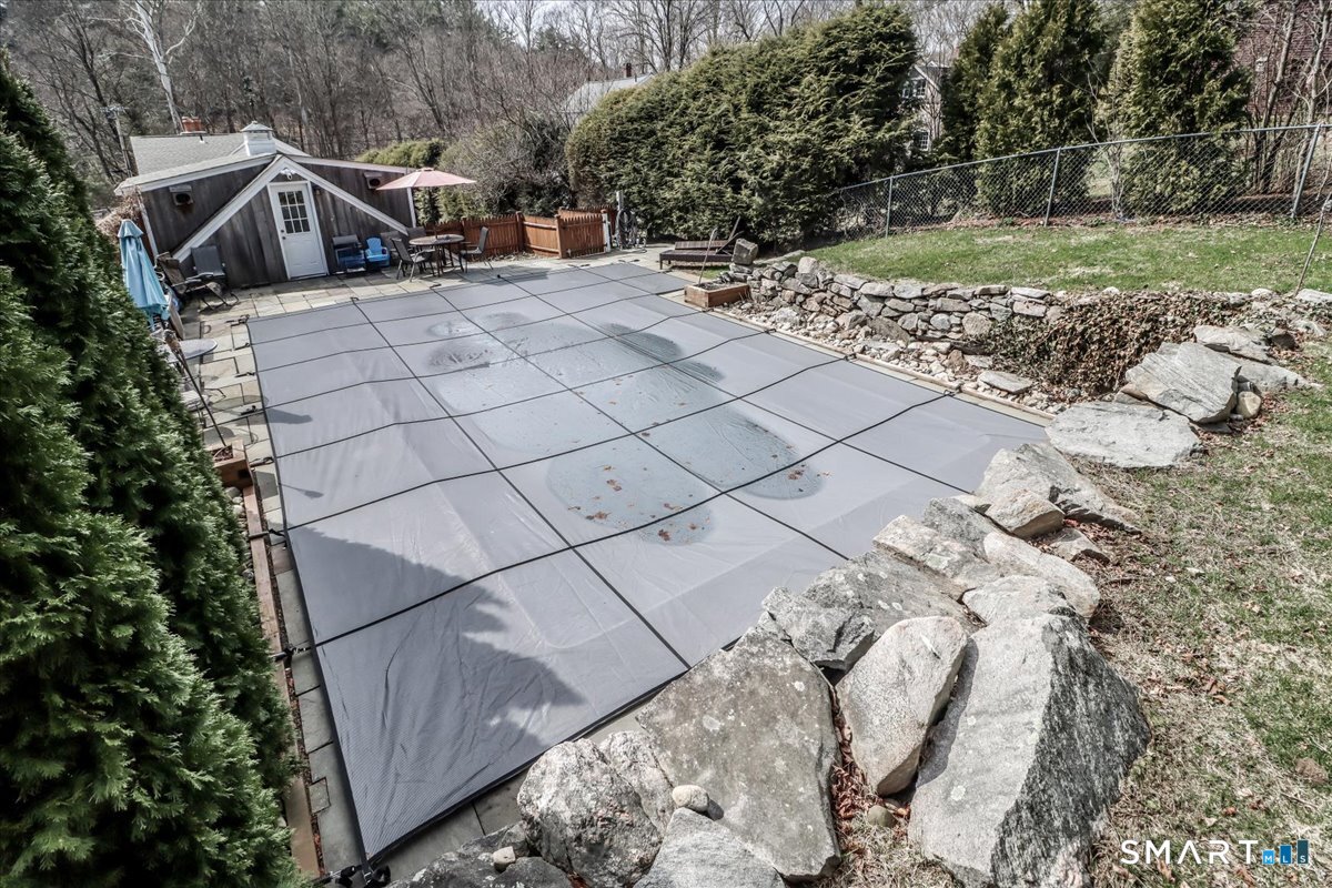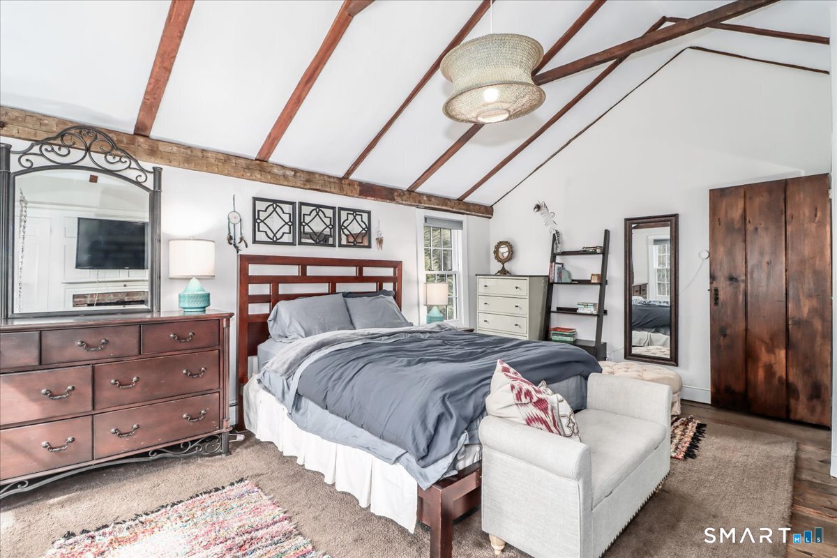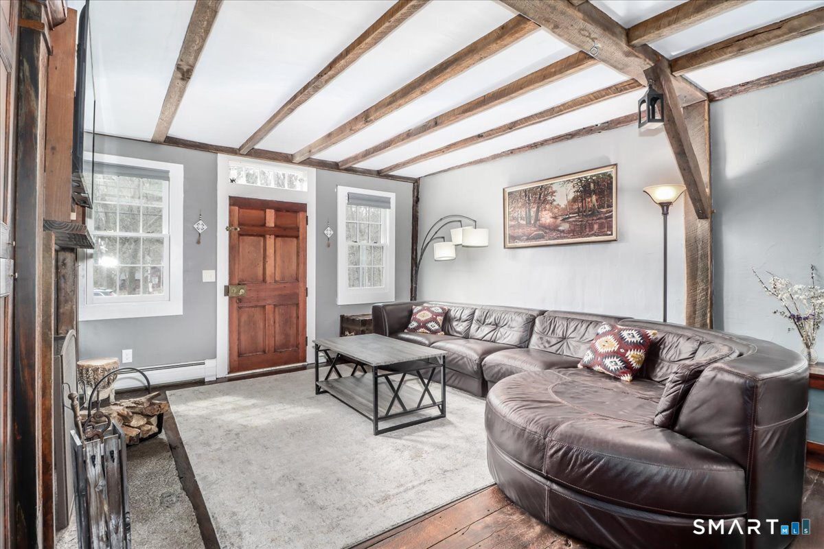 Step back in time as you enter this enchanting 1846 cottage, where history and modern comfort blend seamlessly. Wide-board wood floors and exposed hand-hewn beams welcome you the moment you arrive, guiding you through rooms filled with character and warmth. The open-concept kitchen features a stainless steel gas stove and dishwasher, charming display cabinets, a farmhouse sink, and a delightful chalkboard refrigerator-perfect for leaving notes or sharing daily inspiration. A classic Dutch door adds timeless style. Just beyond, the cozy living area offers a wood-burning fireplace, built-ins, and a beautiful wood entry door with transom windows-an ideal spot to gather, relax, or enjoy a quiet evening by the fire. A convenient half bath with laundry completes the main level. Upstairs, the primary bedroom suite is a true sanctuary with its own fireplace, built-ins, and inviting sitting area. Two additional bedrooms offer large windows that fill the rooms with natural light, and a full bath completes the second floor. Outside, enjoy a two-car garage with an upstairs pool house or studio-perfect for hobbies, guests, or extra storage. Spend sunny days splashing in the inground pool, surrounded by the peaceful charm of this historic property. Located in the heart of Woodbury, Connecticut, you're just five minutes from local restaurants, boutique shops, and the famous Antiques Trail. Enjoy a gourmet bakery, grocery stores, and countless attractions right around the corner-