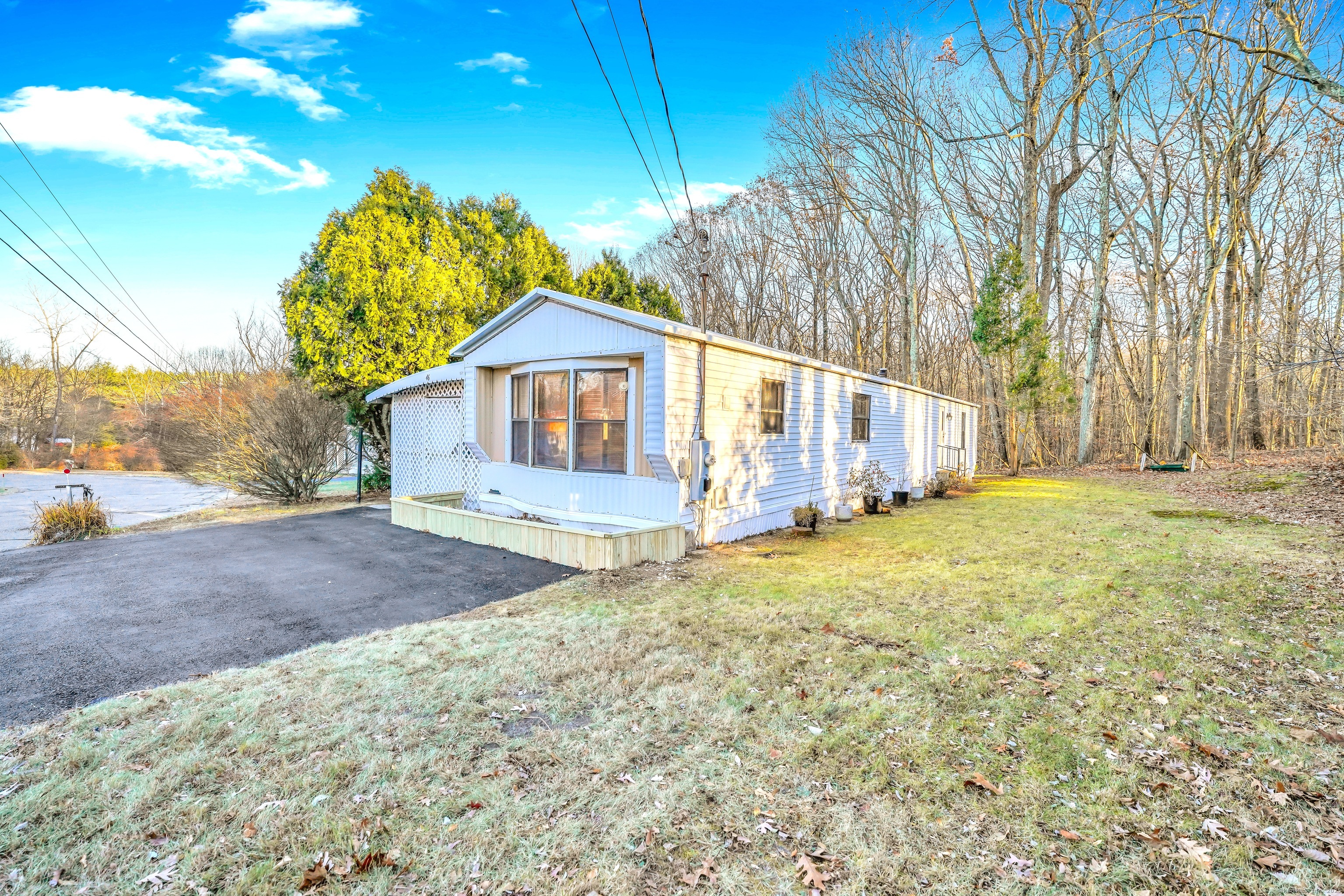 Come view this charming 2-bedroom, 1-bath mobile home nestled in a private enclave in Prospect. Featuring a newly paved driveway and an enclosed carport, this property backs up to acres of pristine woodland, offering front-row seats to New England's breathtaking seasonal changes. Experience the tranquil lifestyle this unique location provides! The interior showcases natural wood flooring and warm wood-paneled walls, perfectly complementing the home's serene natural setting. Despite its peaceful, secluded feel, this property offers convenient access to Big Y, CVS, restaurants, and all the amenities of nearby Naugatuck. Don't miss this rare opportunity to enjoy country living with city convenience and affordable living!