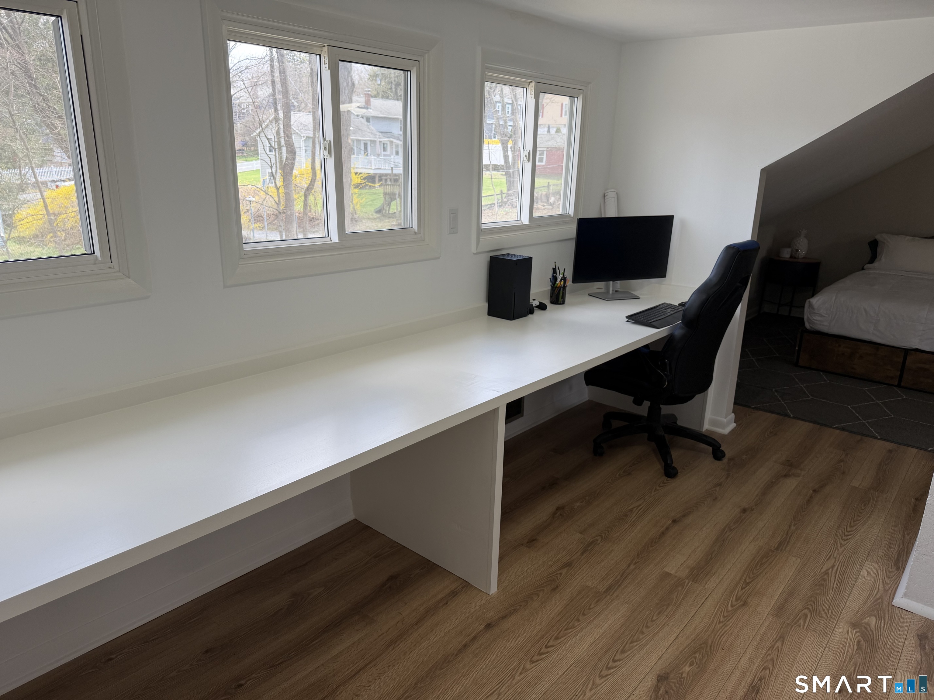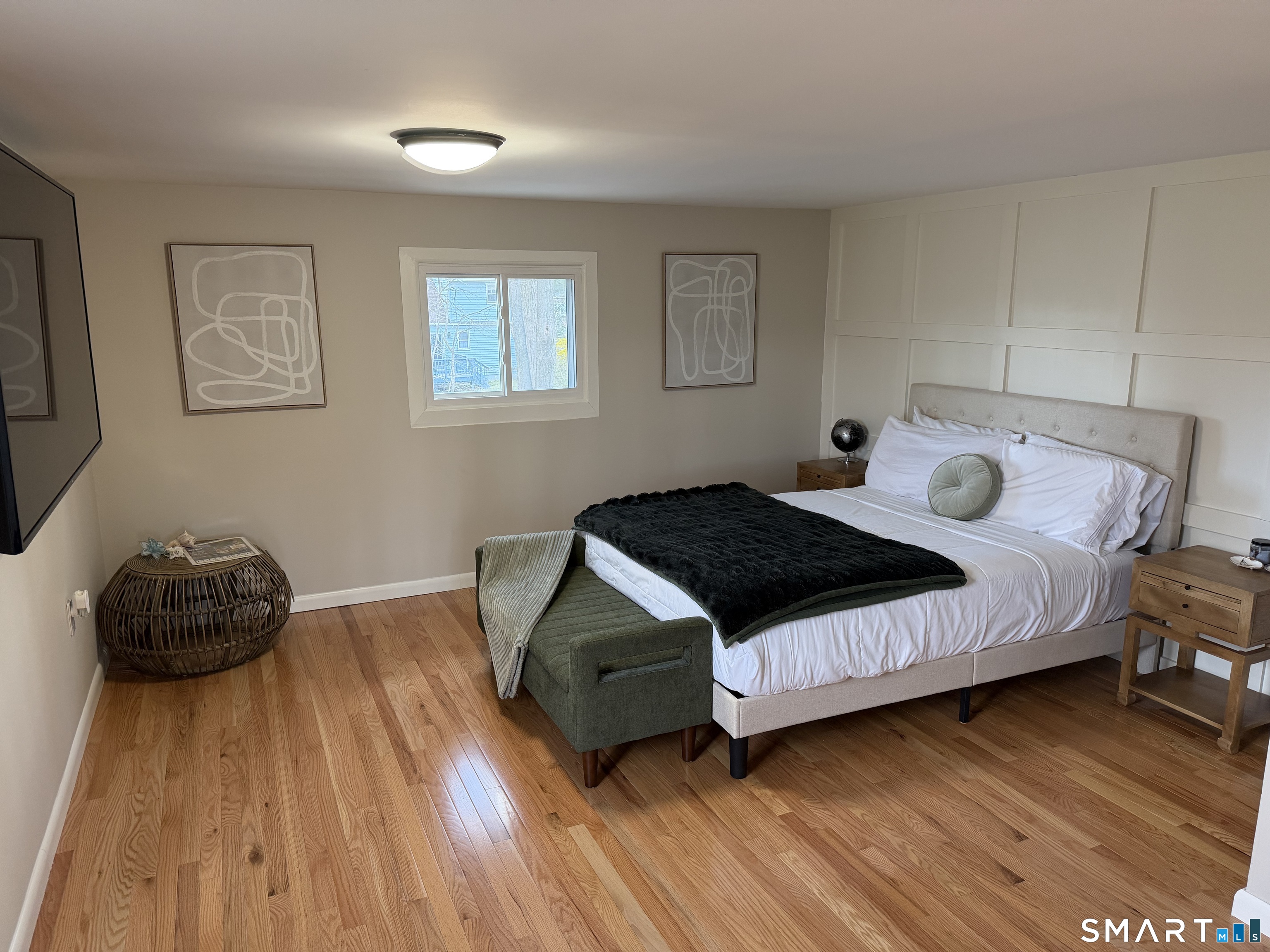 Beautifully updated split-level home set on a private 1.15 acre lot, surrounded by mature trees and set back from the street. The open-concept living and dining area features new white oak floors, recessed LED lighting, and in-ceiling surround sound. The updated kitchen includes Kitchen Aid appliances, quartz countertops, under cabinet lighting, floating shelves and stainless steel undermount sink. The fully renovated bath offers modern finishes and radiant heated floors. The spacious primary bedroom features a paneled accent wall and walk-in closet with built-ins. An oversized 2nd bedroom with built-in desk provides flexible space and potential for a 3rd bedroom, with a nearby 1/2 bath that could accommodate a shower. Additional highlights include a walk-up attic, large lower level with finishing potential, one-car garage with backyard access, and basement laundry. Ideally located within walking distance to town, with schools and parks nearby. This home offers privacy, comfort, and flexibility. Come make this house your home! *See attached list of improvements
