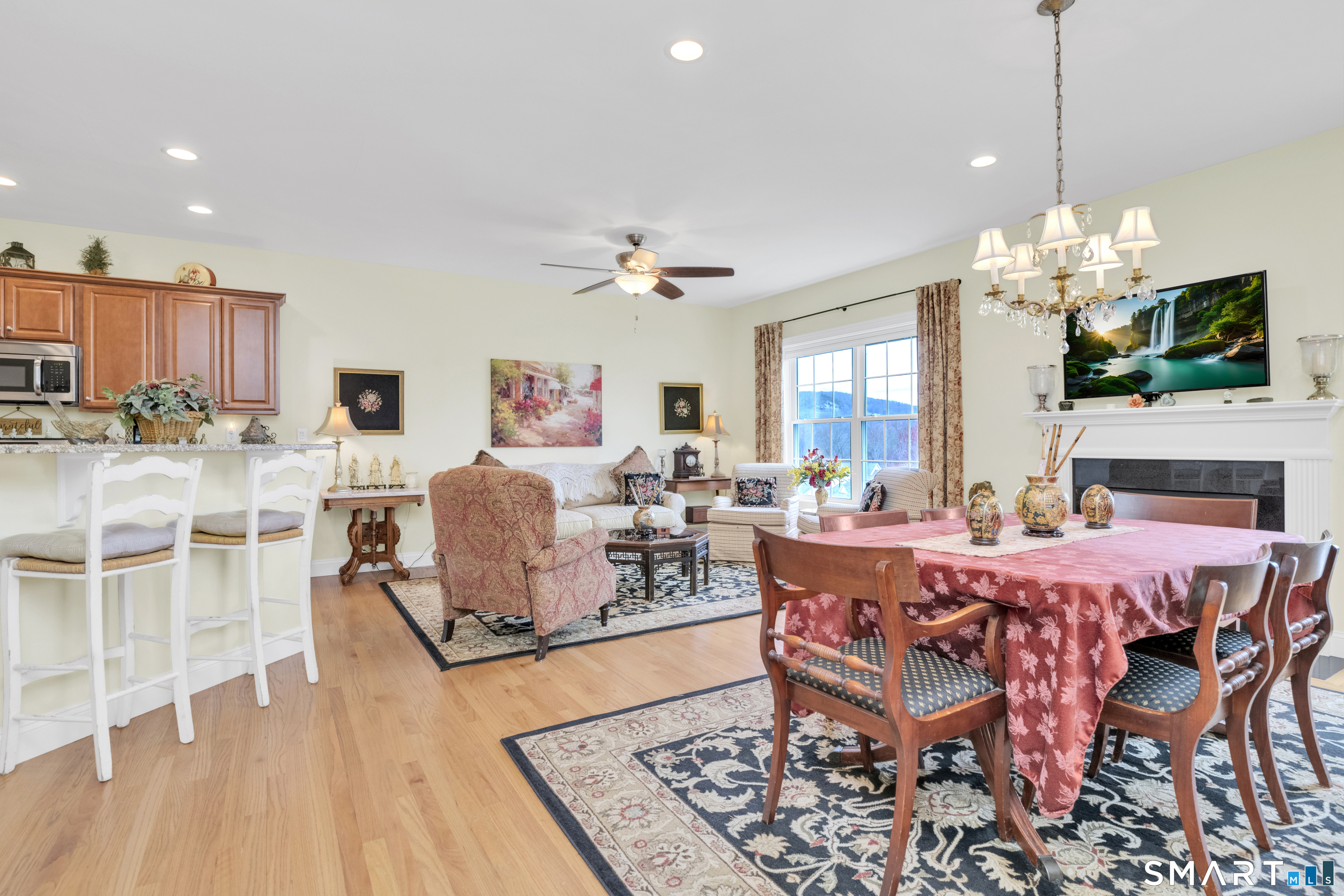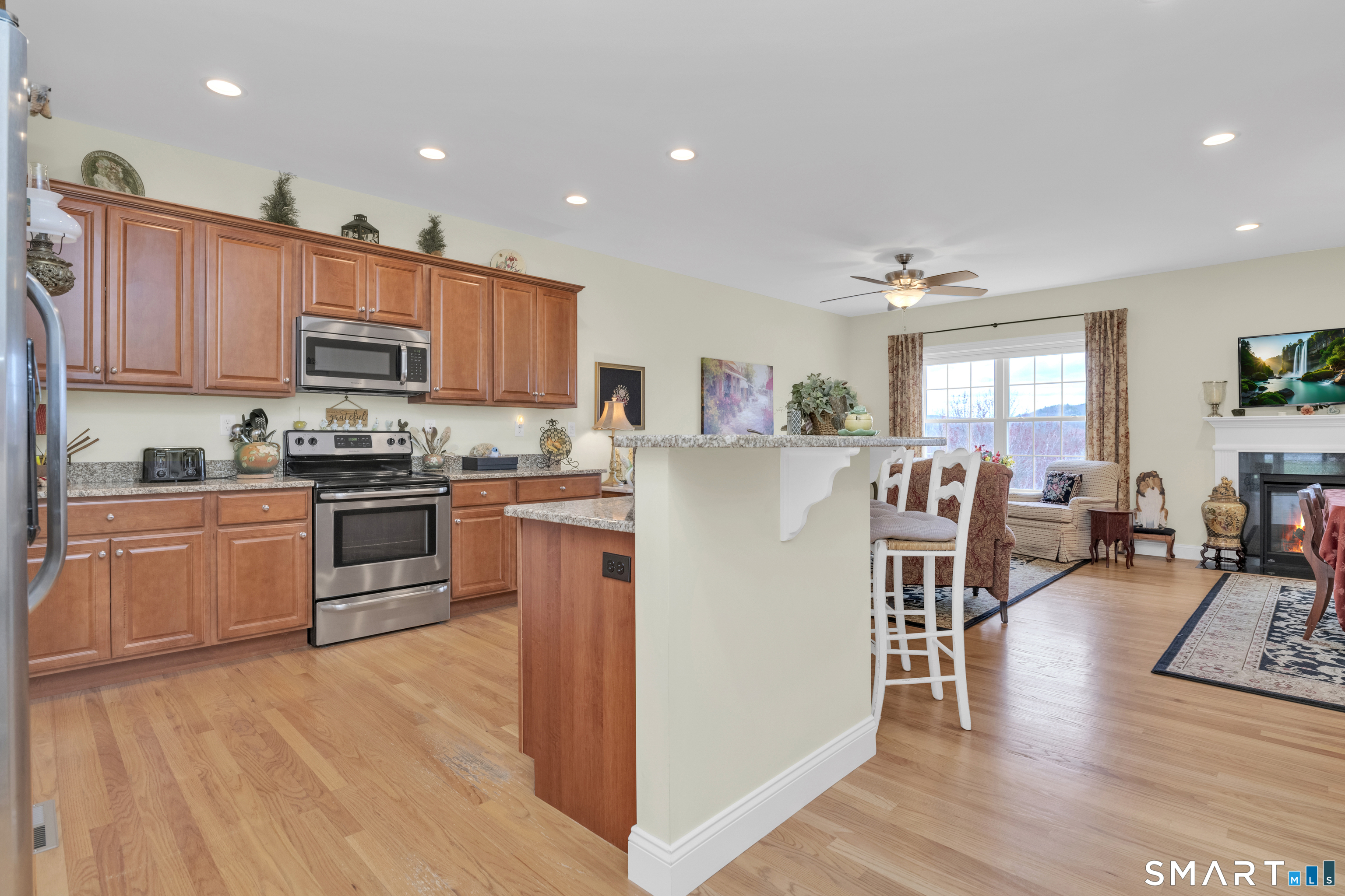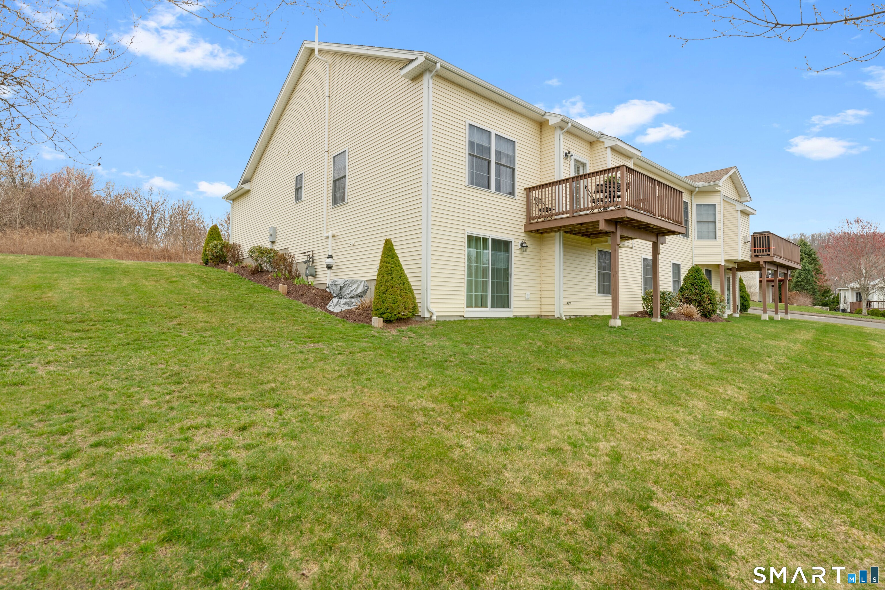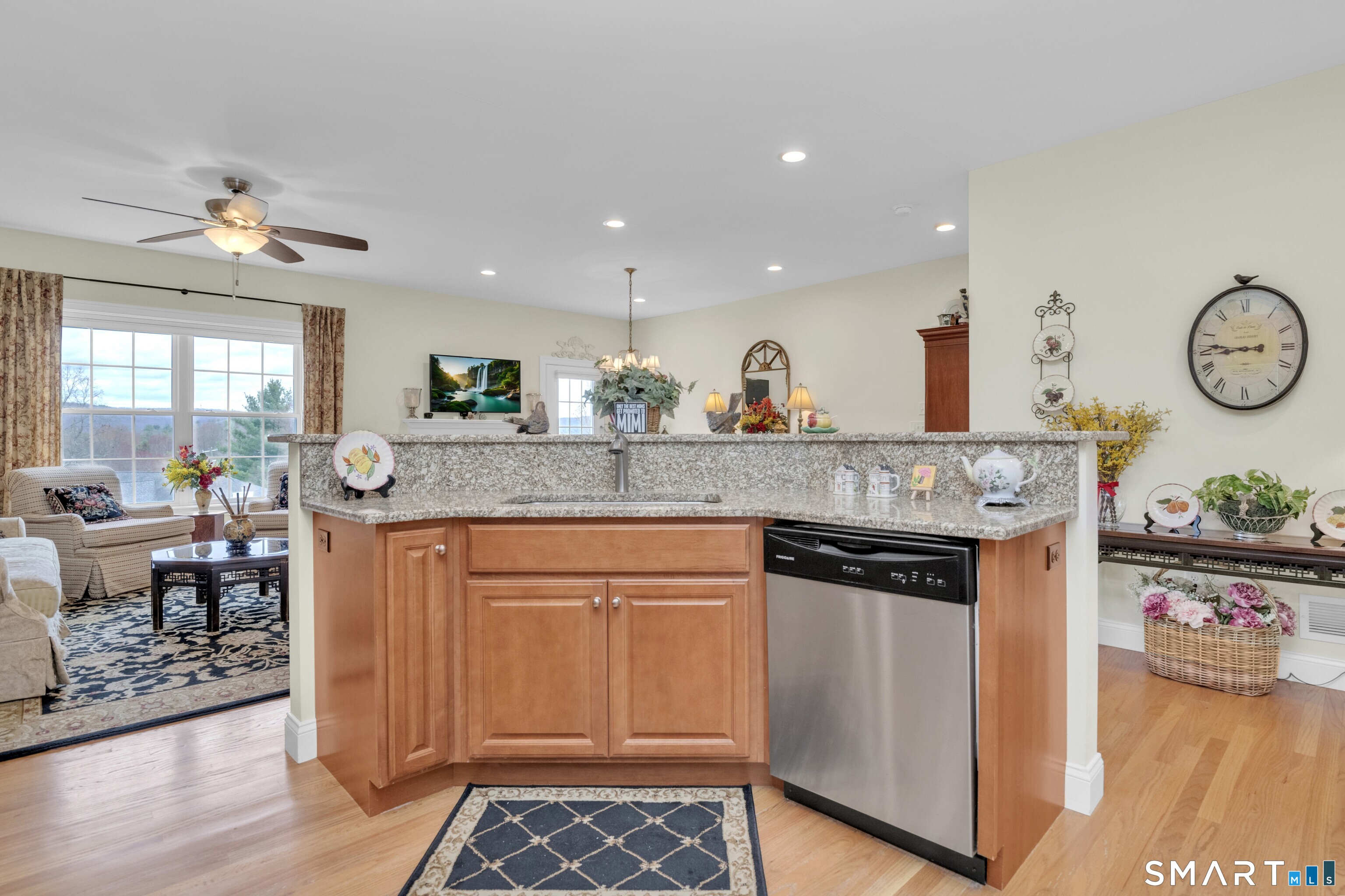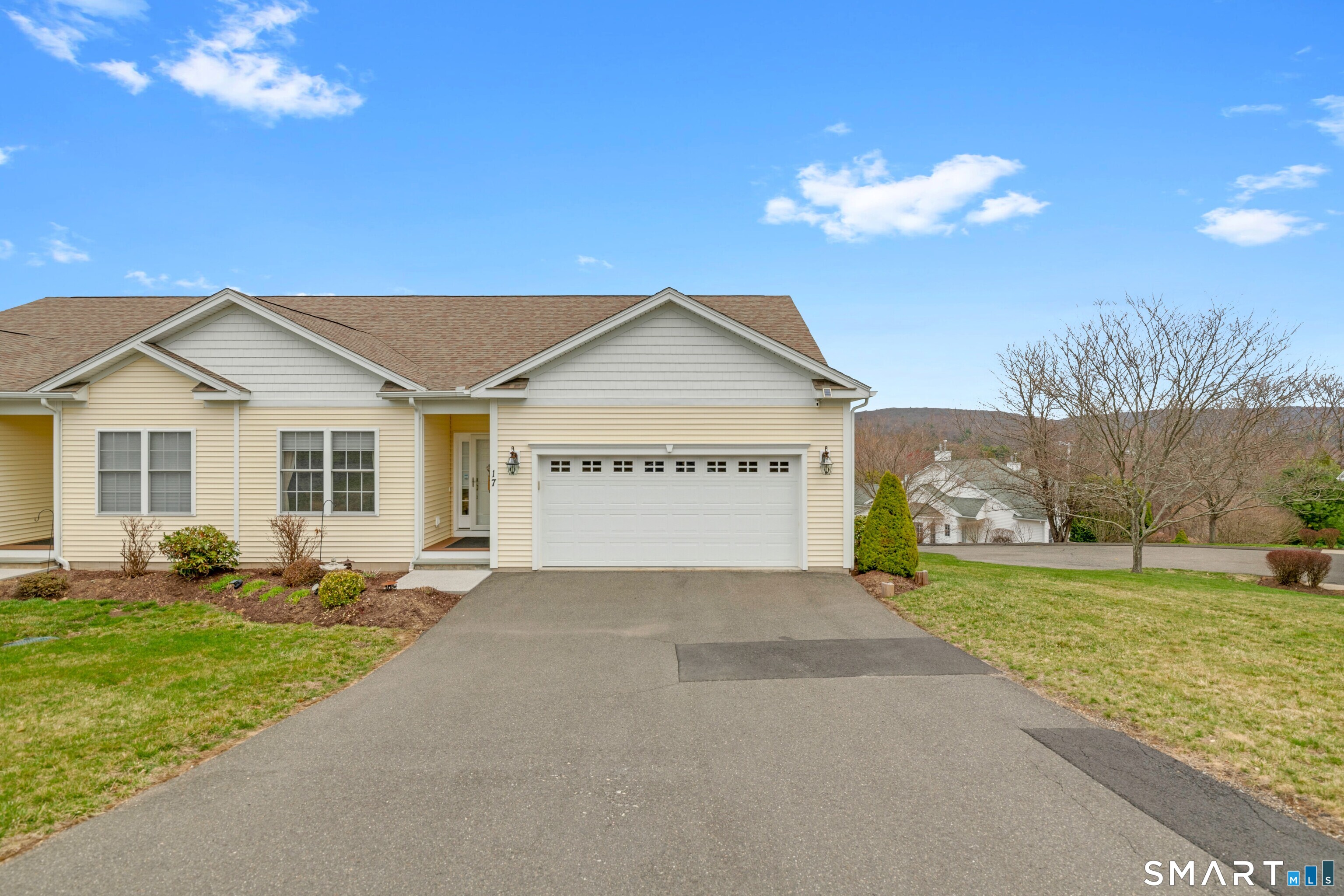 Impeccably maintained and upgraded end-unit ranch in a sought-after 55+ community, offering the ease of single-level living and a bright, open floor plan. Built 2016, this well-maintained home features 2 bedrooms, 2 full baths, and 1,474 square feet of comfortable living space on the main level. The kitchen, dining and living spaces boast gleaming hardwood floors, lots of bright recessed lighting, and flow seamlessly as you move about. This home is ideally positioned to maximize natural light pouring in, and the view from the private deck is breathtaking! Kitchen is equipped with granite countertops, ample cabinetry, spacious pantry, and modern appliances. The primary bedroom offers a walk-in closet and wall-to-wall carpeting, while the second bedroom provides flexible space for guests or a home office. Additional highlights include main-level laundry, central A/C, natural gas heat and hot water, public utilities, and a two-car garage. The beautifully finished walk-out basement with roughed-in bath provides additional living space and an adjoining storage area. This community features a clubhouse and low-maintenance living with monthly HOA covering grounds care, snow removal, trash, and property management. This is a home you'll take great pride in owning, in a community you'll feel great about. Beacon Falls offers outstanding parks and outdoor recreation, the security of in-town first responders just minutes away, and is the perfect commute via Routes 8/42/63/84. Come see