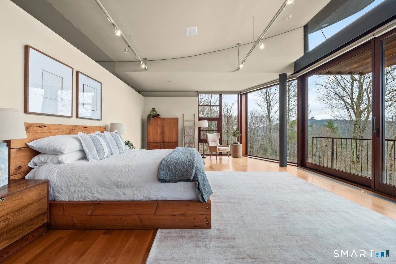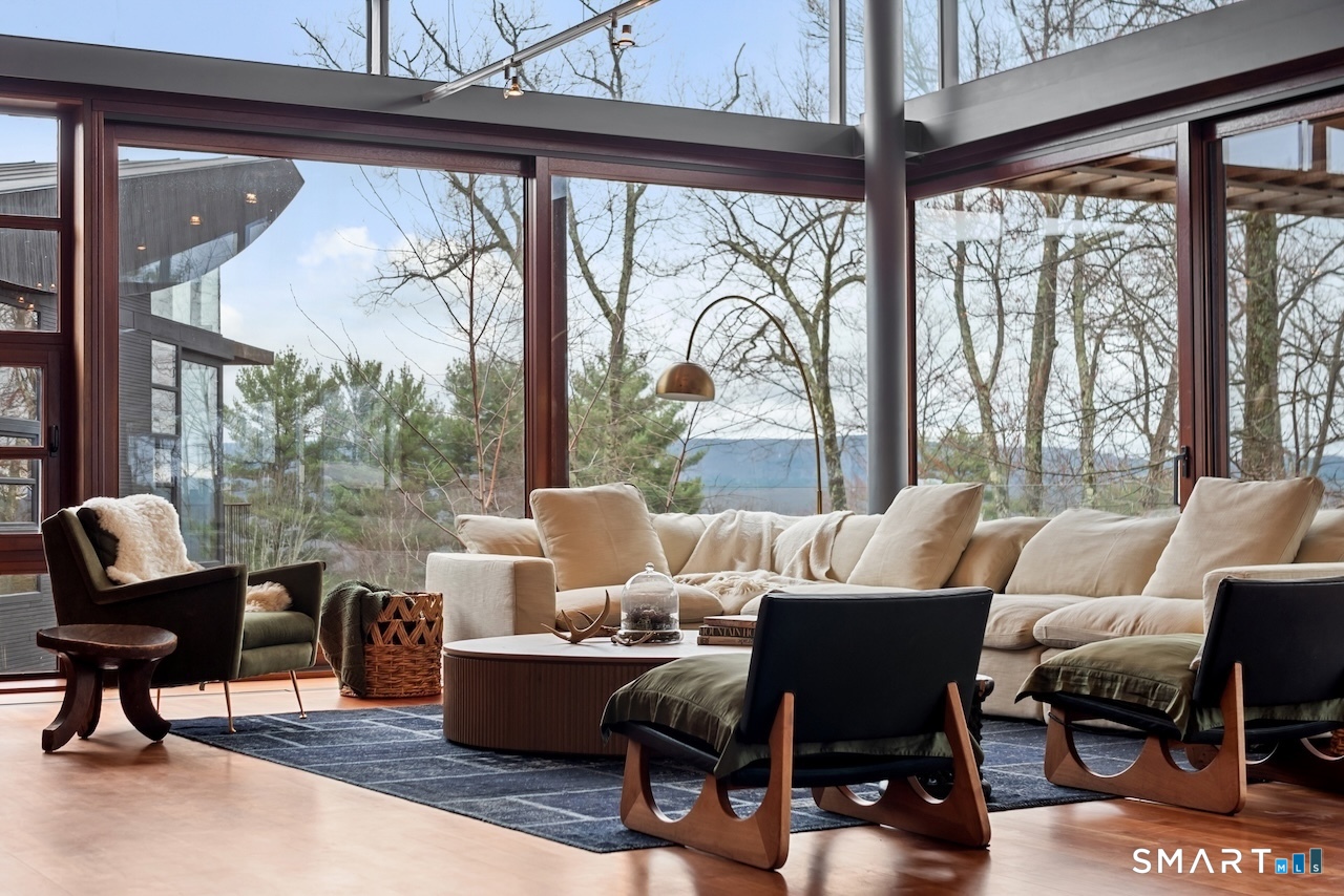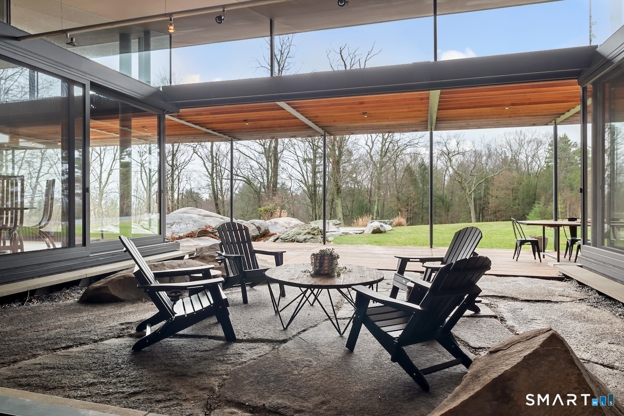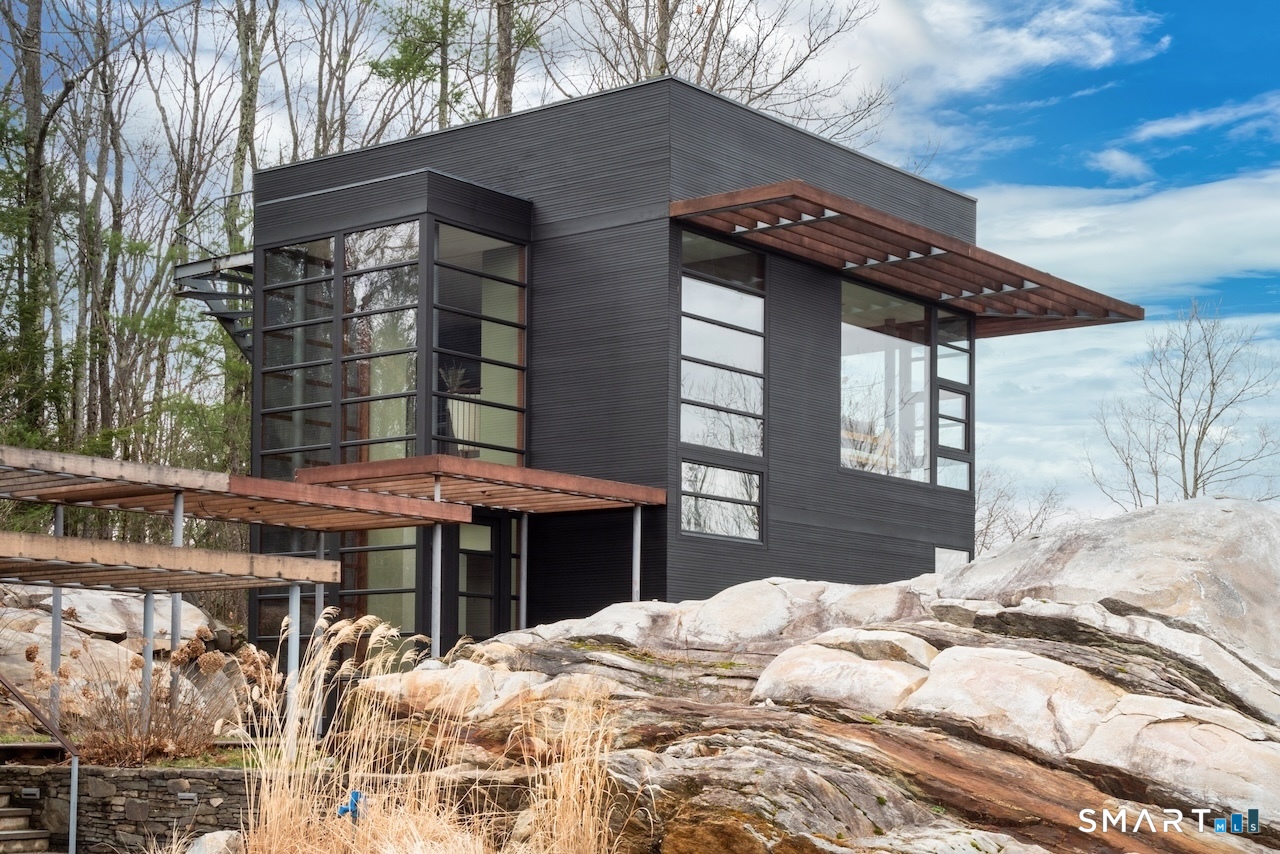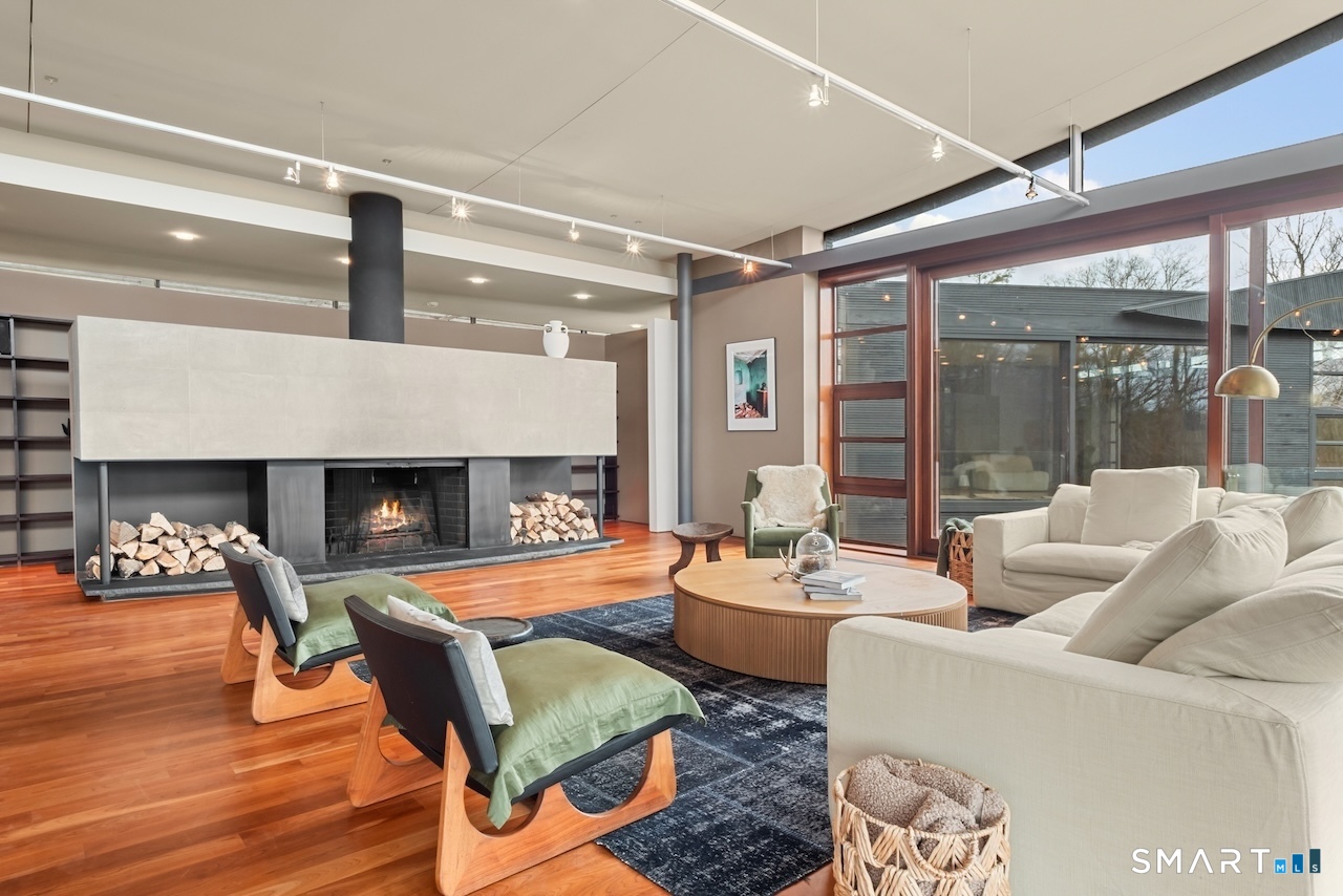 Experience a rare Zen-inspired retreat in the heart of the Berkshires, designed in harmony with its natural surroundings. Set on nearly 120 acres of protected land with striking rock outcroppings, sweeping mountain views, and ~1,000 feet along the Williams River, this architecturally significant Contemporary offers exceptional privacy just minutes from Great Barrington. Designed by Steven Haas, the home blends steel, glass, concrete, and wood, with soaring interiors and Sorpetaler sliding glass walls that open seamlessly to nature. Expansive decks overlook a 25-meter heated saltwater lap pool, hot tub, and fire pit. The open chef's kitchen with oversized wood-burning fireplace anchors the home, while the living room offers a second fireplace and serene views. A glass and stone courtyard enhances the tranquil design. The primary suite is a private sanctuary with spa-like bath, dressing room, office/lounge, and its own deck. Guest accommodations throughout offer comfort and privacy. The lower level includes a billiards room, wet bar, and additional living space. A separate guest house features two bedrooms, kitchenette, living/dining area, and rooftop deck. The 3,000 sq ft recreation barn offers a full kitchen, loft, gym, and flexible gathering space. Eight miles of private trails lead to the Williams River, completing this exceptional retreat just 10 minutes from town.
