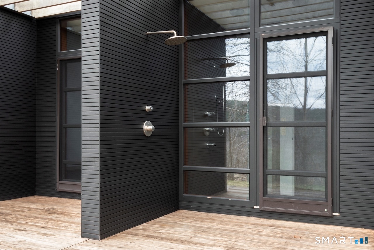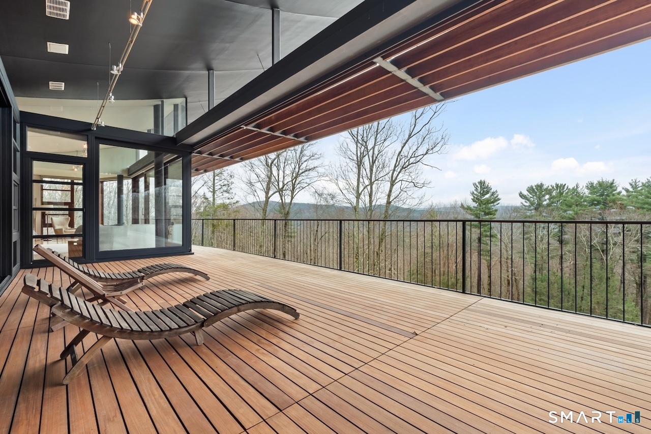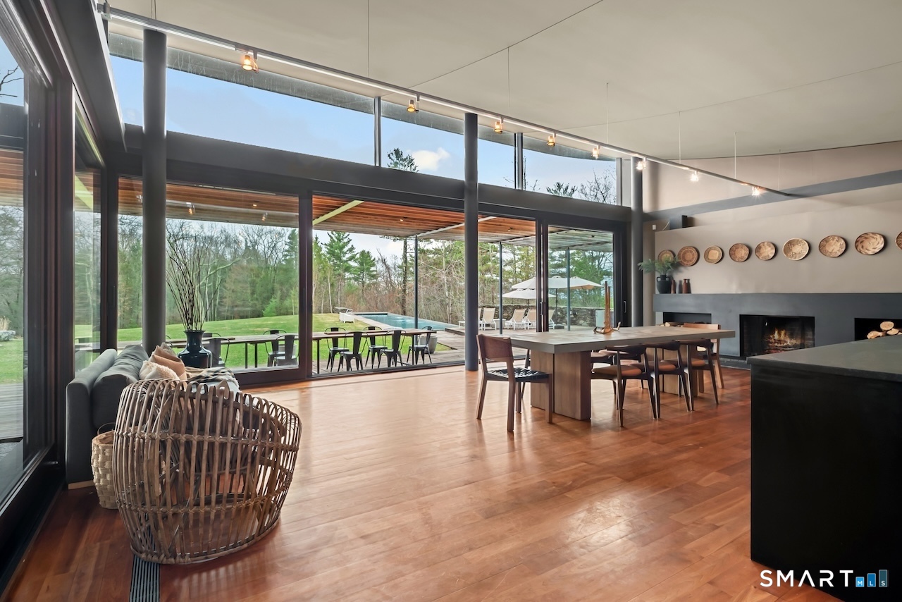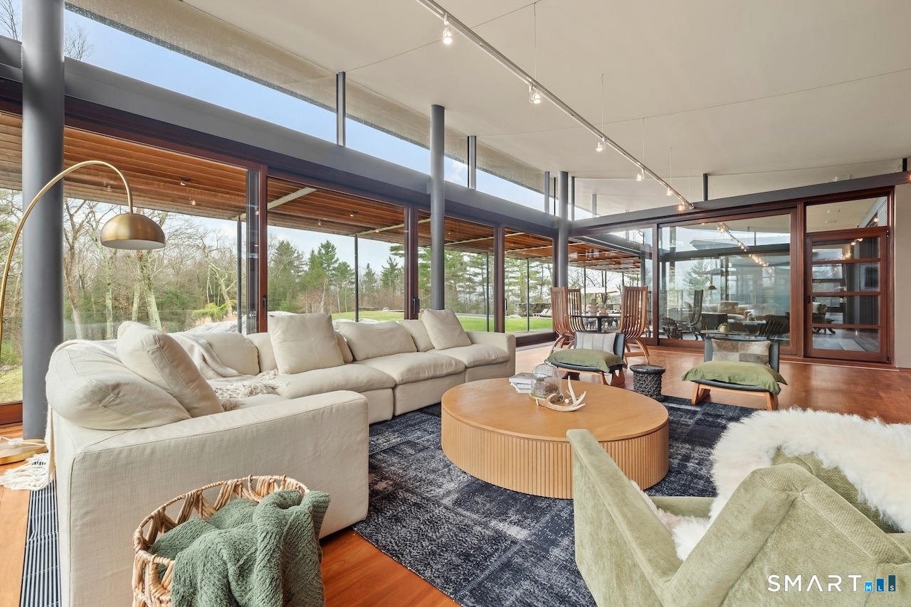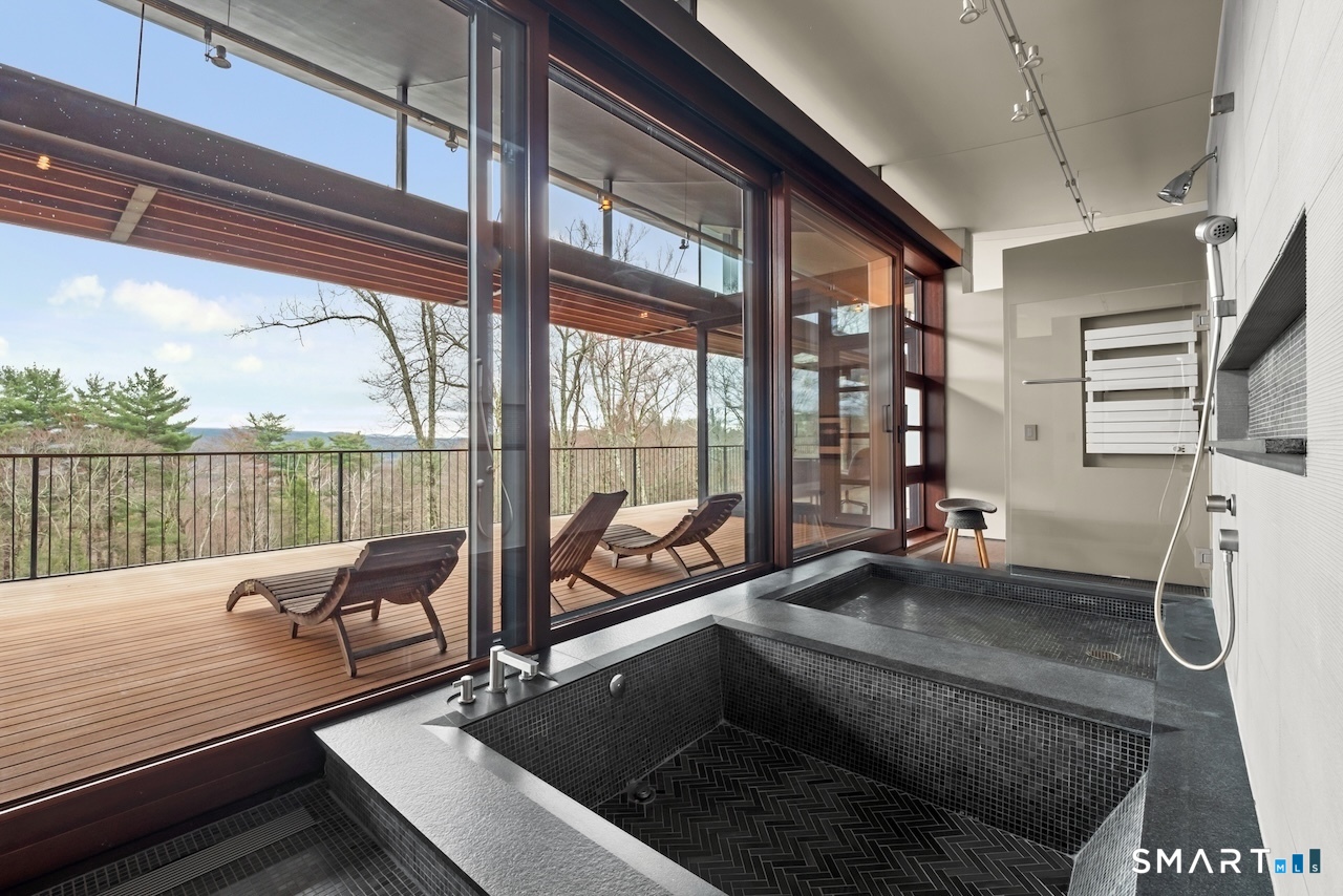 Experience a rare Zen-inspired retreat in the heart of the Berkshires, designed in harmony with its natural surroundings. Set on nearly 120 acres of protected land with striking rock outcroppings, sweeping mountain views, and ~1,000 feet along the Williams River, this architecturally significant Contemporary offers exceptional privacy just minutes from Great Barrington. Designed by Steven Haas, the home blends steel, glass, concrete, and wood, with soaring interiors and Sorpetaler sliding glass walls that open seamlessly to nature. Expansive decks overlook a 25-meter heated saltwater lap pool, hot tub, and fire pit. The open chef's kitchen with oversized wood-burning fireplace anchors the home, while the living room offers a second fireplace and serene views. A glass and stone courtyard enhances the tranquil design. The primary suite is a private sanctuary with spa-like bath, dressing room, office/lounge, and its own deck. Guest accommodations throughout offer comfort and privacy. The lower level includes a billiards room, wet bar, and additional living space. A separate guest house features two bedrooms, kitchenette, living/dining area, and rooftop deck. The 3,000 sq ft recreation barn offers a full kitchen, loft, gym, and flexible gathering space. Eight miles of private trails lead to the Williams River, completing this exceptional retreat just 10 minutes from town.