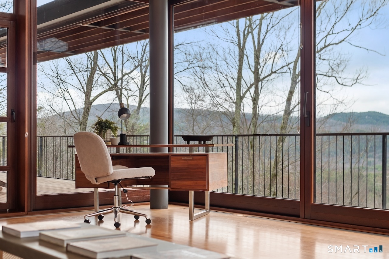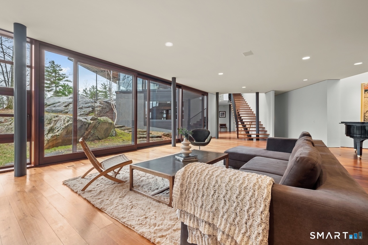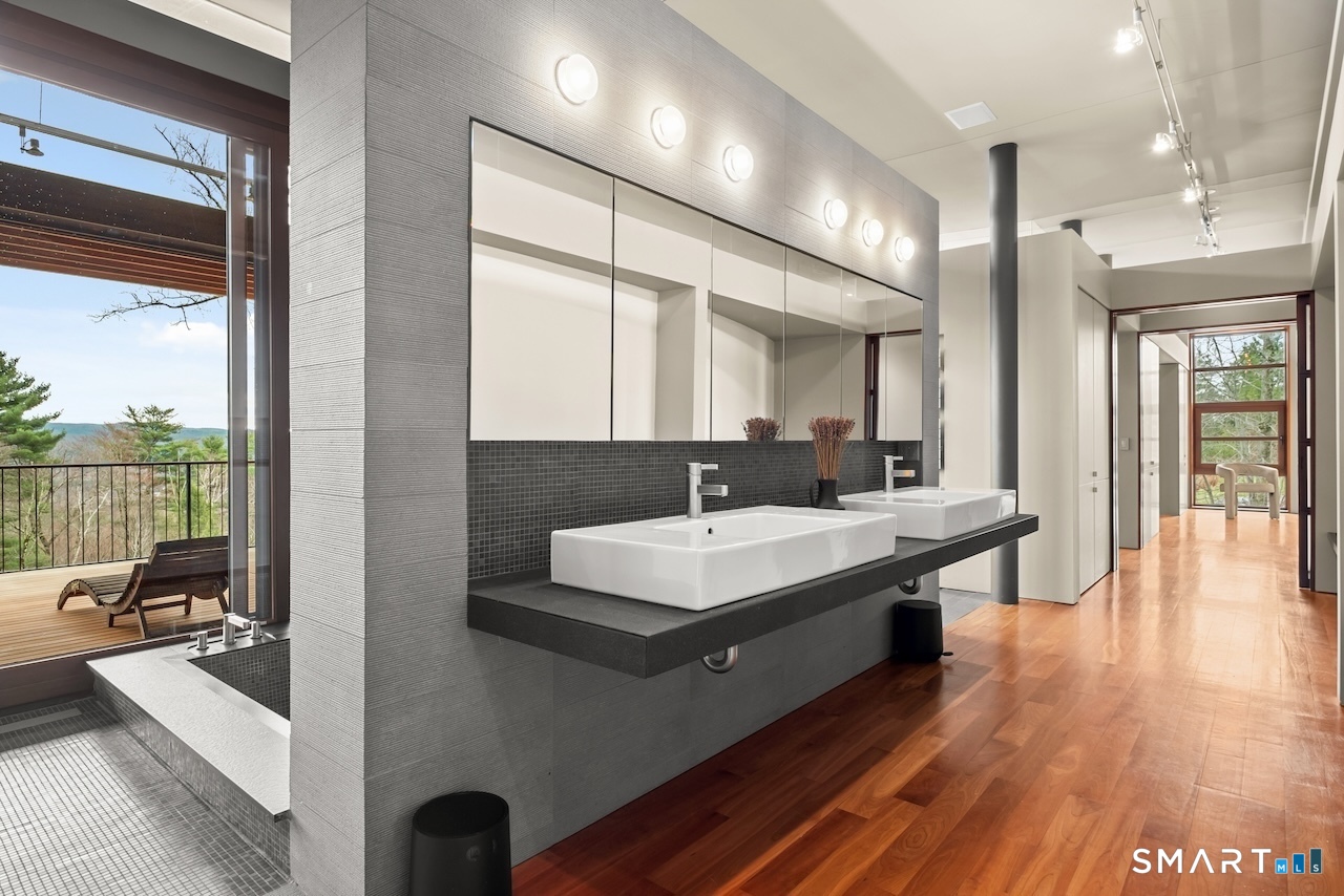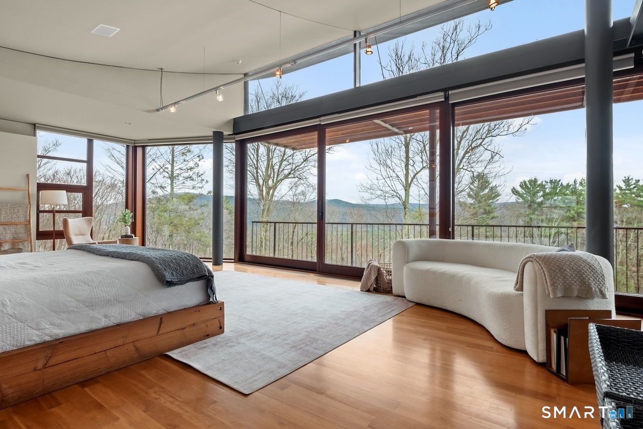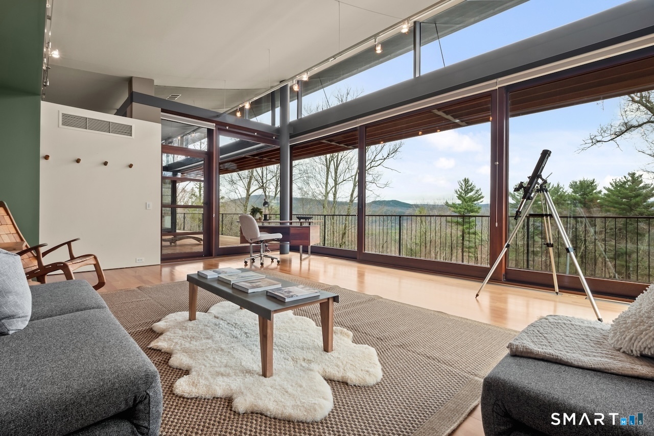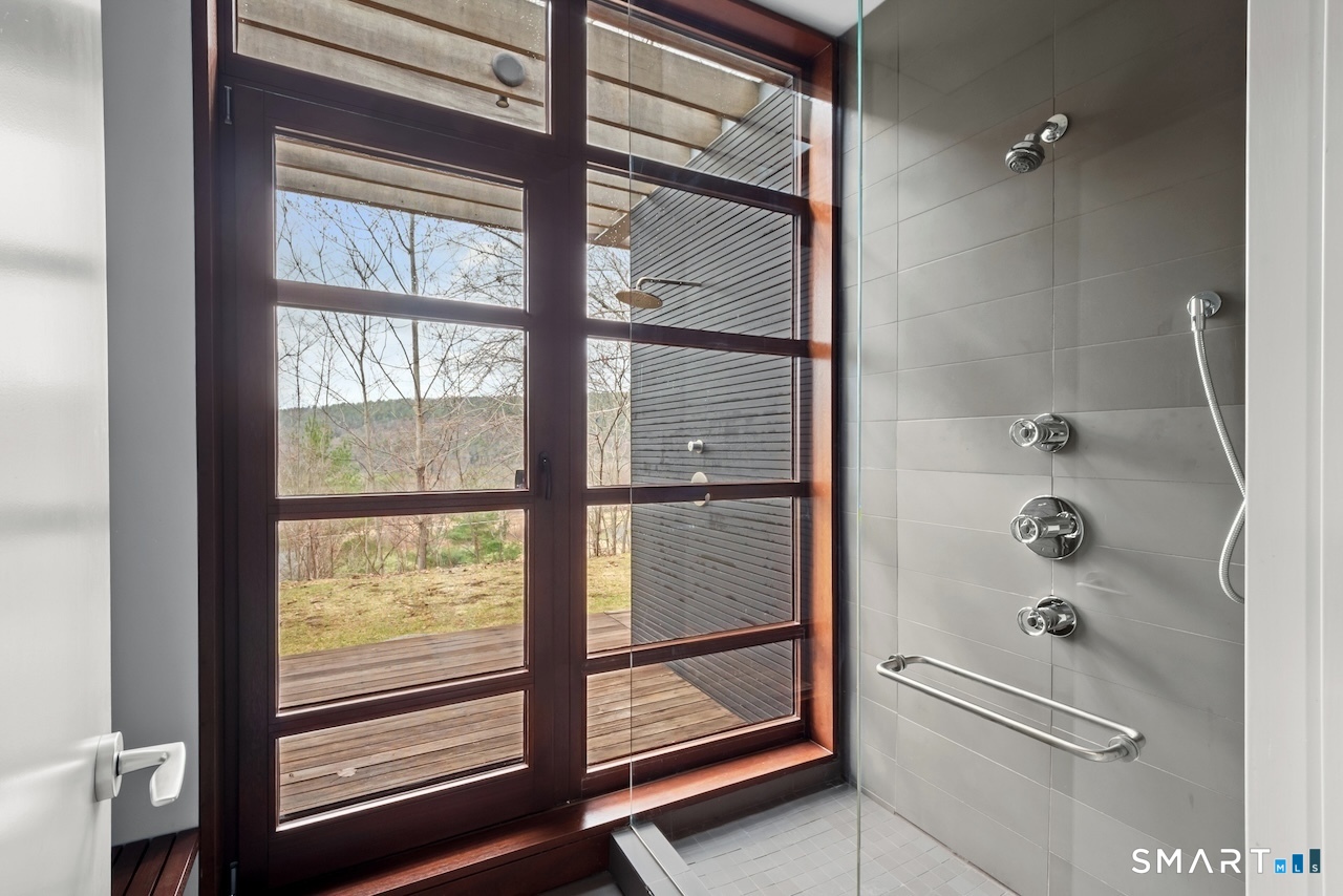 Experience a rare Zen-inspired retreat in the heart of the Berkshires, designed in harmony with its natural surroundings. Set on nearly 120 acres of protected land with striking rock outcroppings, sweeping mountain views, and ~1,000 feet along the Williams River, this architecturally significant Contemporary offers exceptional privacy just minutes from Great Barrington. Designed by Steven Haas, the home blends steel, glass, concrete, and wood, with soaring interiors and Sorpetaler sliding glass walls that open seamlessly to nature. Expansive decks overlook a 25-meter heated saltwater lap pool, hot tub, and fire pit. The open chef's kitchen with oversized wood-burning fireplace anchors the home, while the living room offers a second fireplace and serene views. A glass and stone courtyard enhances the tranquil design. The primary suite is a private sanctuary with spa-like bath, dressing room, office/lounge, and its own deck. Guest accommodations throughout offer comfort and privacy. The lower level includes a billiards room, wet bar, and additional living space. A separate guest house features two bedrooms, kitchenette, living/dining area, and rooftop deck. The 3,000 sq ft recreation barn offers a full kitchen, loft, gym, and flexible gathering space. Eight miles of private trails lead to the Williams River, completing this exceptional retreat just 10 minutes from town.