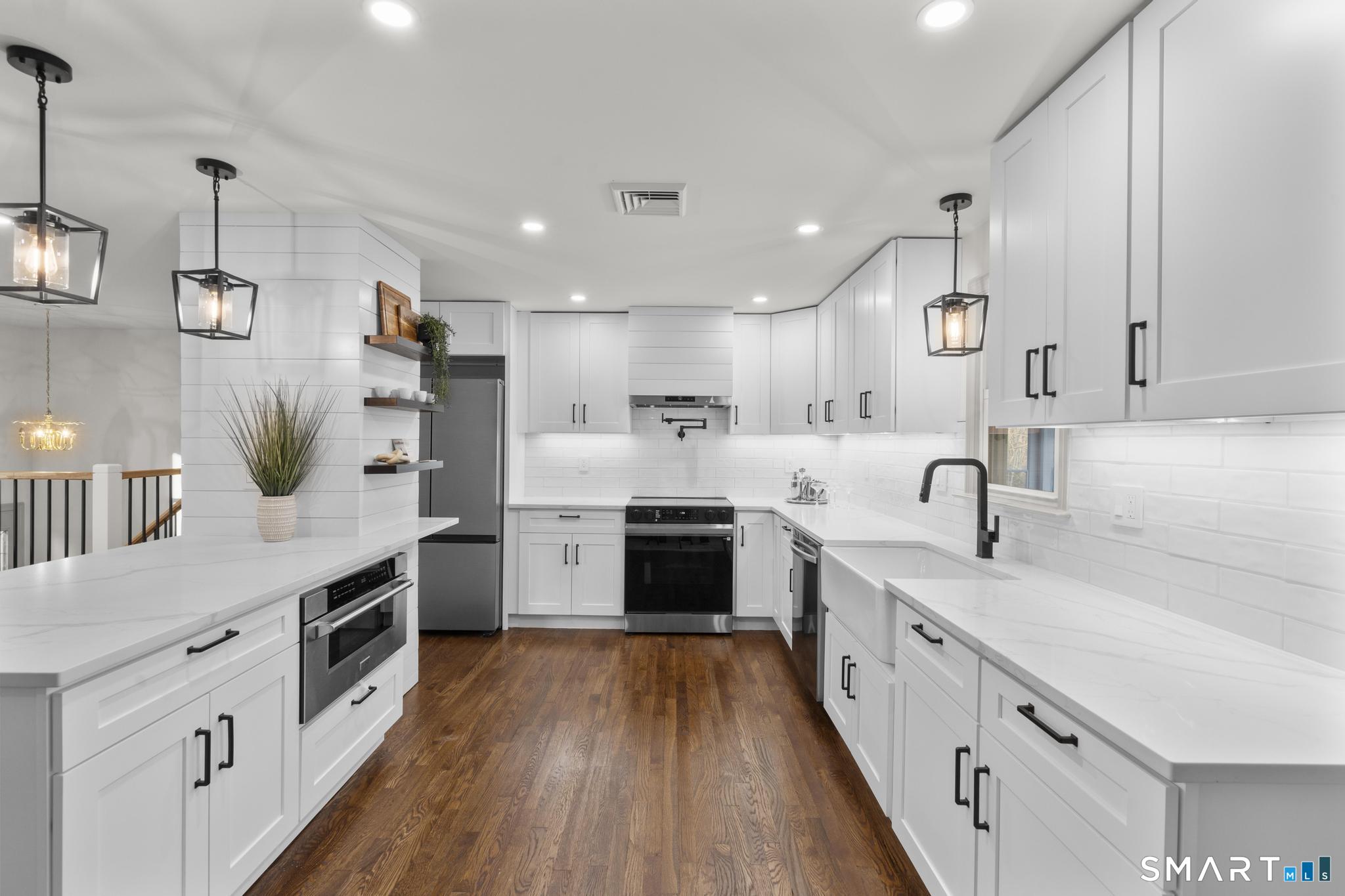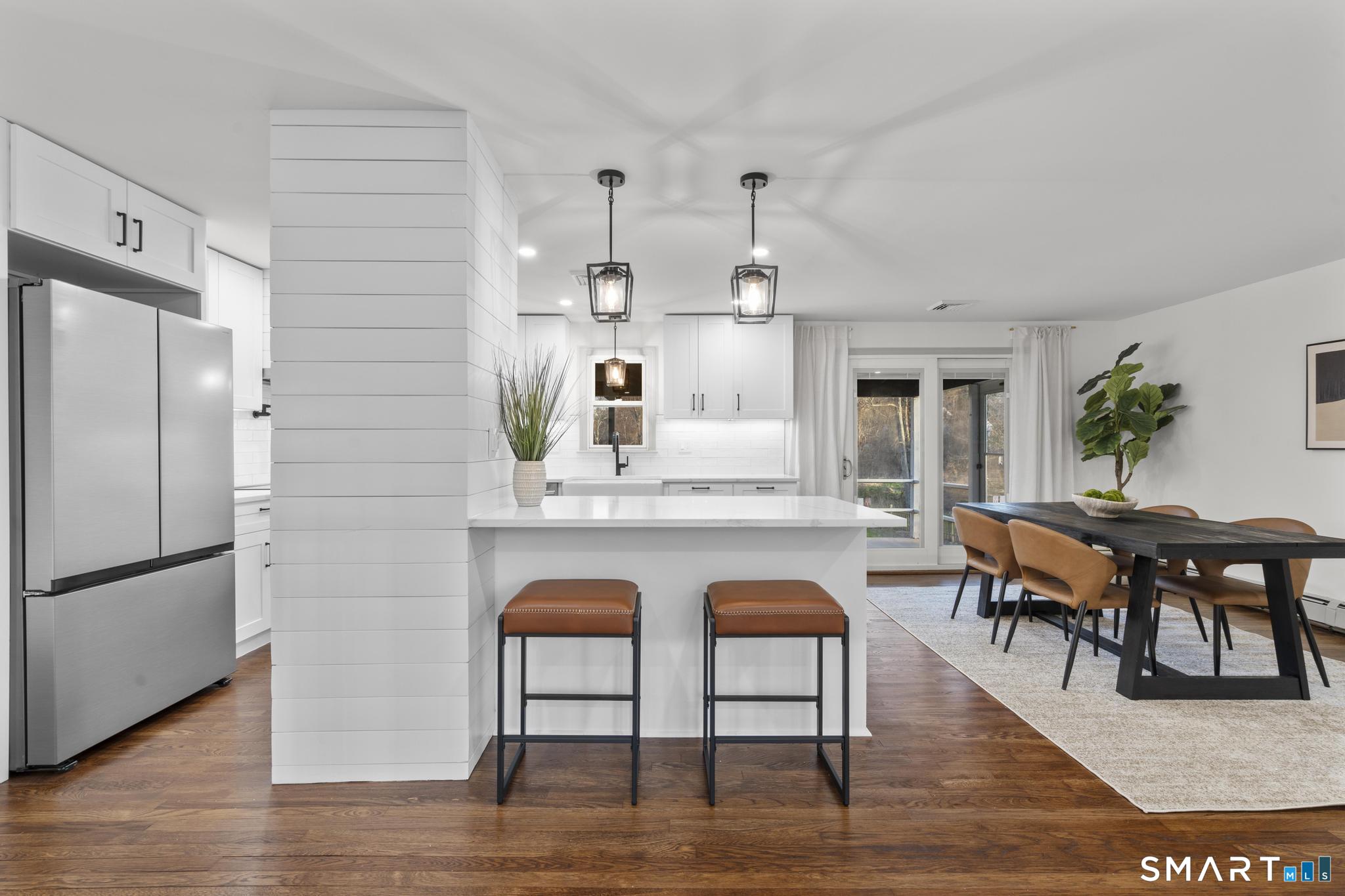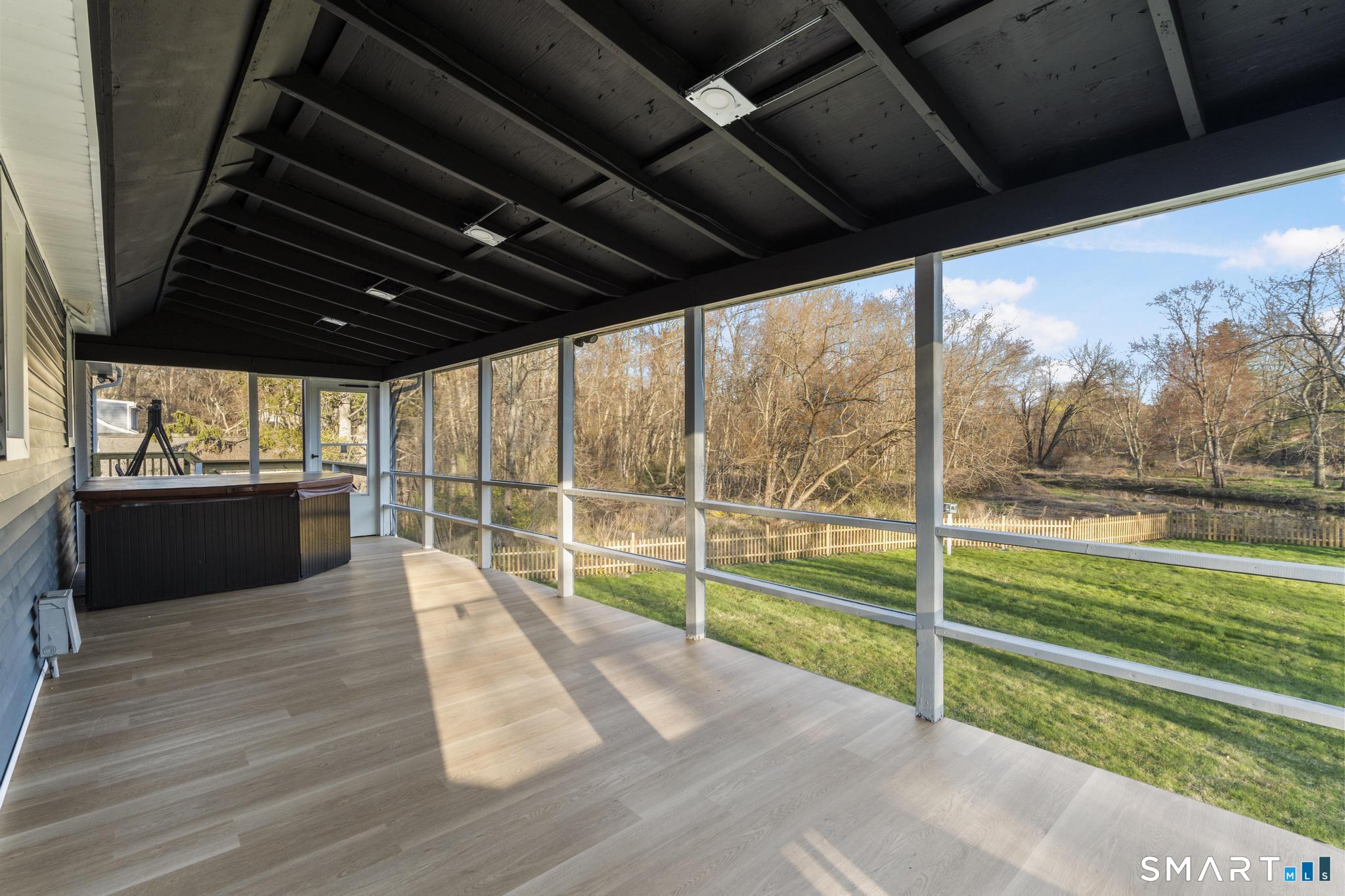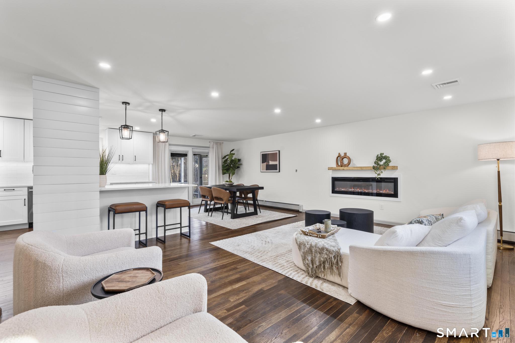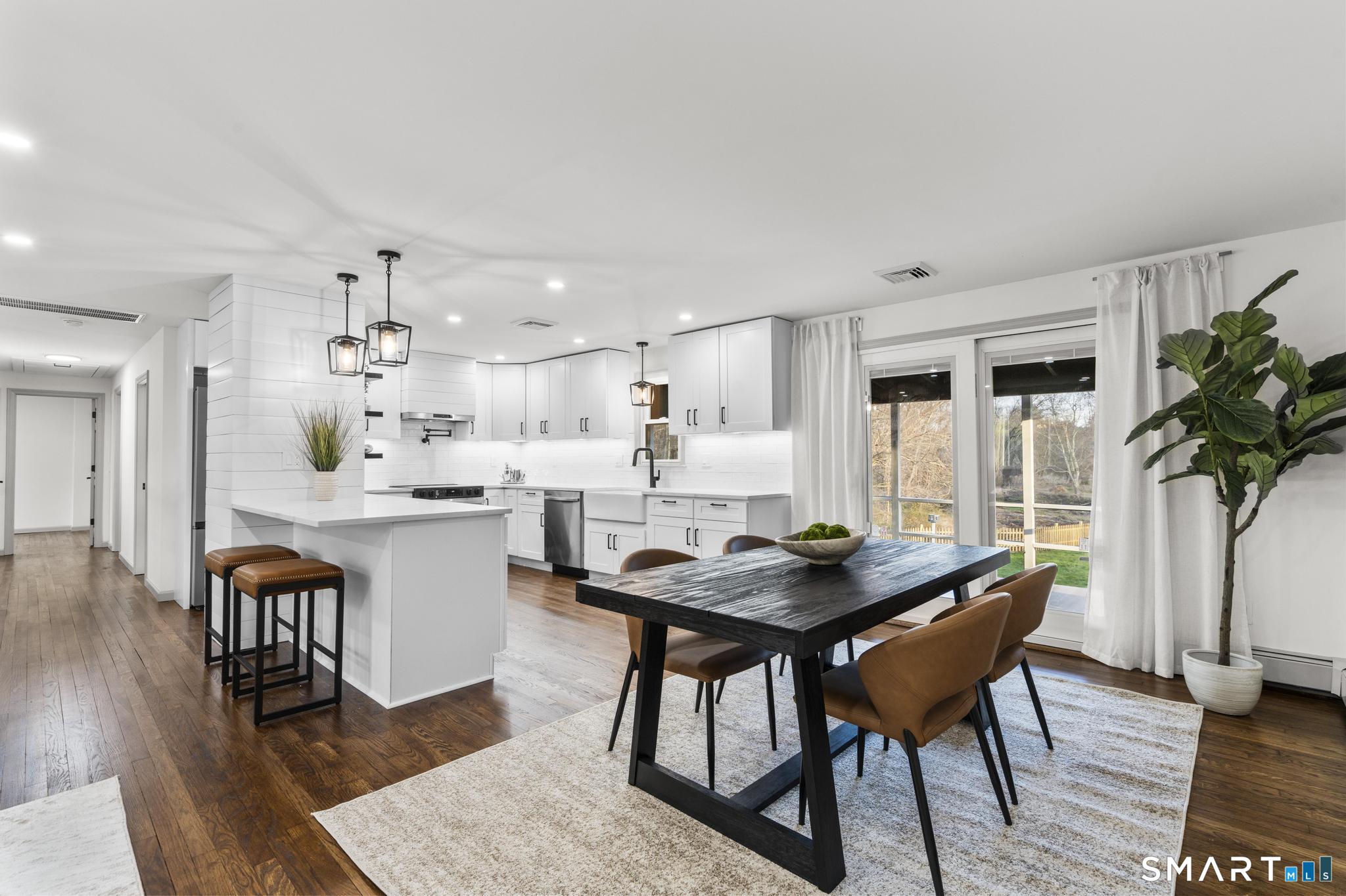 Completely reimagined from the studs up, this 4-bedroom, 3-bathroom raised ranch in the heart of Huntington Center delivers the rare combination of brand-new finishes and real livable space on nearly one acre. The open-concept main level features hardwood floors, a kitchen with quartz countertops, shaker cabinetry, stainless steel appliances, subway tile backsplash, and shiplap accents - all flowing seamlessly into the living and dining areas. Major updates include new windows, new siding, a new central air system, all-new plumbing for the kitchen and bathrooms, a fully rebuilt porch staircase, new fencing around the entire property, and a new roof on the oversized shed. Step out to an oversized screened porch with a hot tub overlooking the fully fenced, level backyard backing to a peaceful brook and mature tree line. The lower level offers a legal in-law suite with its own full kitchen, bedroom, and full bathroom - ideal for extended family, guests, or supplemental income. Located steps from the Shelton Rec Path walking trail and minutes from the historic Huntington Green, Brownson Country Club, Huntington Plaza shopping, and major commuter routes. Nothing to do here but move in.