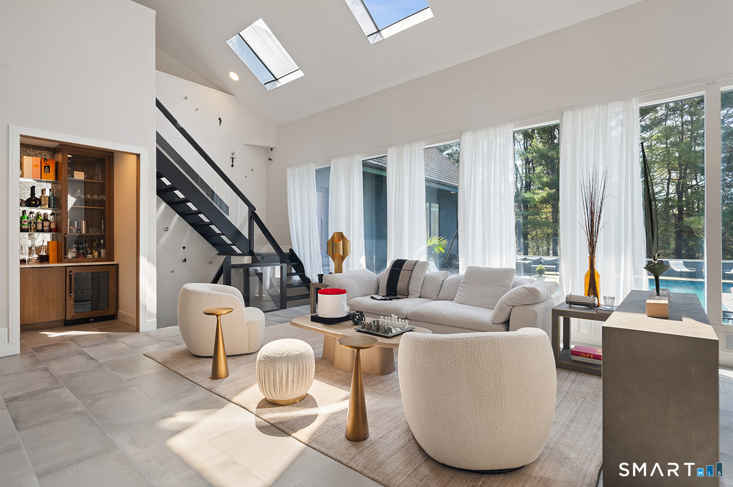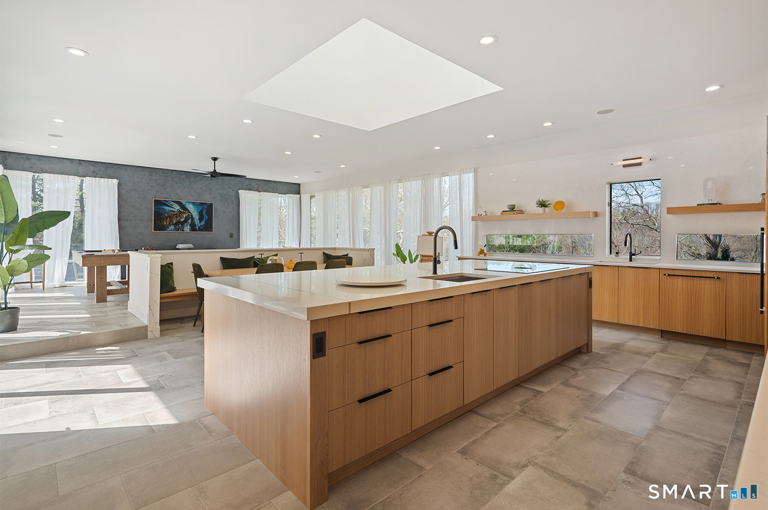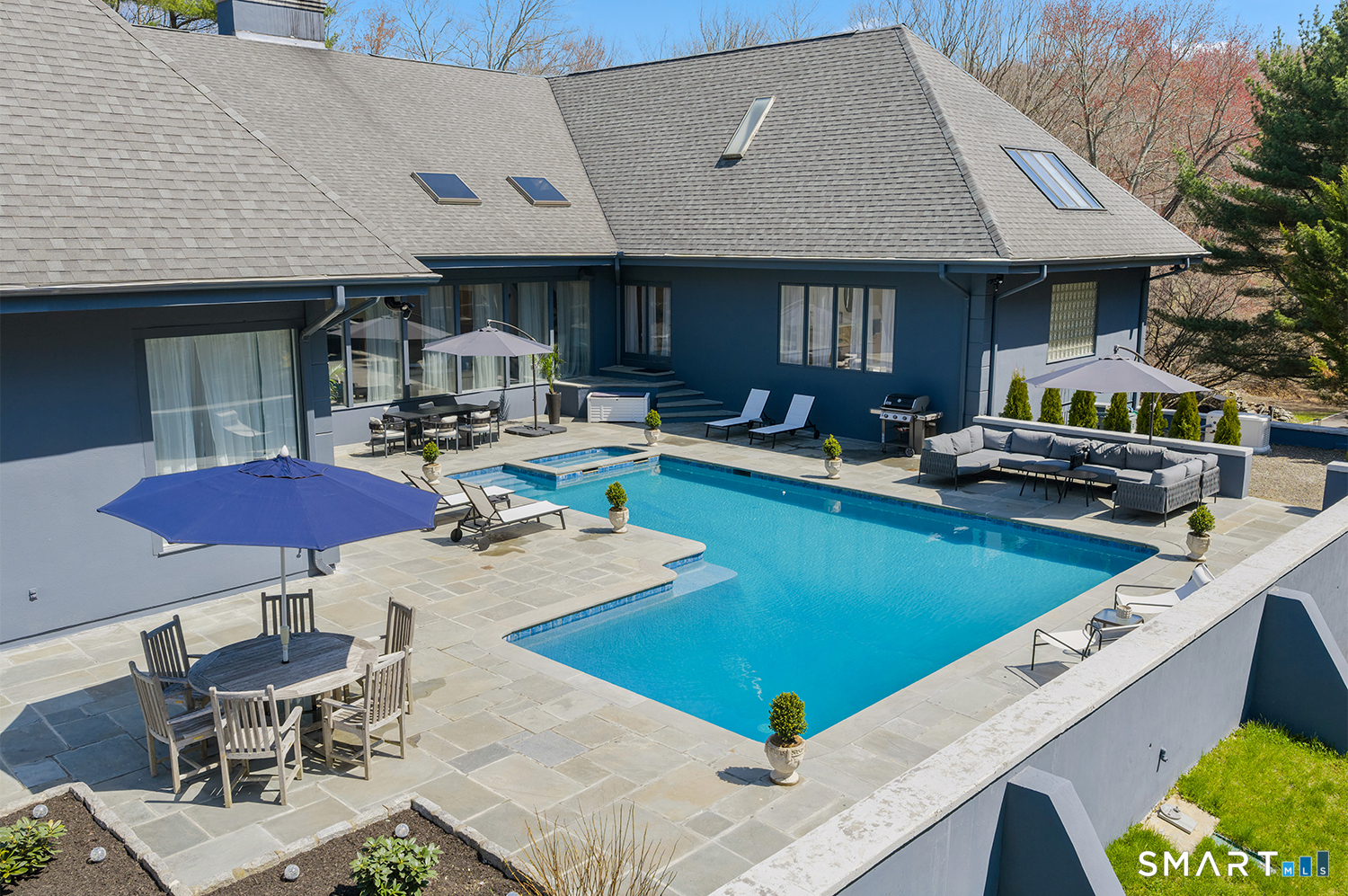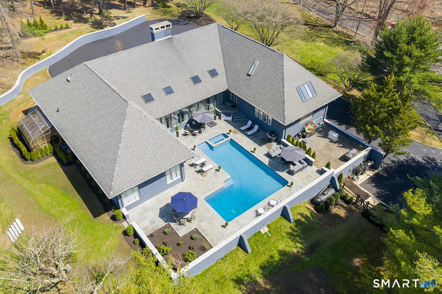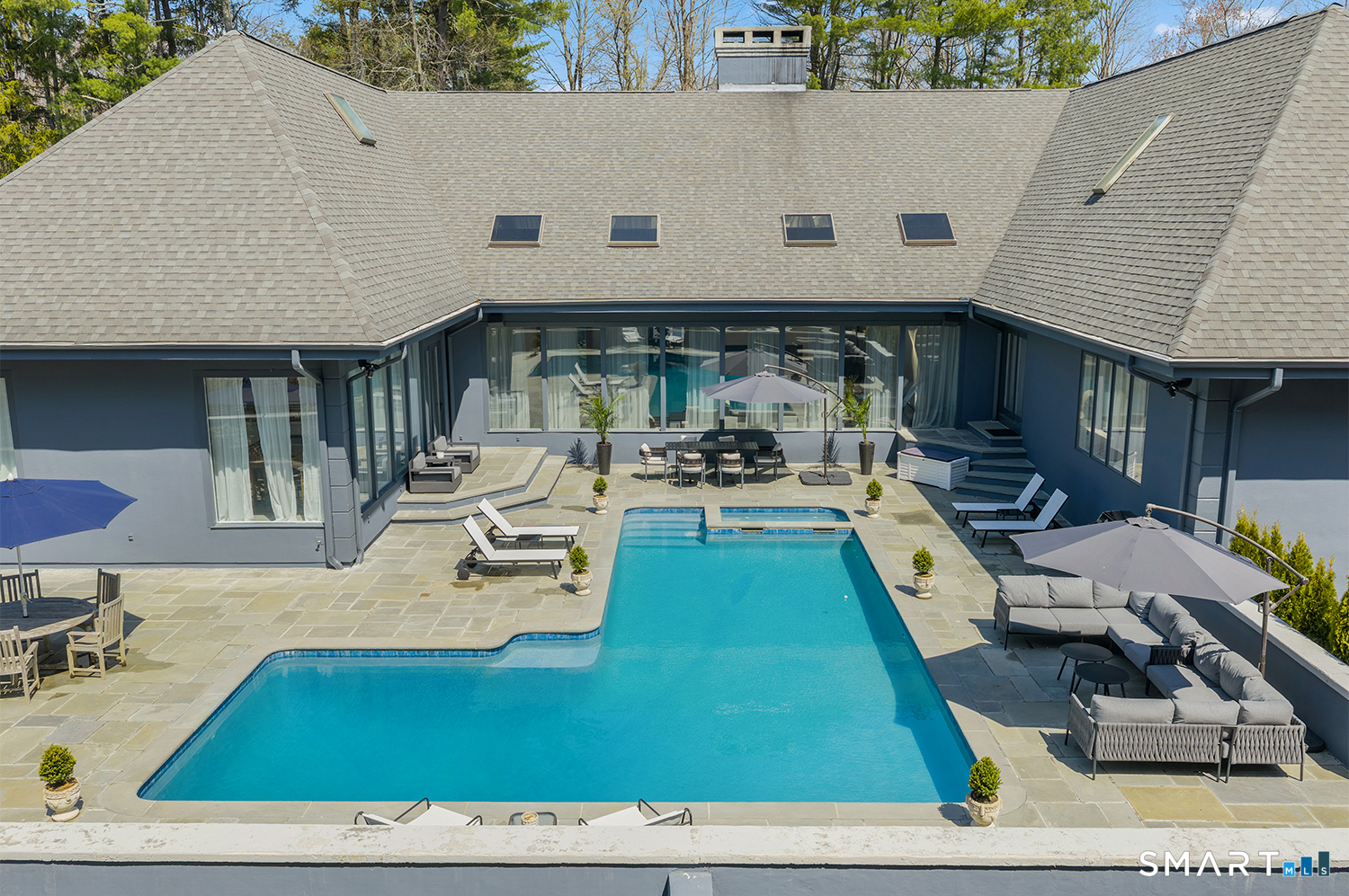 Greenwich address, Stamford taxes & schools. Behind a private, tree-lined driveway on 2 beautifully landscaped acres, this exceptional backcountry compound offers over 6,300 SF of sun-filled, single-level living at a scale rarely achieved in today's market, centered around a resort-scale gunite pool, spa, & sweeping bluestone terrace designed for seamless indoor-outdoor living. Walls of glass, skylights, & soaring cathedral ceilings create a sanctuary of proportion rarely found in single-level homes. Comprehensively renovated in 2026, the home features a custom rift-cut white oak kitchen anchored by a dramatic 6' x 12' island, complemented by designer baths, new flooring, roof, driveway, stonework, & curated landscaping throughout. The approximately 1,200 SF primary suite opens directly to the pool & offers a spa-inspired bath, infrared sauna, & steam shower. 2 additional en-suite bedrooms anchor the main residence. A fully self-contained residence within the home-featuring 2 bedrooms, full bath, living room, dining area, kitchenette, separate entrance, & independent HVAC & security-offers exceptional flexibility for extended family, live-in staff, or long-term guests. 5 bedrooms & 4.5 baths. Additional highlights incl 3 fireplaces, wet bar, 5-zone integrated surround sound, whole-house generator, & oversized 4-car garage. An additional 5,400+ SF lower level with fireplace & wine storage offers exceptional potential for future build-out.