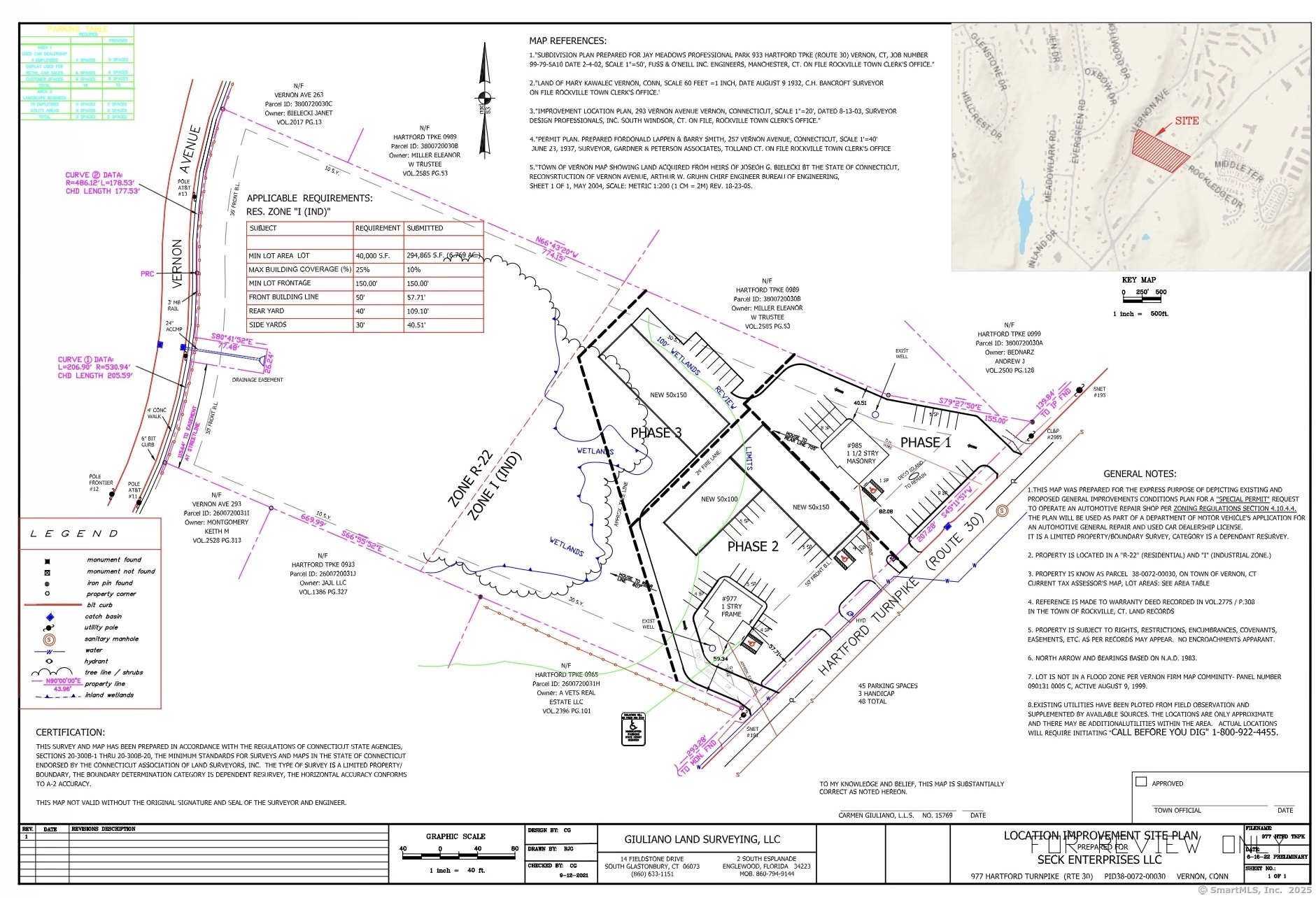 Excellent opportunity for a land lease or joint venture development along well-traveled Route 30 (Hartford Turnpike) in Vernon, Connecticut. Located at 985 Hartford Turnpike, this versatile property offers flexible acreage options within a larger 9.1-acre site. The front portion of the property is zoned Industrial (I) and is well suited for truck or equipment parking, landscaping operations, contractor use, or other light industrial applications. The rear portion of the property along Vernon Avenue is zoned R-22, presenting a strong opportunity for a residential development partner to create new housing. The amount of land available and lease terms are fully negotiable, and ownership is open to long-term ground leases or joint venture partnerships for qualified users or developers. Conveniently located minutes from I-84, this site offers strong visibility, dual road access, and excellent regional connectivity to Hartford, Manchester, and Tolland County-making it an ideal setting for commercial or residential development in a high-demand market.